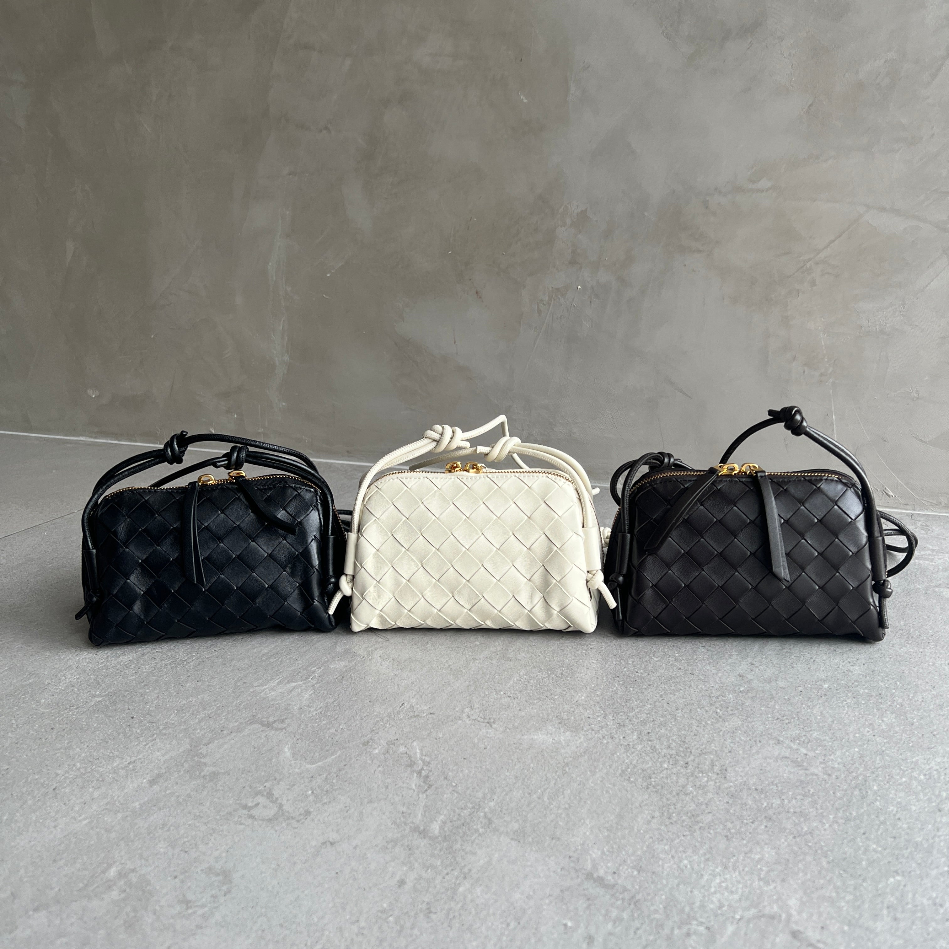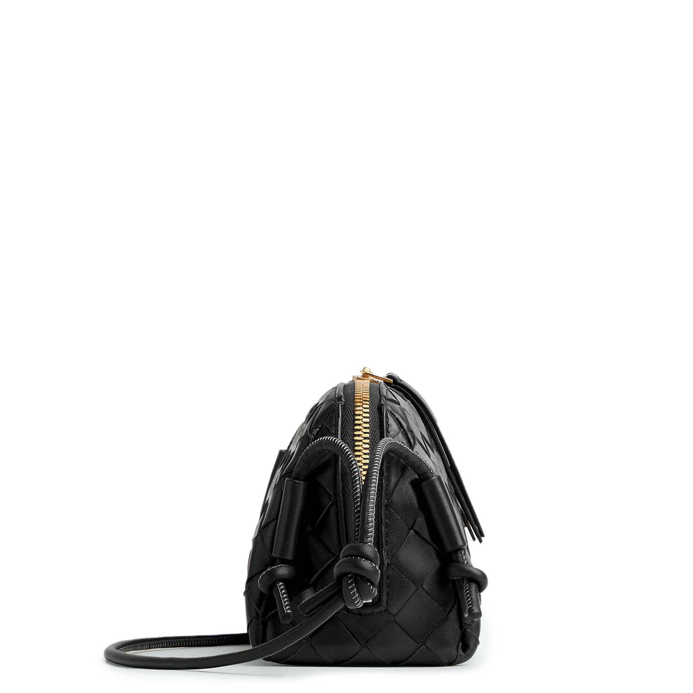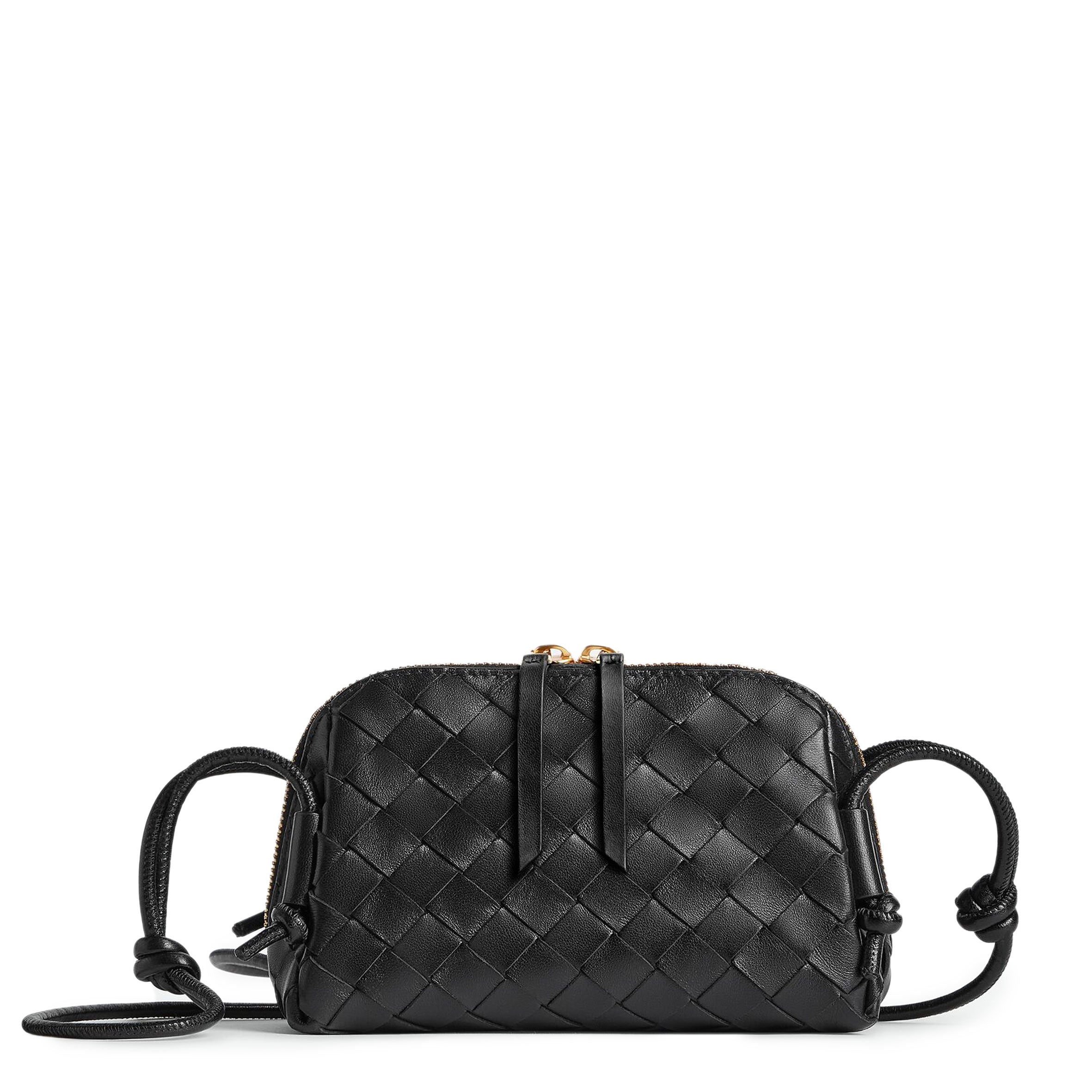 Bottega Veneta's Concert bag is woven in the designers distinguishable intrecciato weave. This crossbody bag has a soft edge triangular shape crafted from lamb leather and features double knotted side details on the adjustable tubular strap and zip top closure.