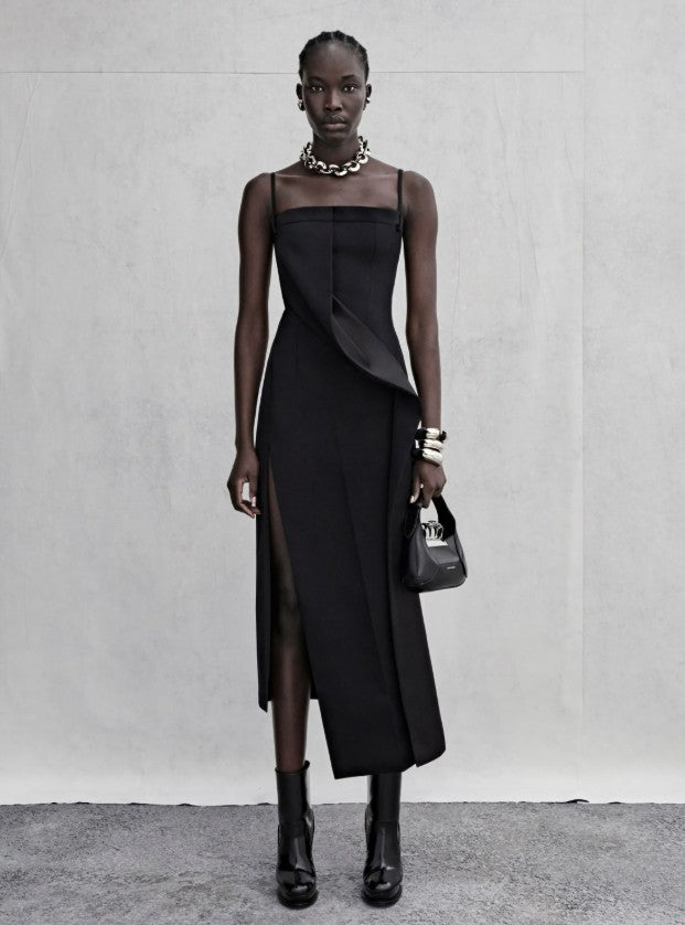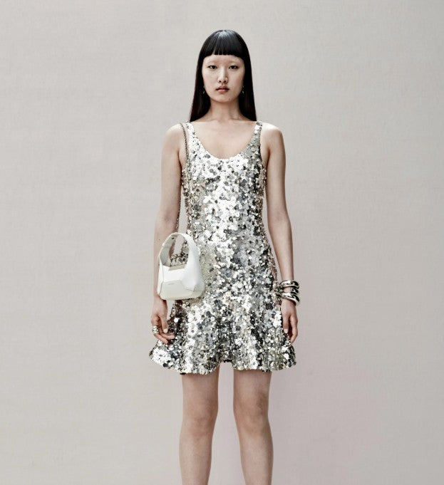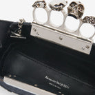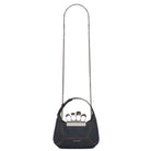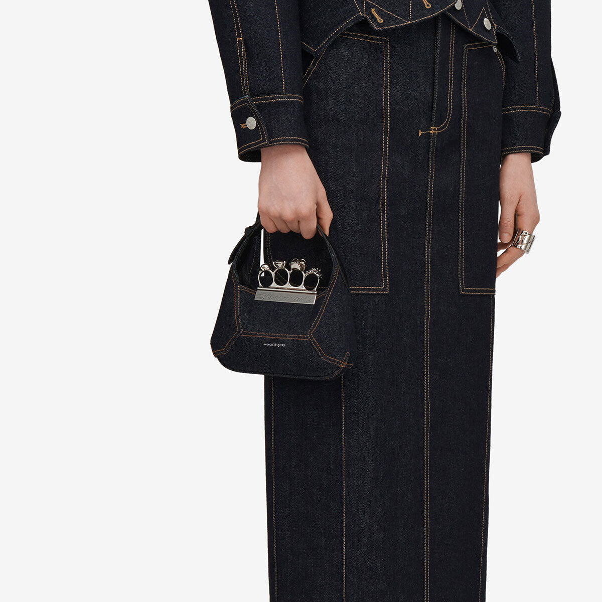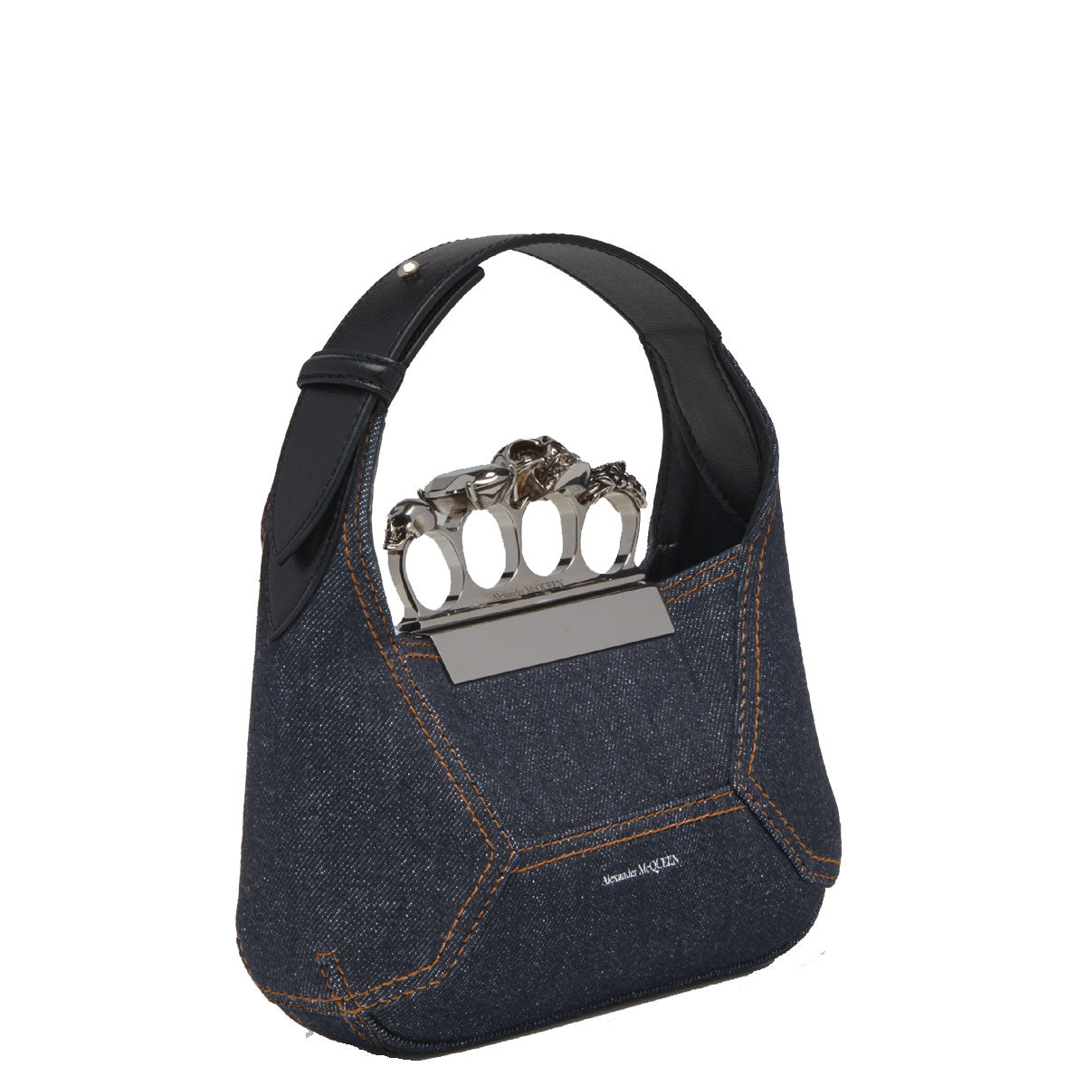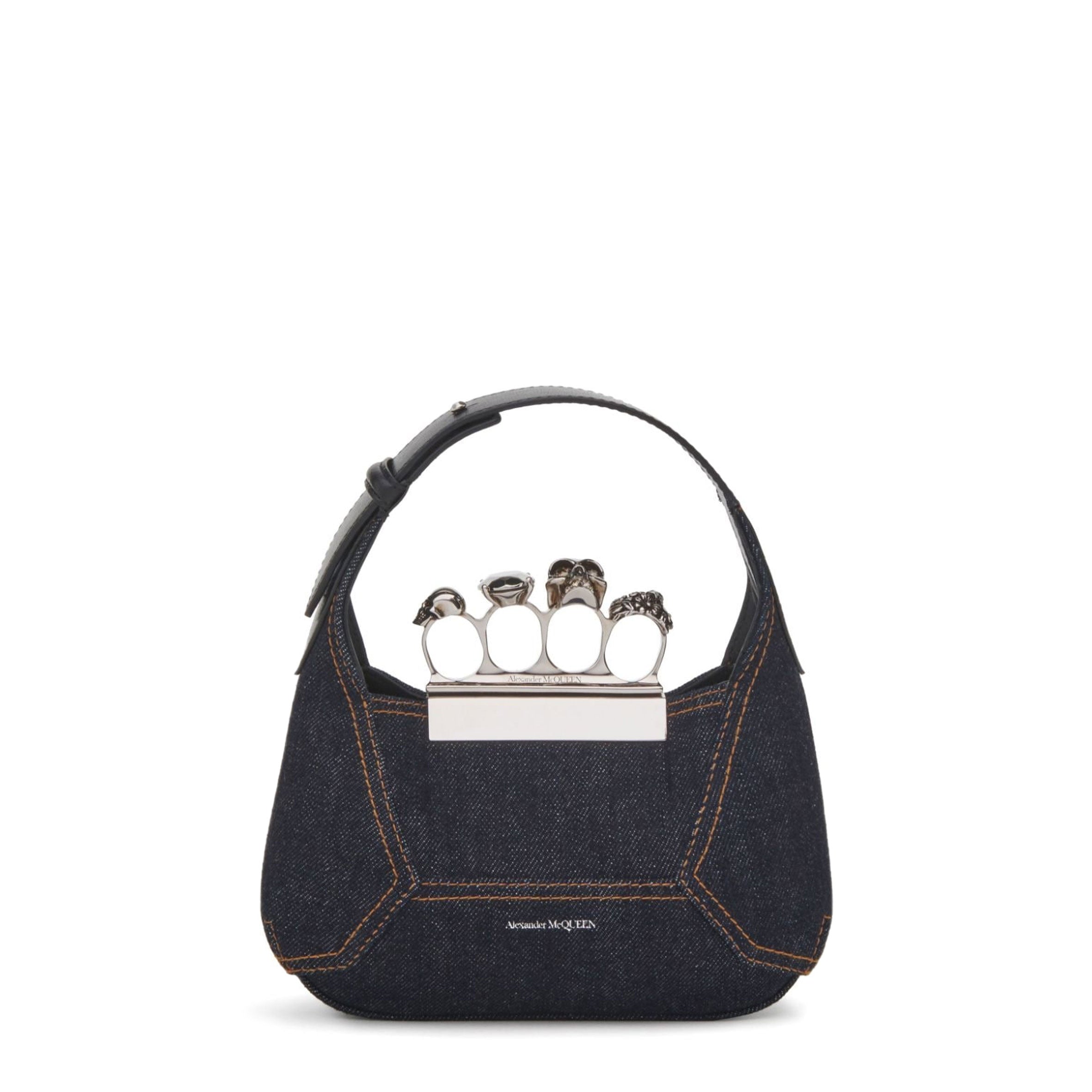 Blue denim Jewelled Hobo Mini with contrasted colour stitching, featuring an antique silver-finished handle adorned with Swarovski-encrusted rings. The unique silhouette of the Jewelled Hobo is inspired by the faceted stone that sits on the Knuckle, and features cotton panels that are cut and re-assembled together. This bag can be worn either hand-held or over the shoulder or across the body with its detachable chain.