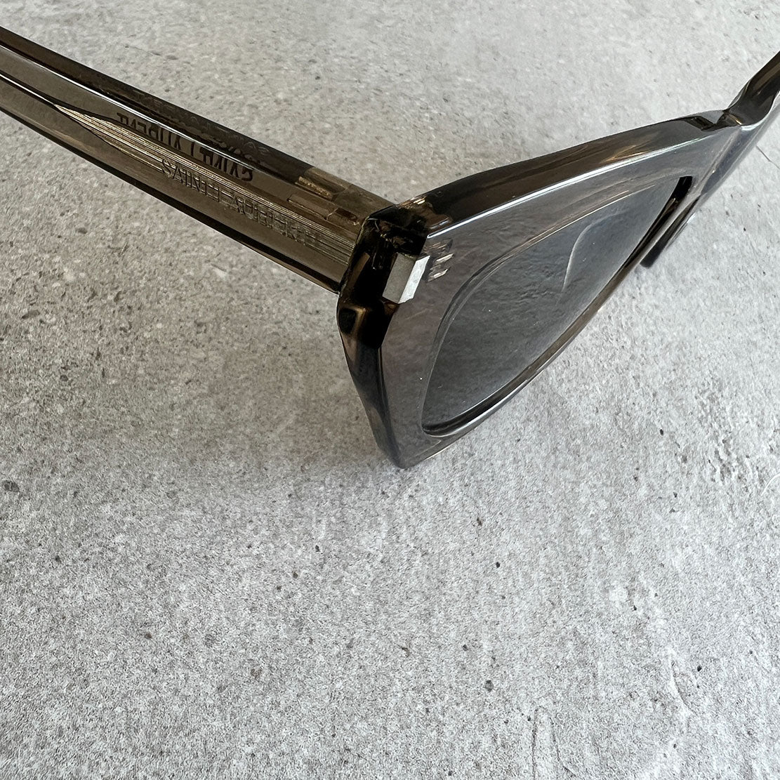 Thick-framed clear cat eye sunglasses featuring nylon lenses. Saint Laurent signature engraved arms. Frames are compatible with prescription lenses.