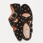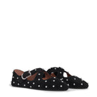 Signature Alaïa criss cross ballet flats inspired by classical Japonese shoes featuring a cross buckle straps. Crafted in suede calfskin leather adorned with demi-sphere studs.