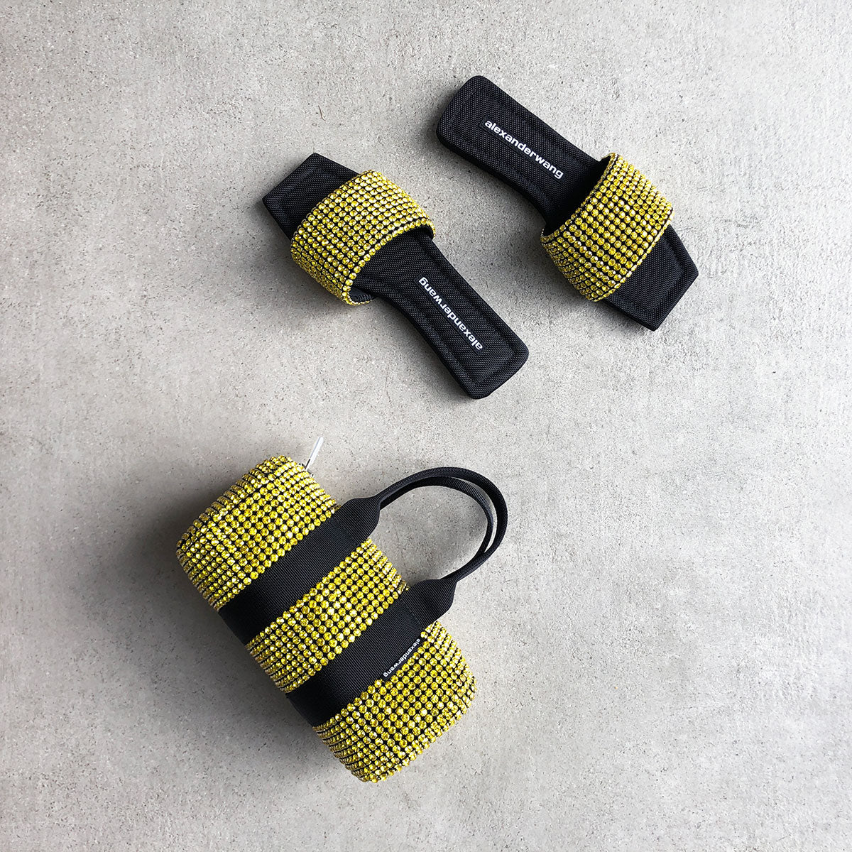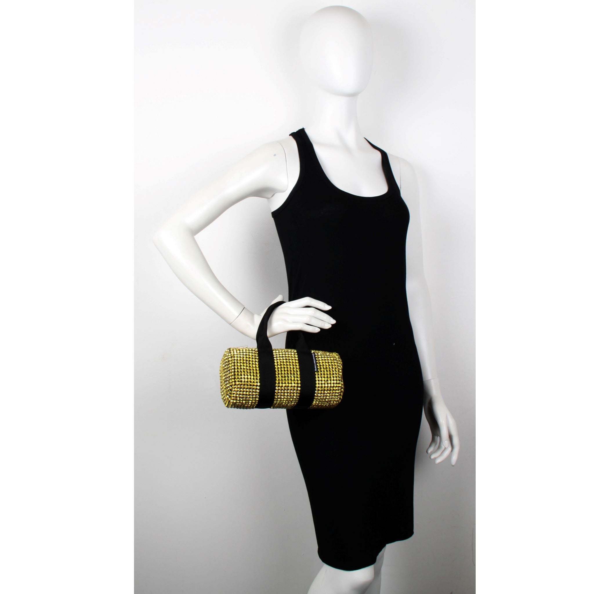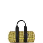 An all over crystal embellished mini duffel with webbed nylon top handles and logo flag tag. Features a metal top zip closure and polyester jacquard logo lining.