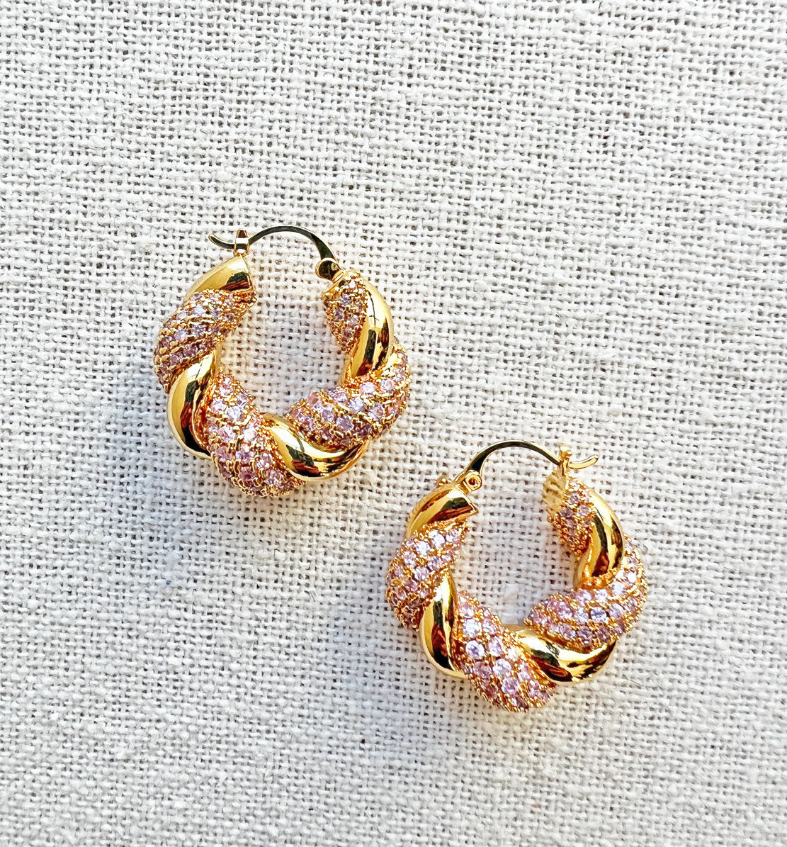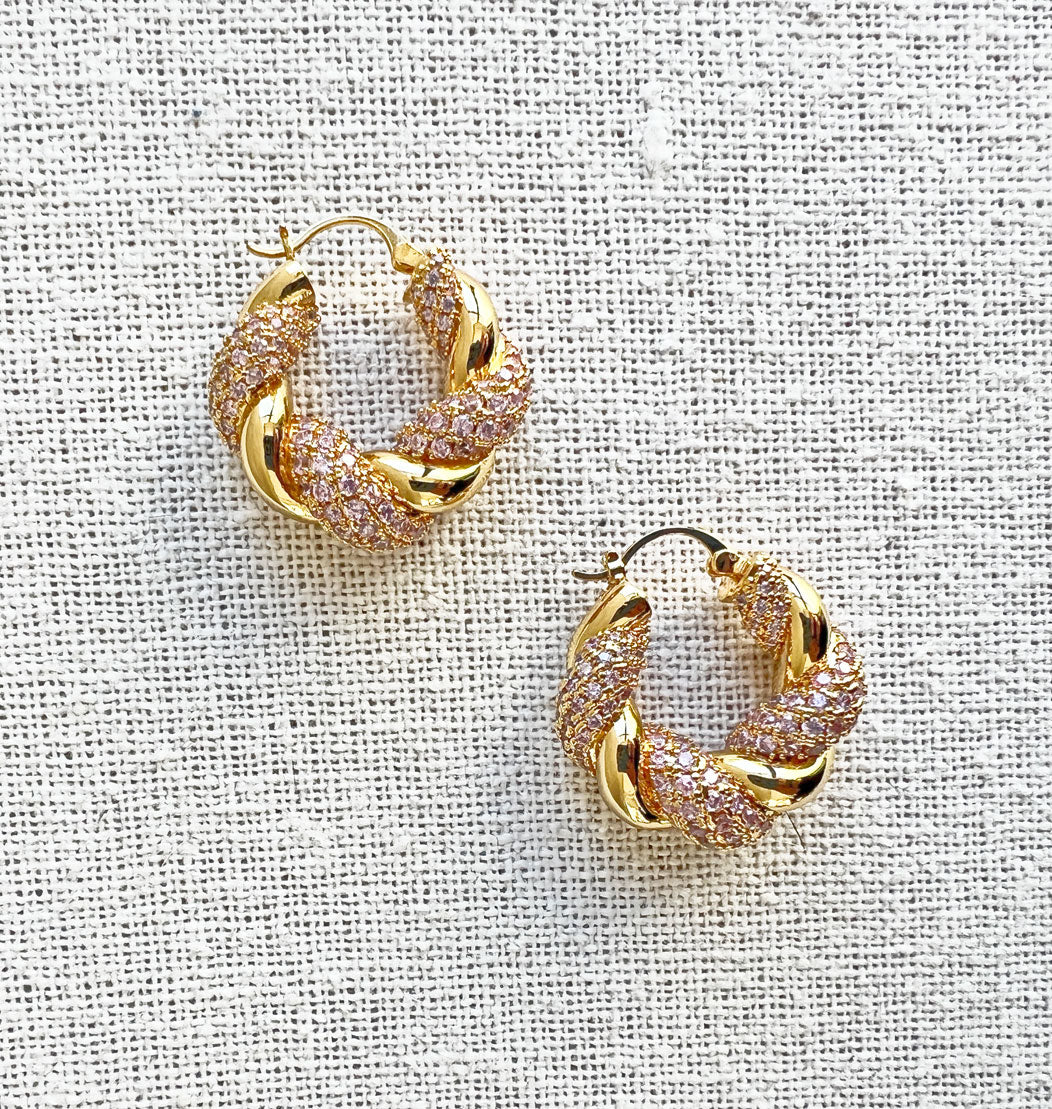 Croissant Hoops with pink cubic zirconia by Crystal Haze.