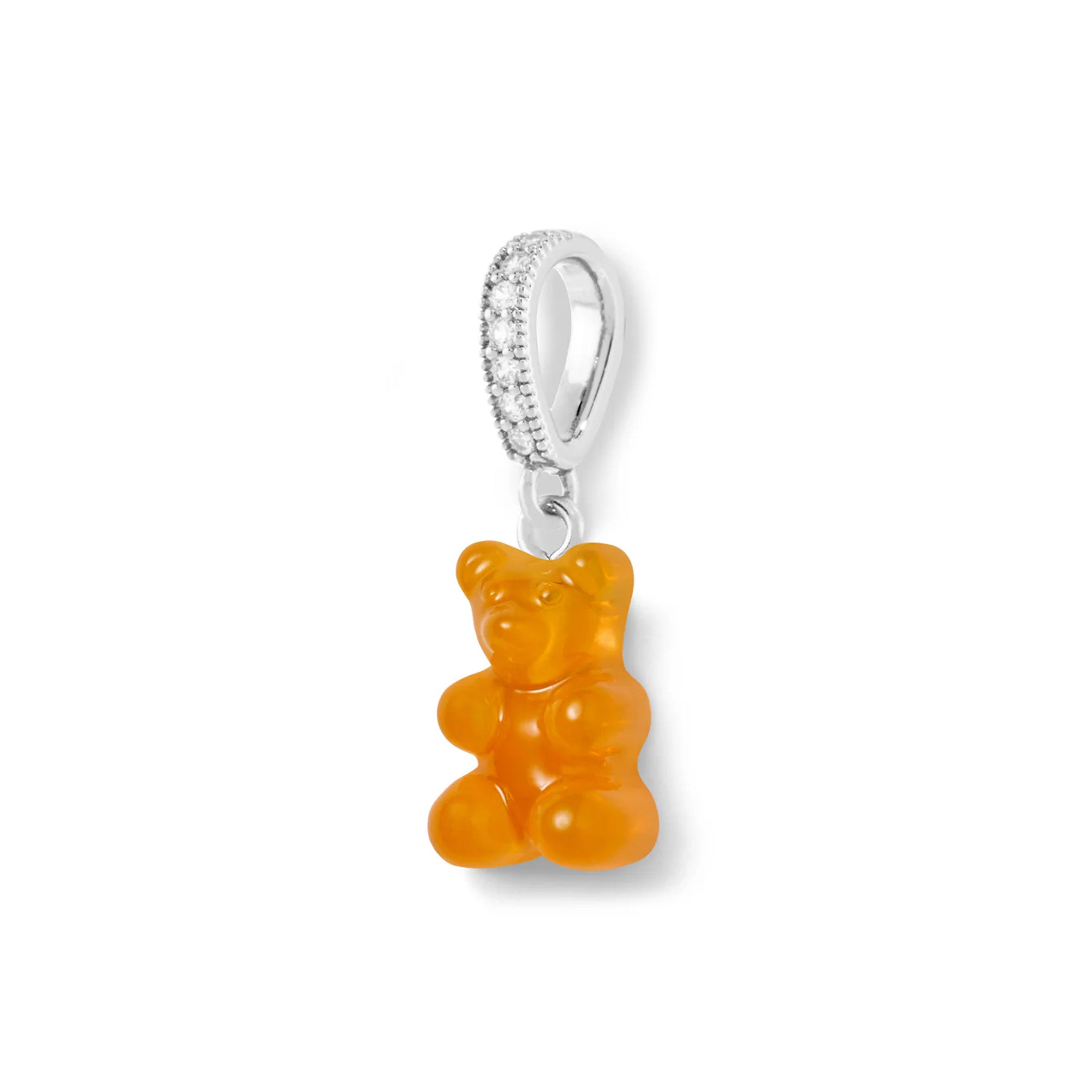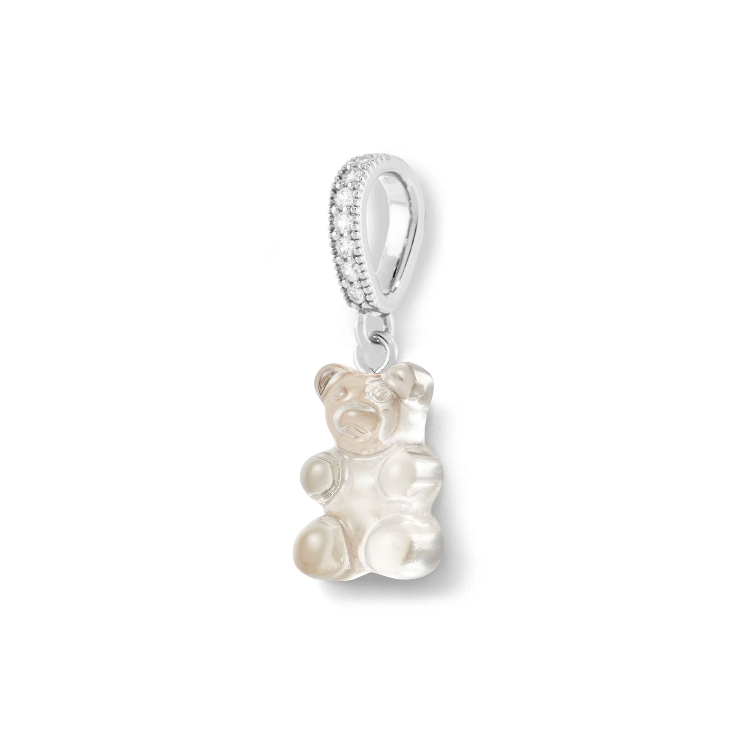 Signature Nostalgia bear in glossy resin finish with silver plated pave connector.