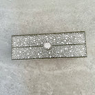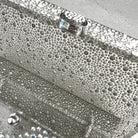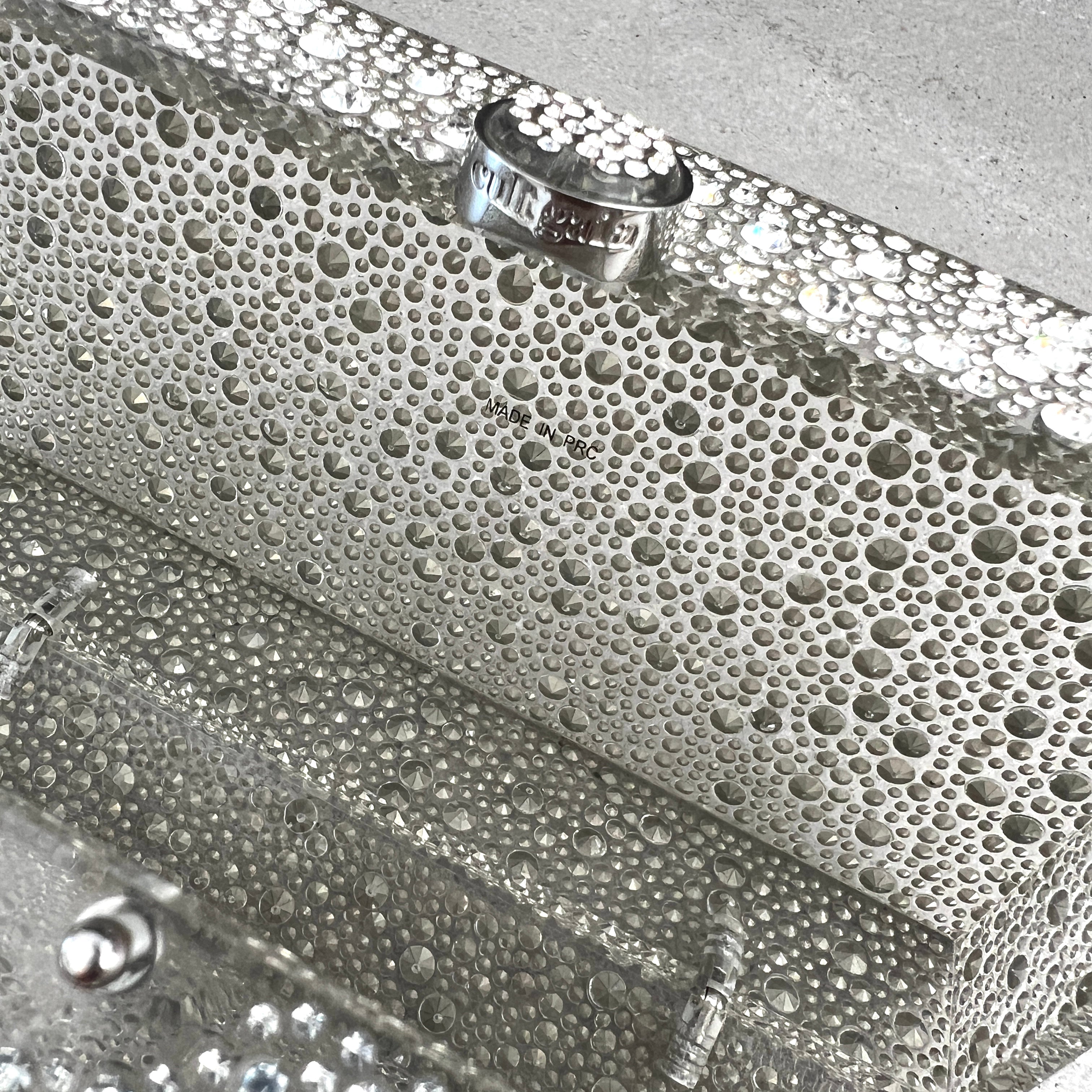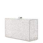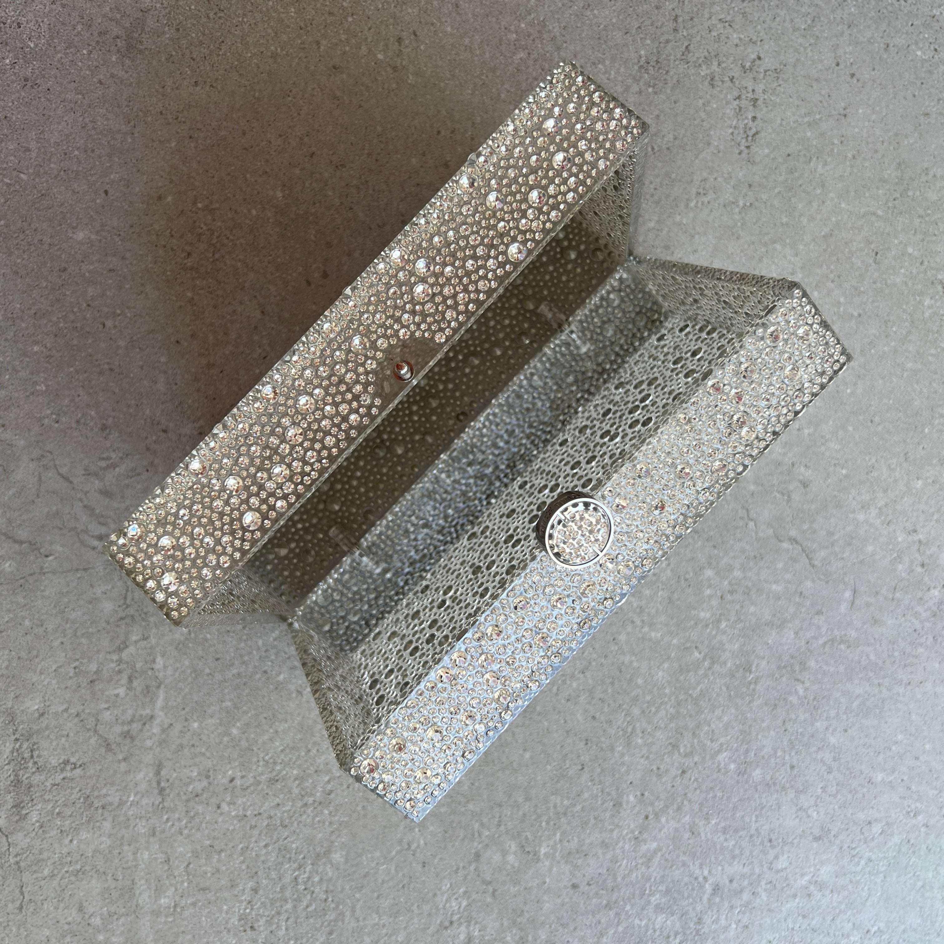 A rectangular crystal embelished acrylic clutch with a top closure.