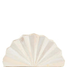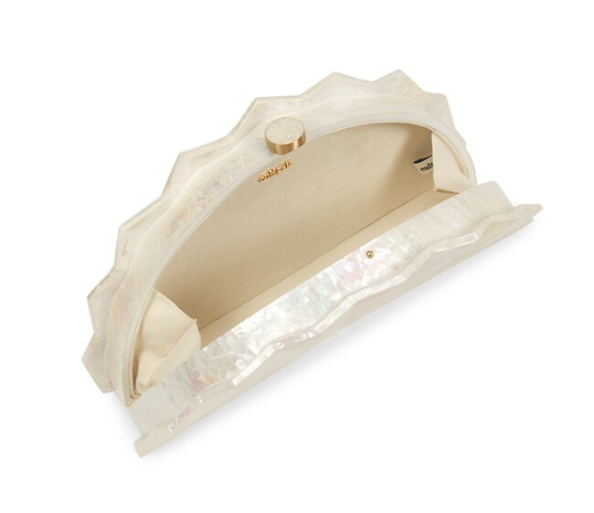 Crafted from authentic Mother of Pearl, the Esme Clutch has a beautiful shell-like fan silhouette. This sculptural piece is meant to make you look twice. It closes with our signature spring clasp and features our logo plaque inside the bag. Sized to fit the essentials, your phone and lip gloss.