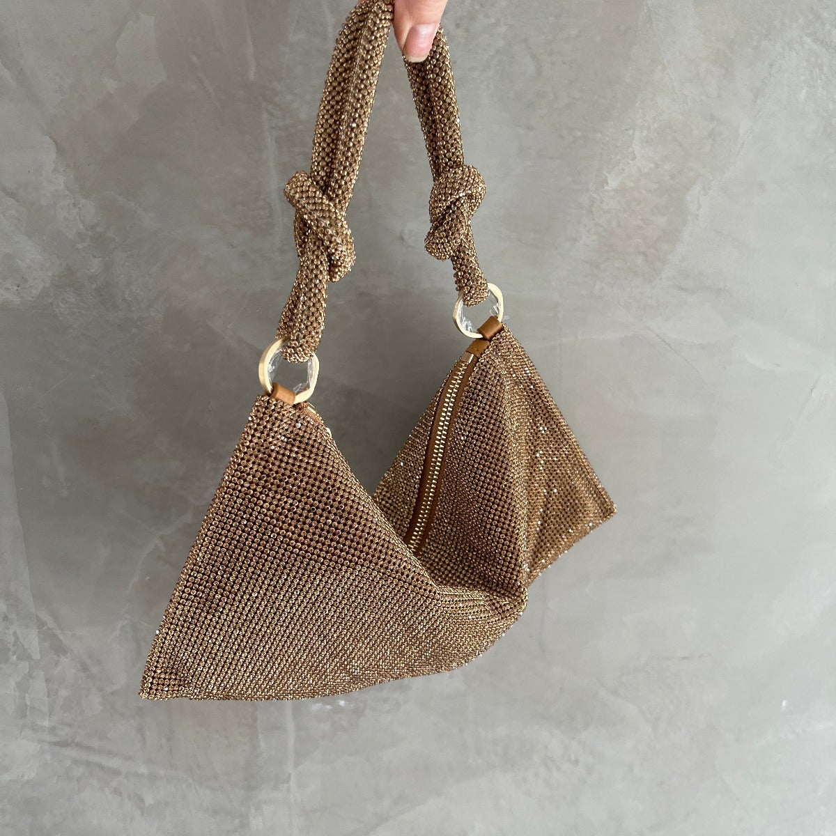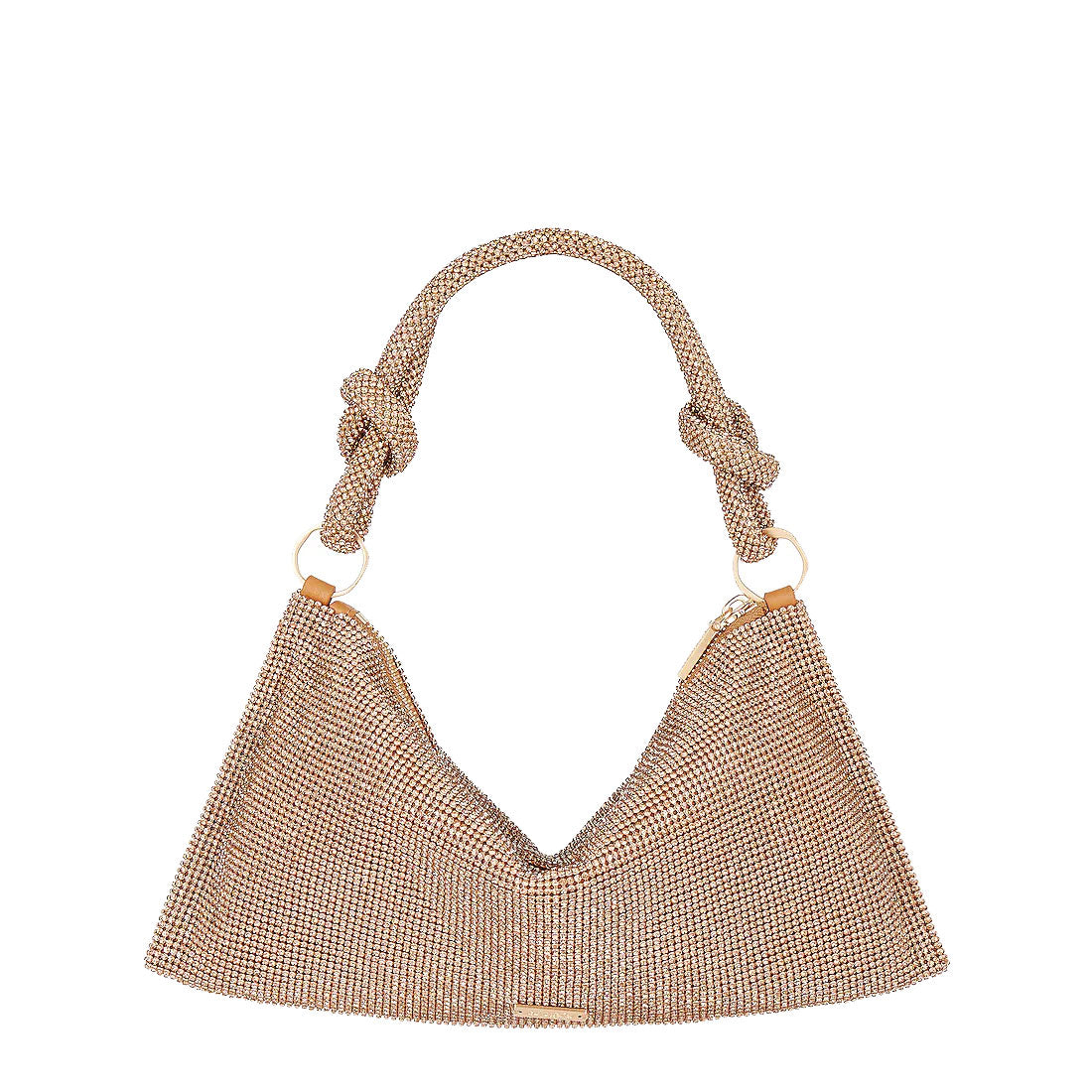 The Hera Shoulder, now available in an even smaller Nano. Crafted from eye-catching rhinestone that give a metallic silver shine, this classic design exudes femininity and grace with a knotted shoulder strap and a gorgeously slouchy silhouette. The frosted handheld bag is the perfect addition to add some Gaia sparkle to your life. Please note this size is much smaller than the Mini.