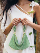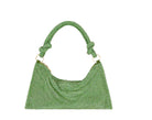 The Hera Shoulder, now available in an even smaller Nano. Crafted from eye-catching rhinestone that give a metallic silver shine, this classic design exudes femininity and grace with a knotted shoulder strap and a gorgeously slouchy silhouette. The frosted handheld bag is the perfect addition to add some Gaia sparkle to your life. Please note this size is much smaller than the Mini.