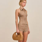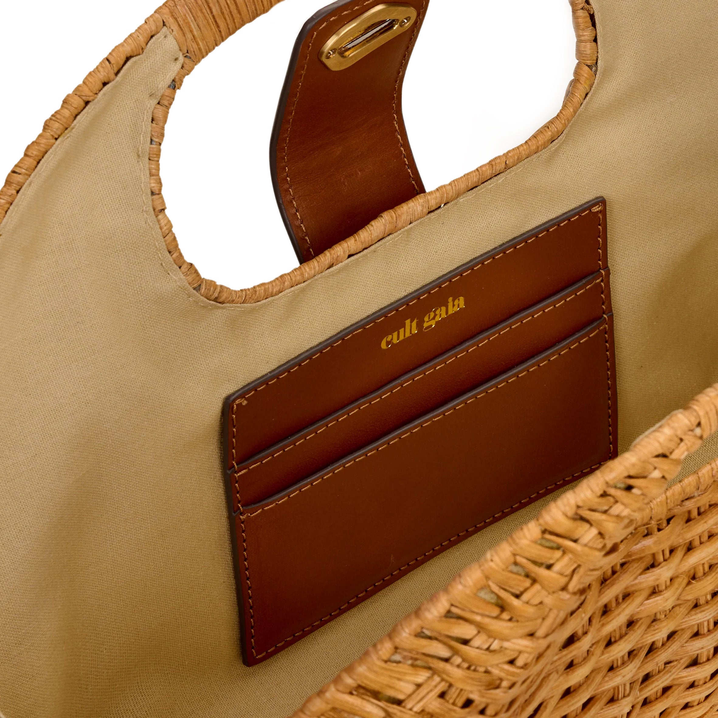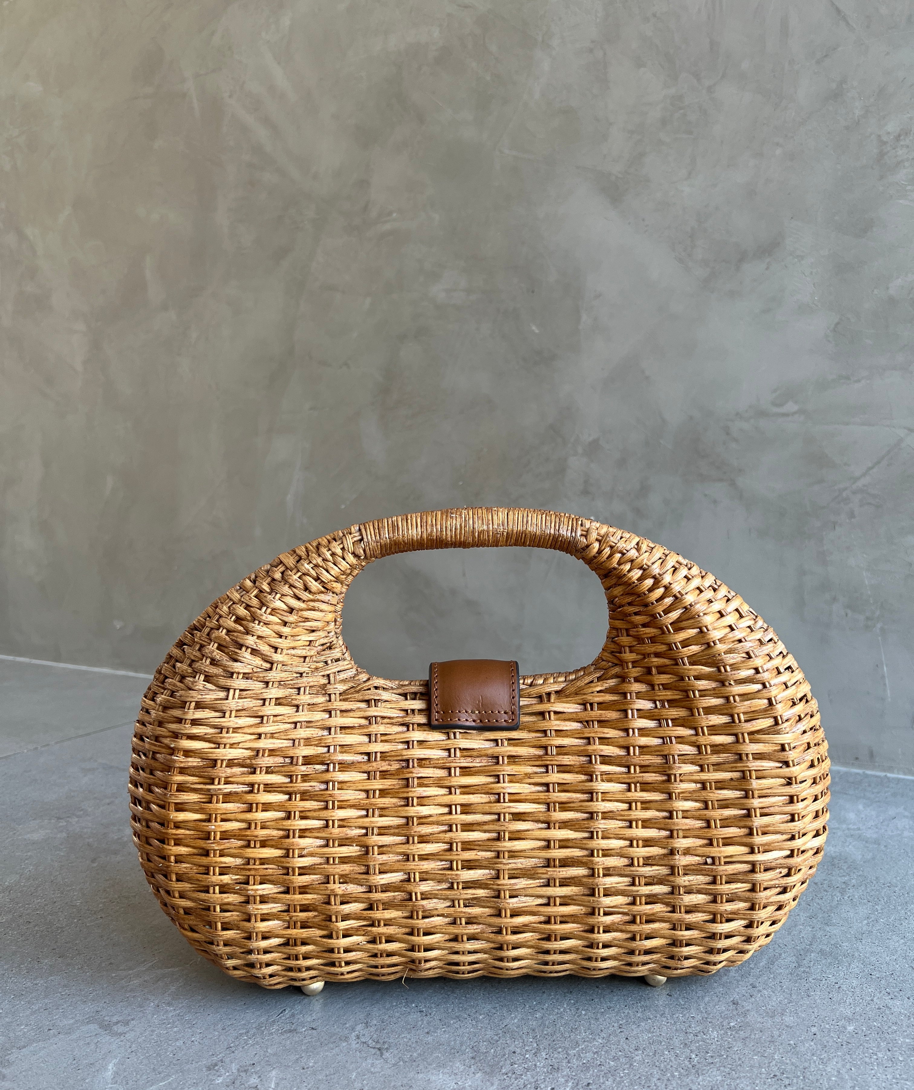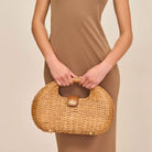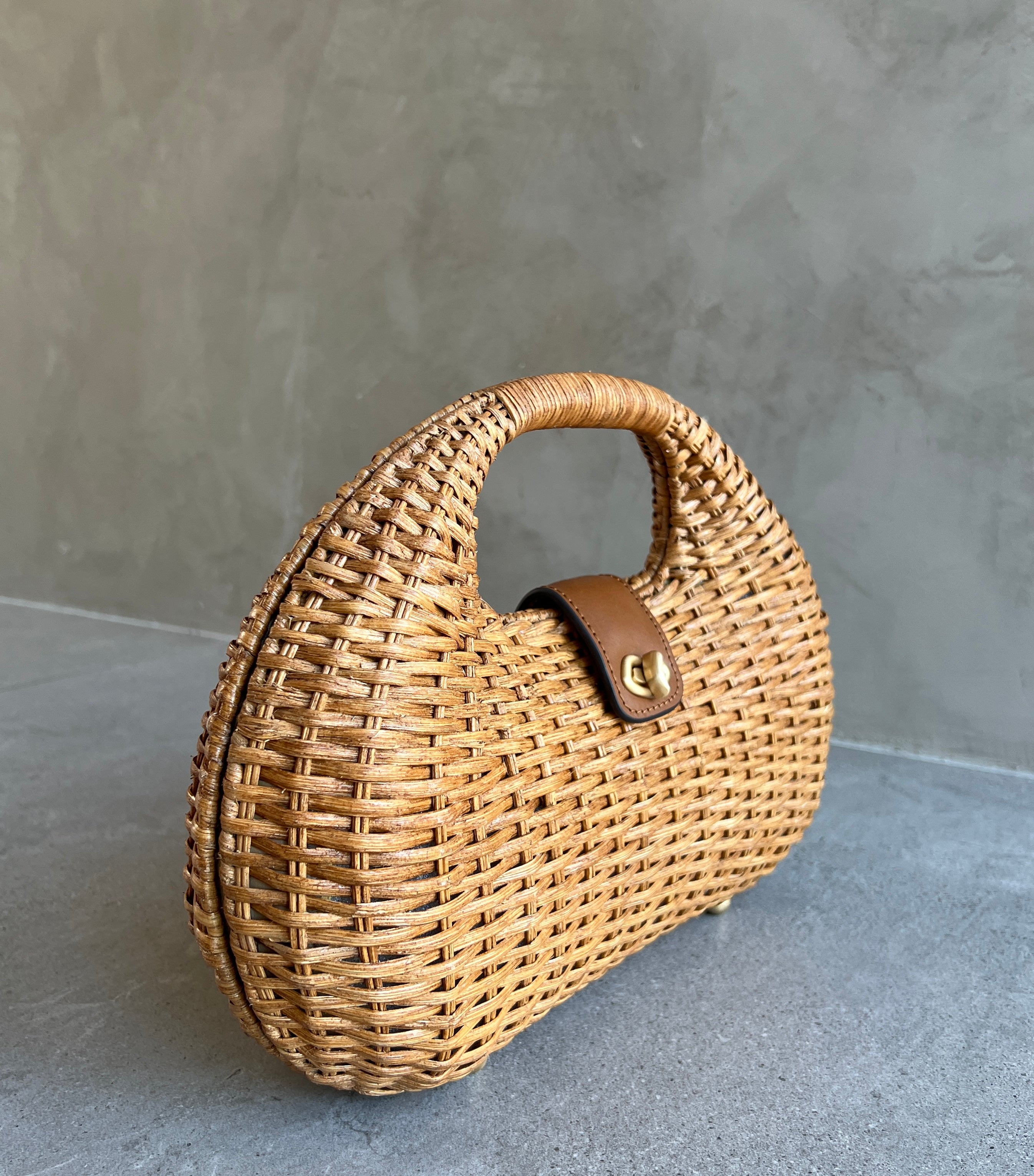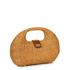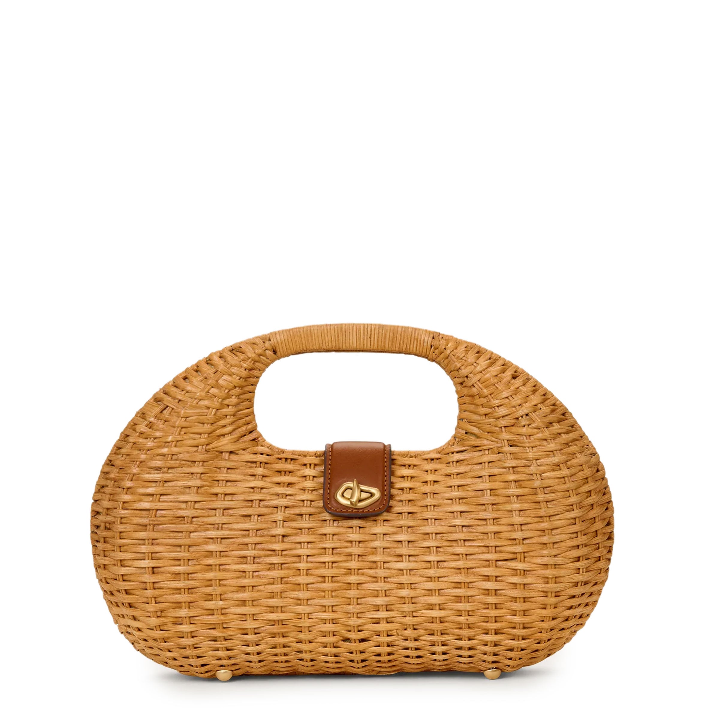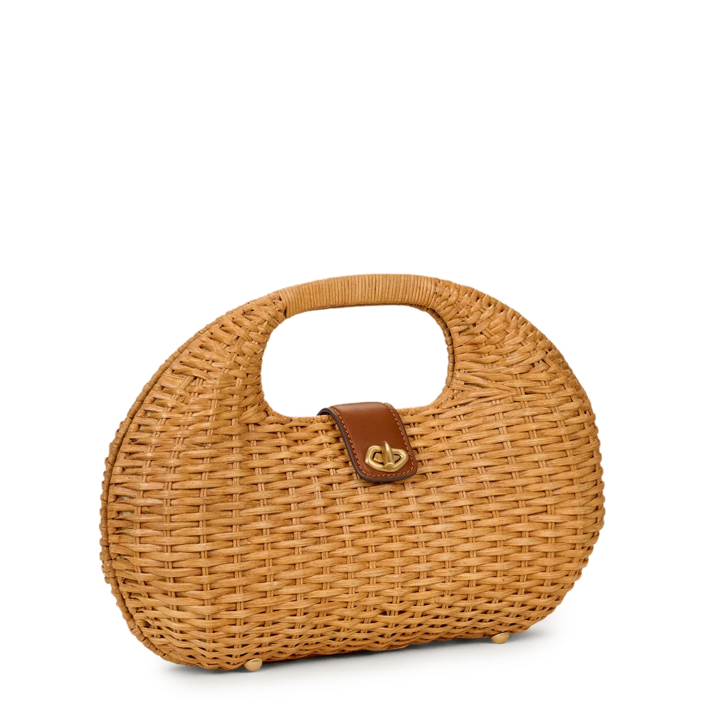 Lydia top handle bag in woven rattan featuring turn lock detail.
