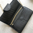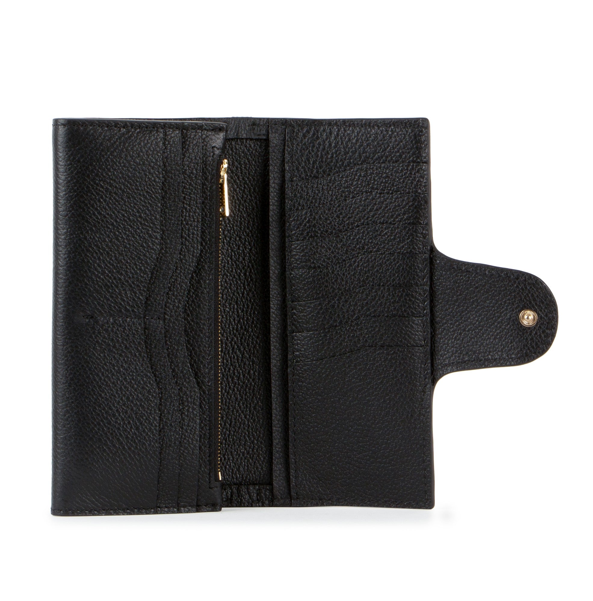 Simplicity speaks volumes when it comes to our Flip N Snap Maxi wallet. Spacious and secure, our Flip N Snap Maxi is landscape in design, and finished in sumptuous Bovine leather with solid brass hardware. A press stud closure secures thirteen card slots, three bill compartments and a zipped coin pocket. Our Flip N Snap Maxi features leather tabs for optiop to add an addition of a brass chain (sold separately) so you can choose how you wish to wear it. Designed to hold a phone with ease and without strain.