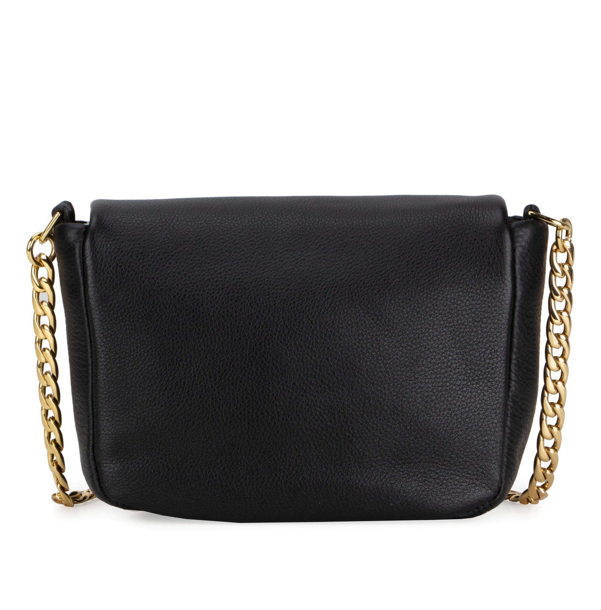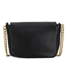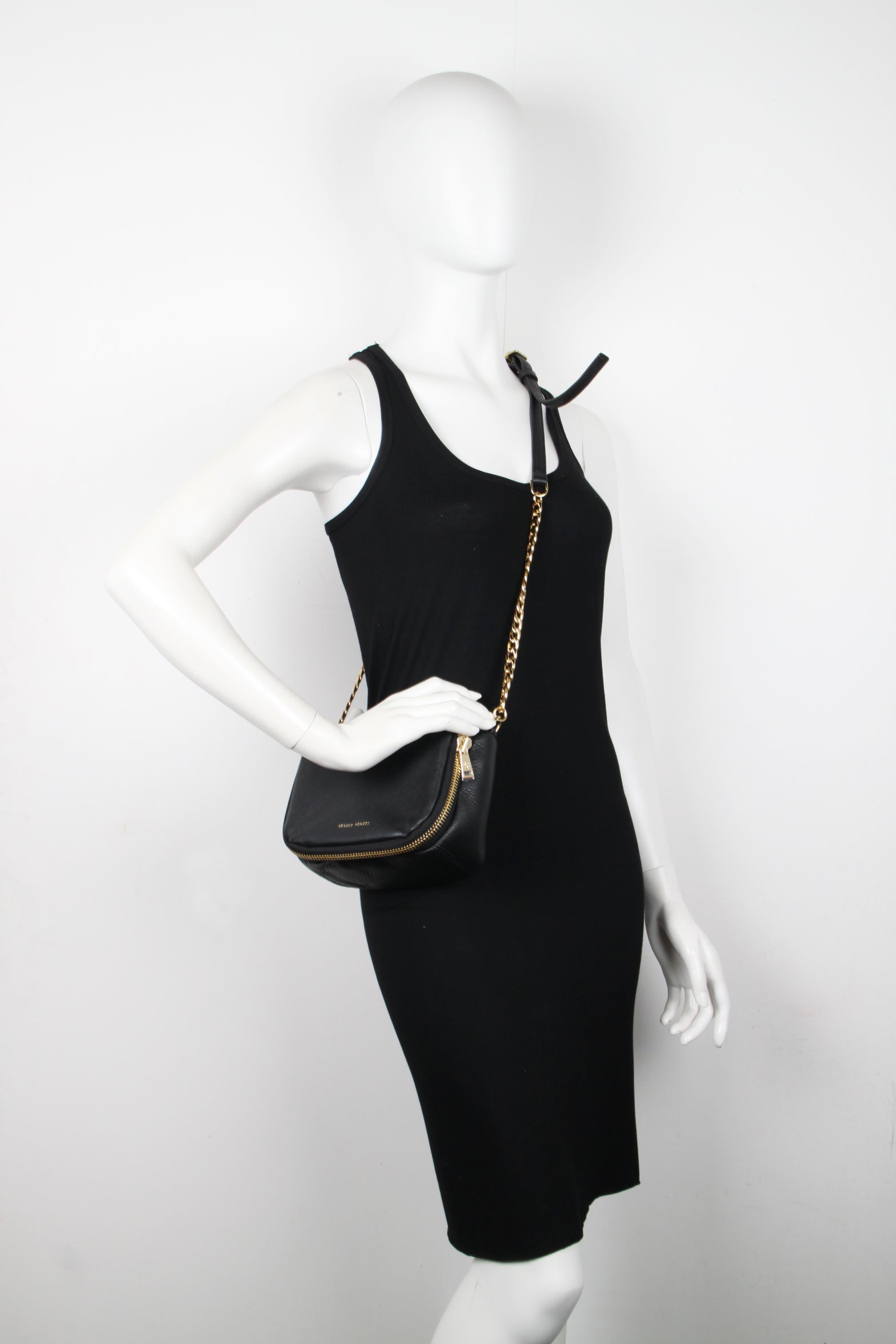 Soft deer skin shoulder pouch with a zipper flap, an interior pocket and adjustable leather and brass chain strap.