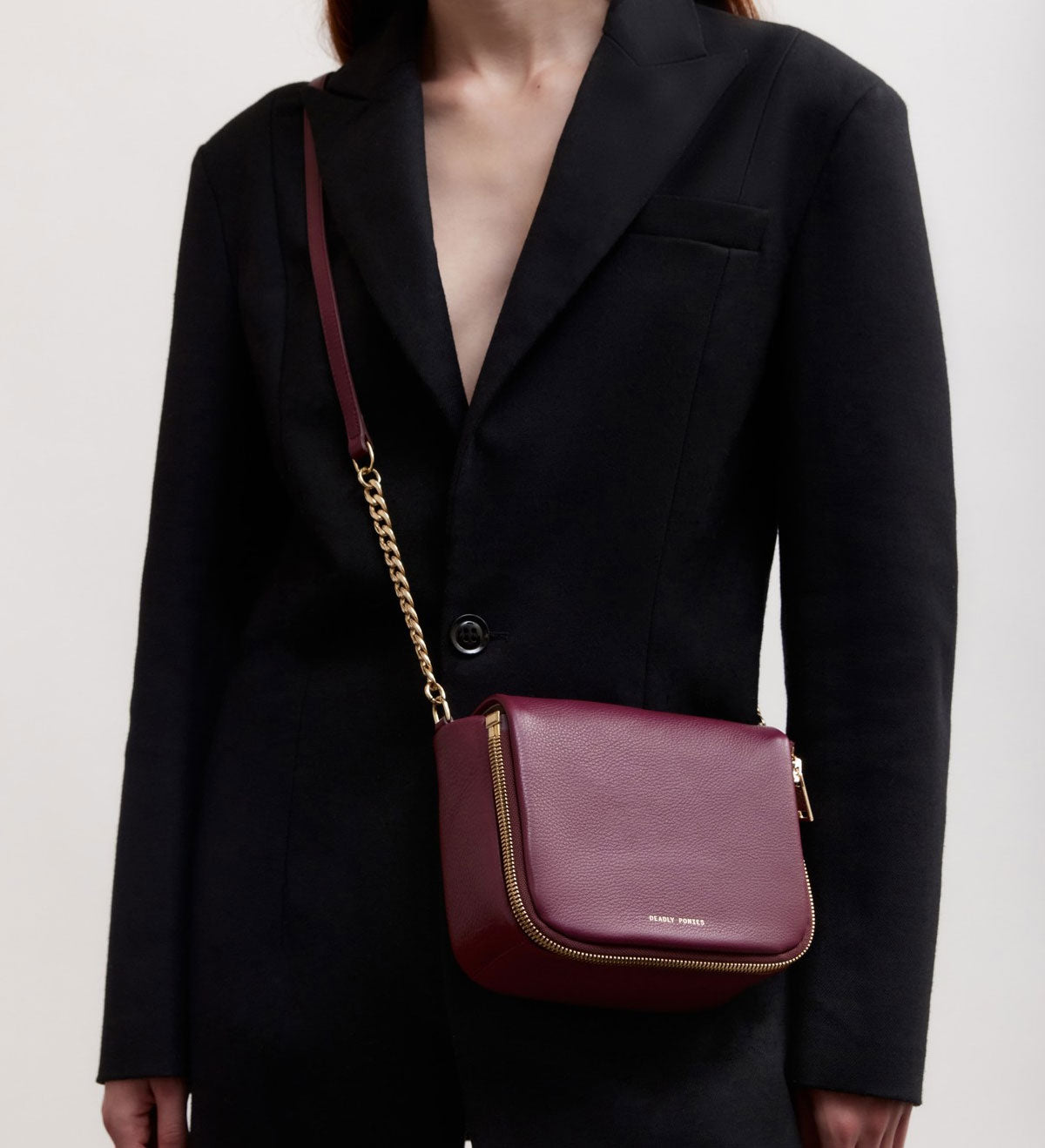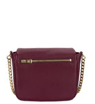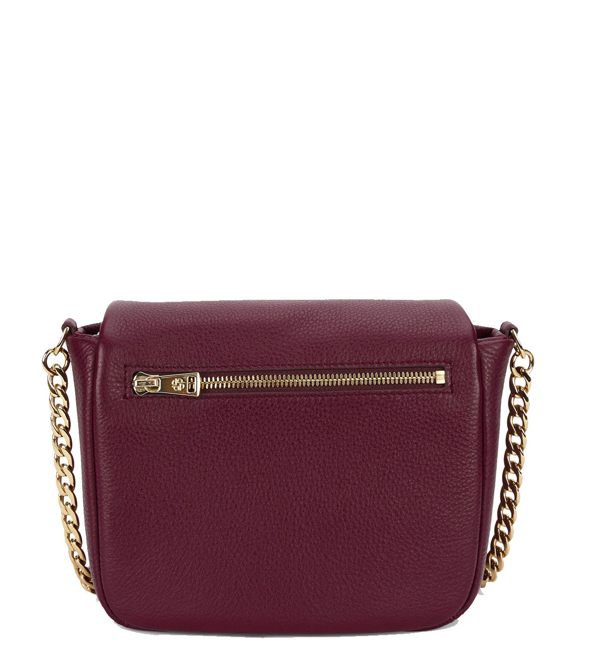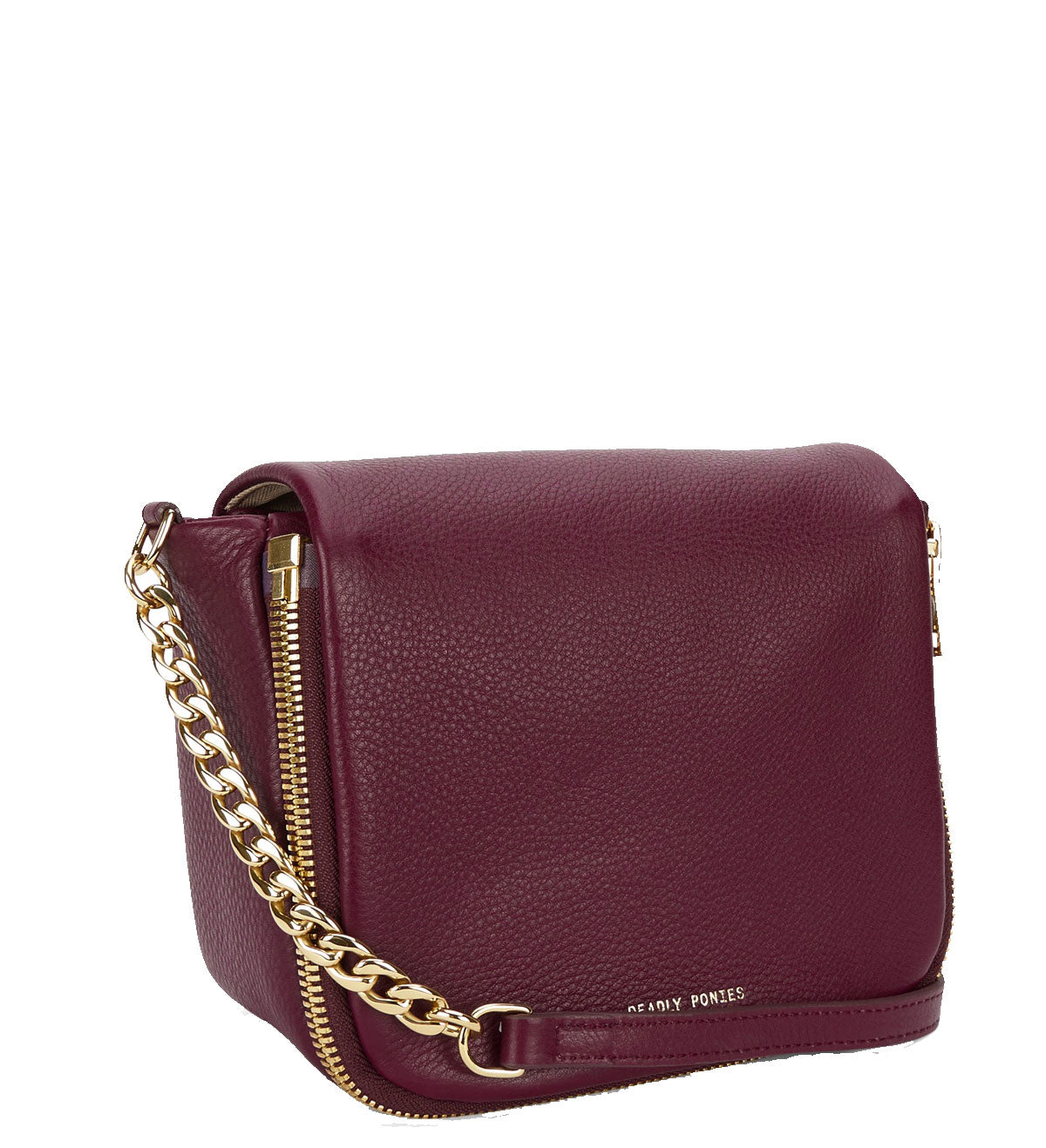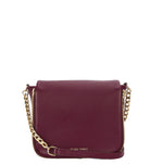 Soft deer skin shoulder pouch with a zipper flap, an interior pocket and adjustable leather and brass chain strap.