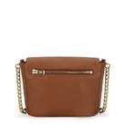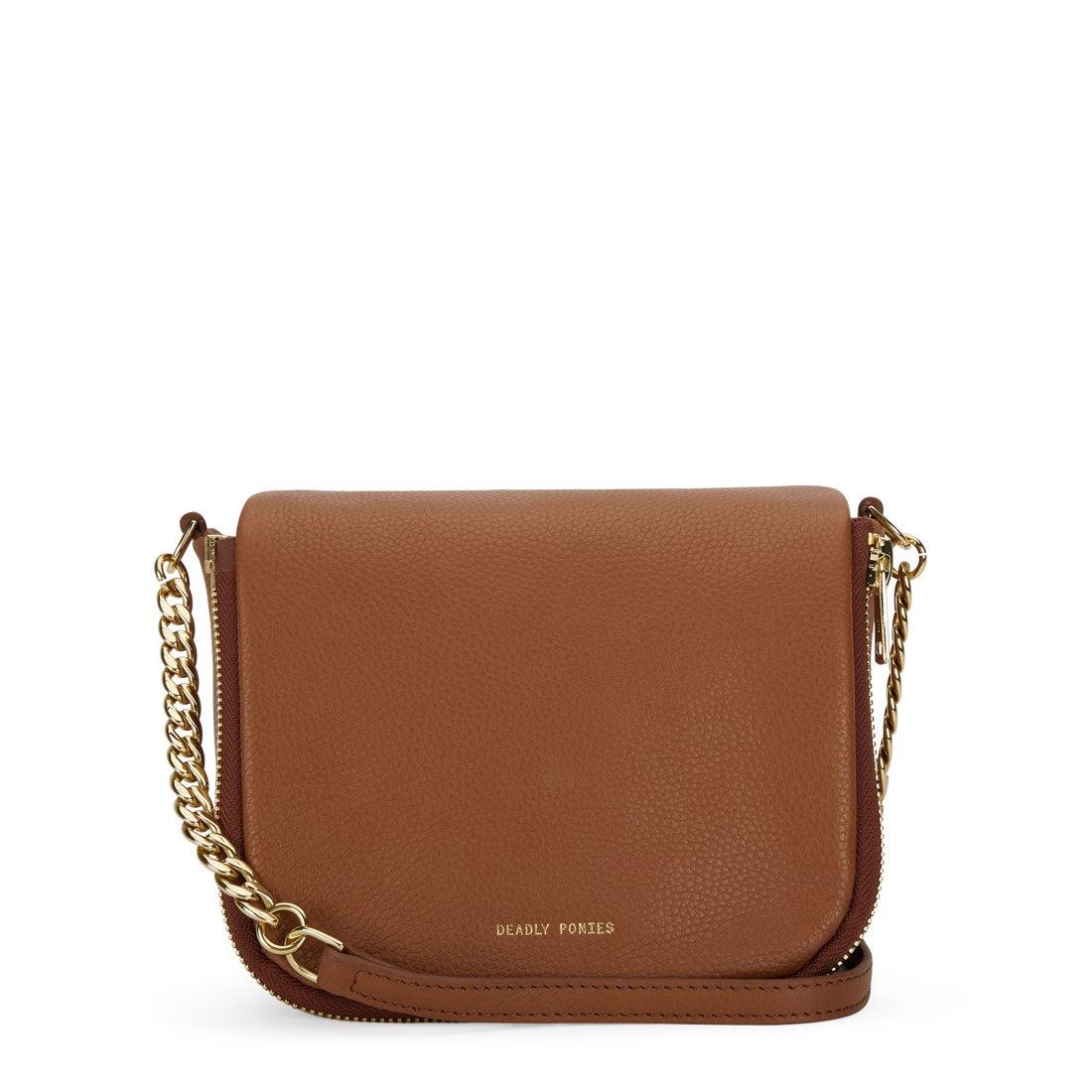 Soft deer skin shoulder pouch with a zipper flap, an interior pocket and adjustable leather and brass chain strap.