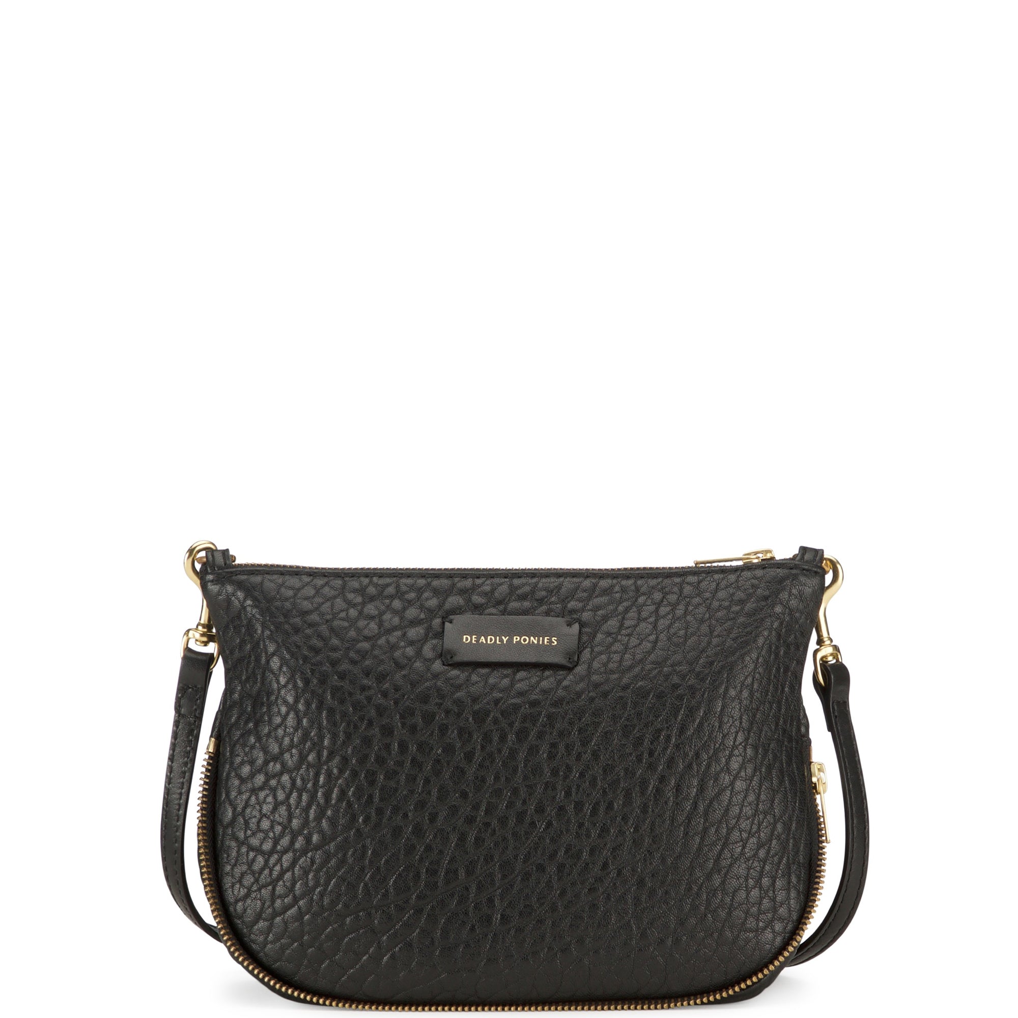 The best selling and much adored Mr Gator bag from Deadly Ponies has been updated as a comfortable and stylish crossbody bag. With zipper access from the top and zipper detail on the bottom the bag is completed with brass hardware and the brands signature gold foil logo embossment on the front. The cotton lined interior holds an internal zip pocket and enough room to take you throughout the day, but small and elegant enough to take with you at night.