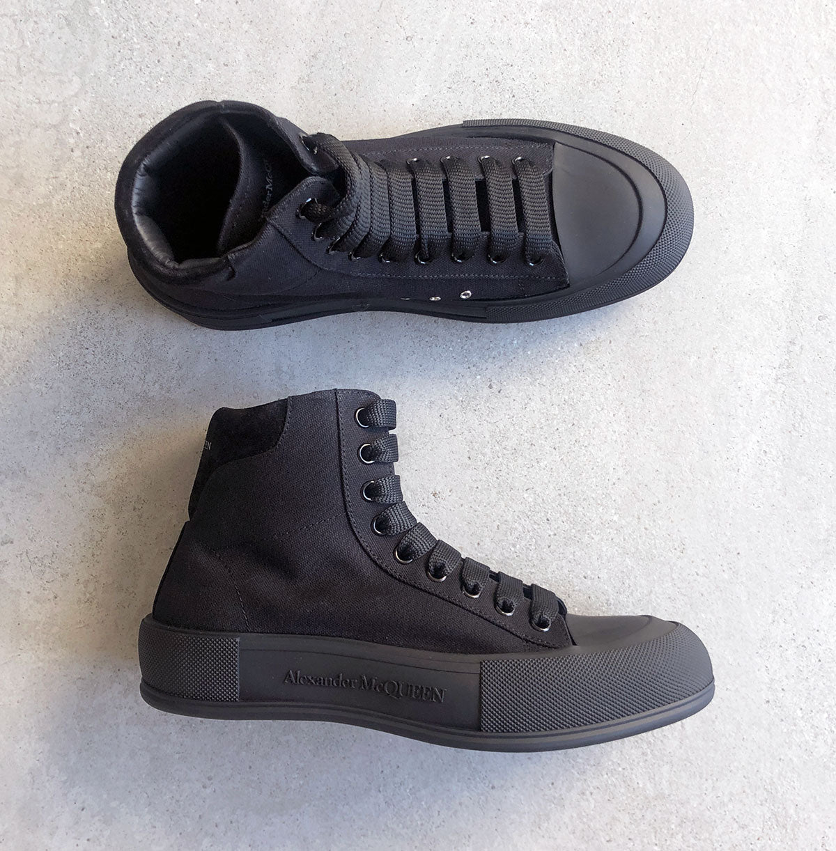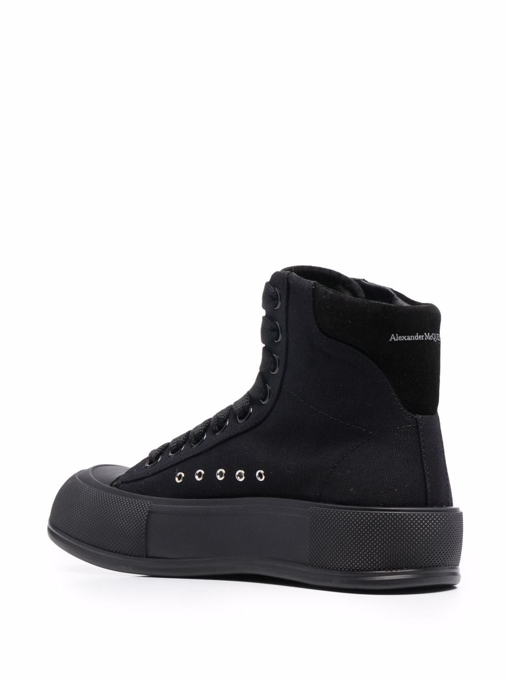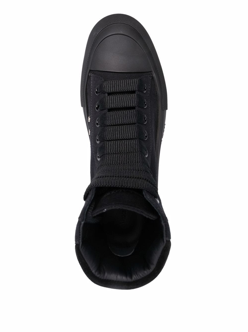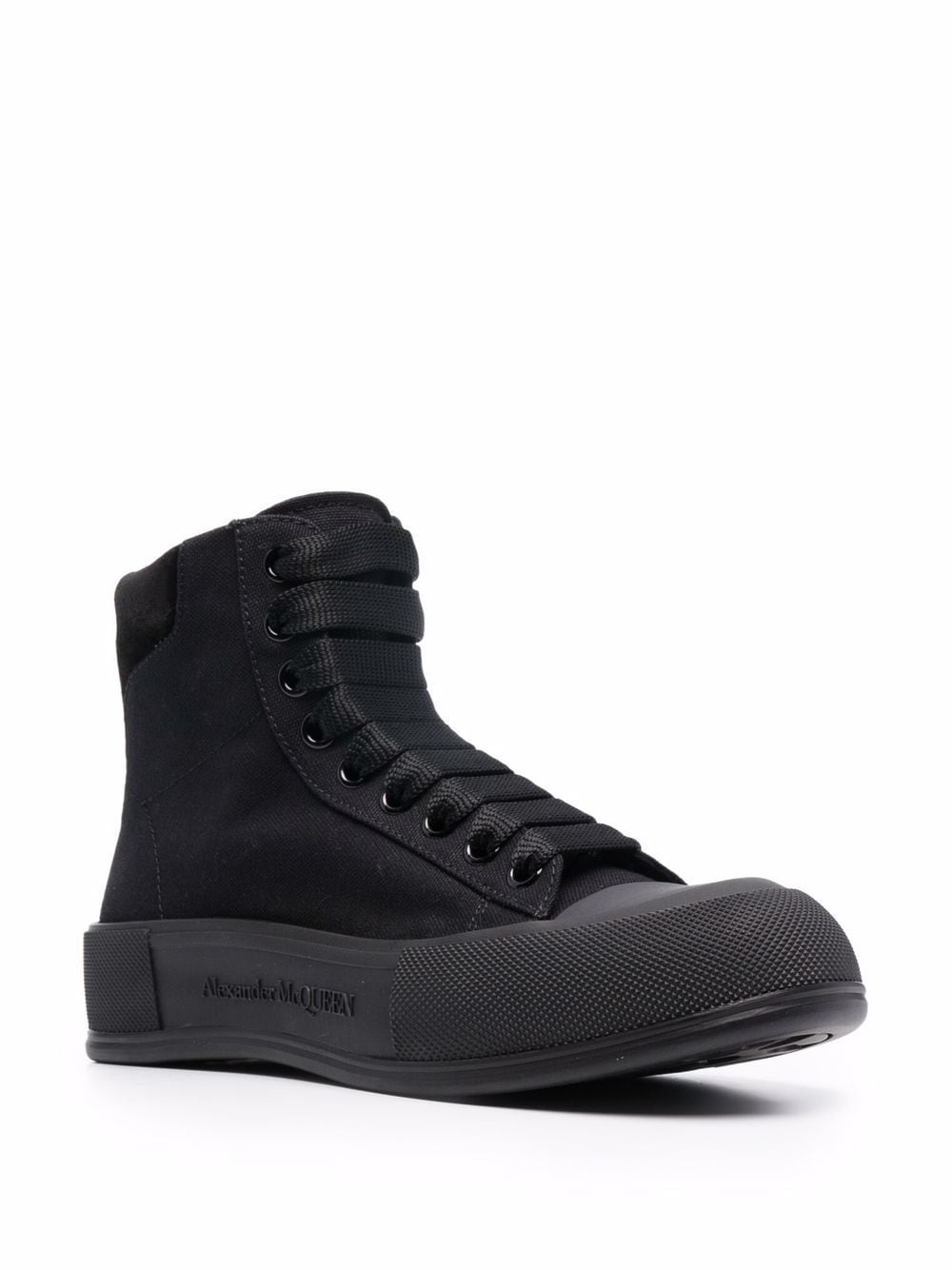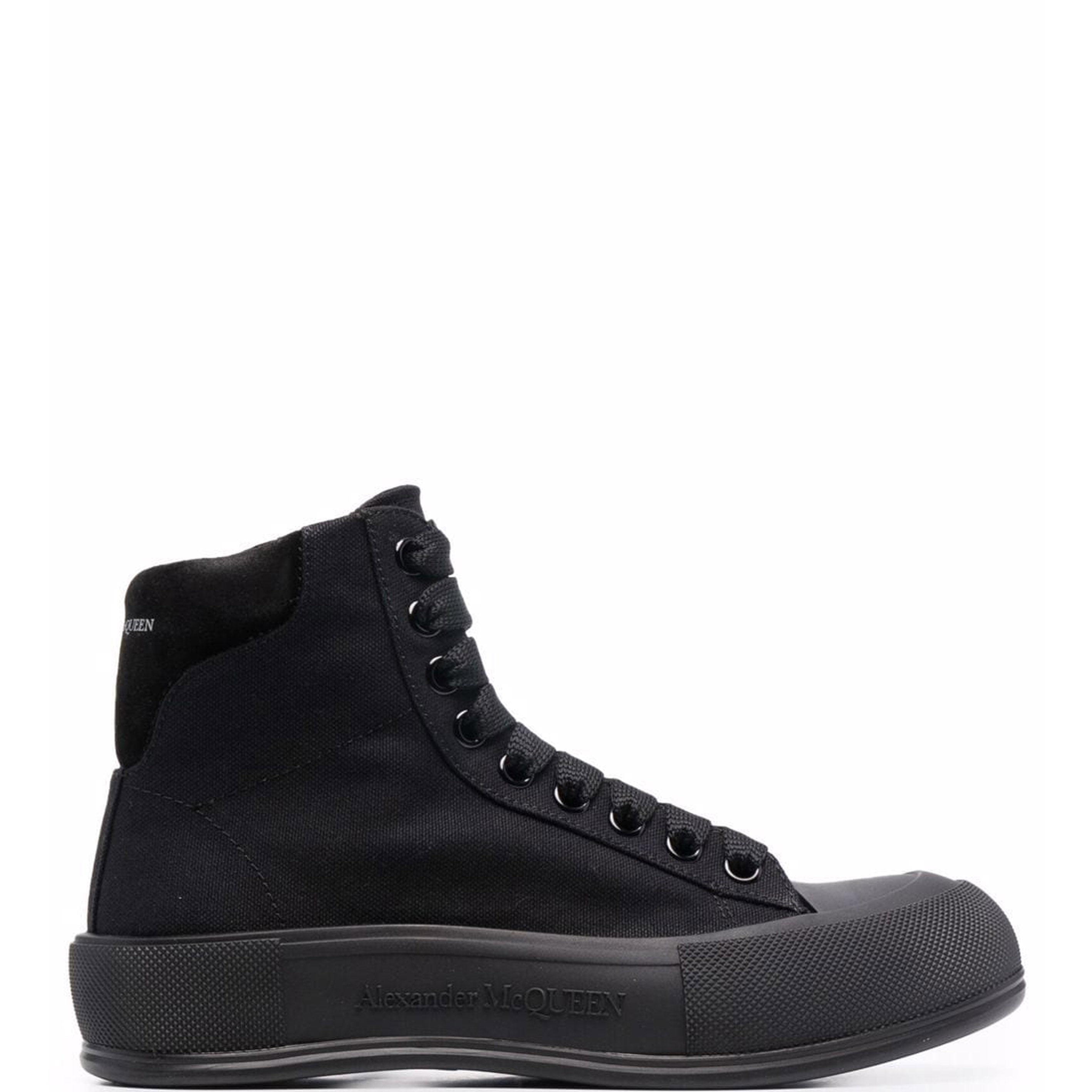 Black canvas high-top Deck Plimsoll with a thick oversized rubber sole. The lace-up is detailed with a rubber wrap sole and tonal Alexander McQueen signature, finished with a suede heel counter. Round toe shape silhouette details rubber toe cap.
