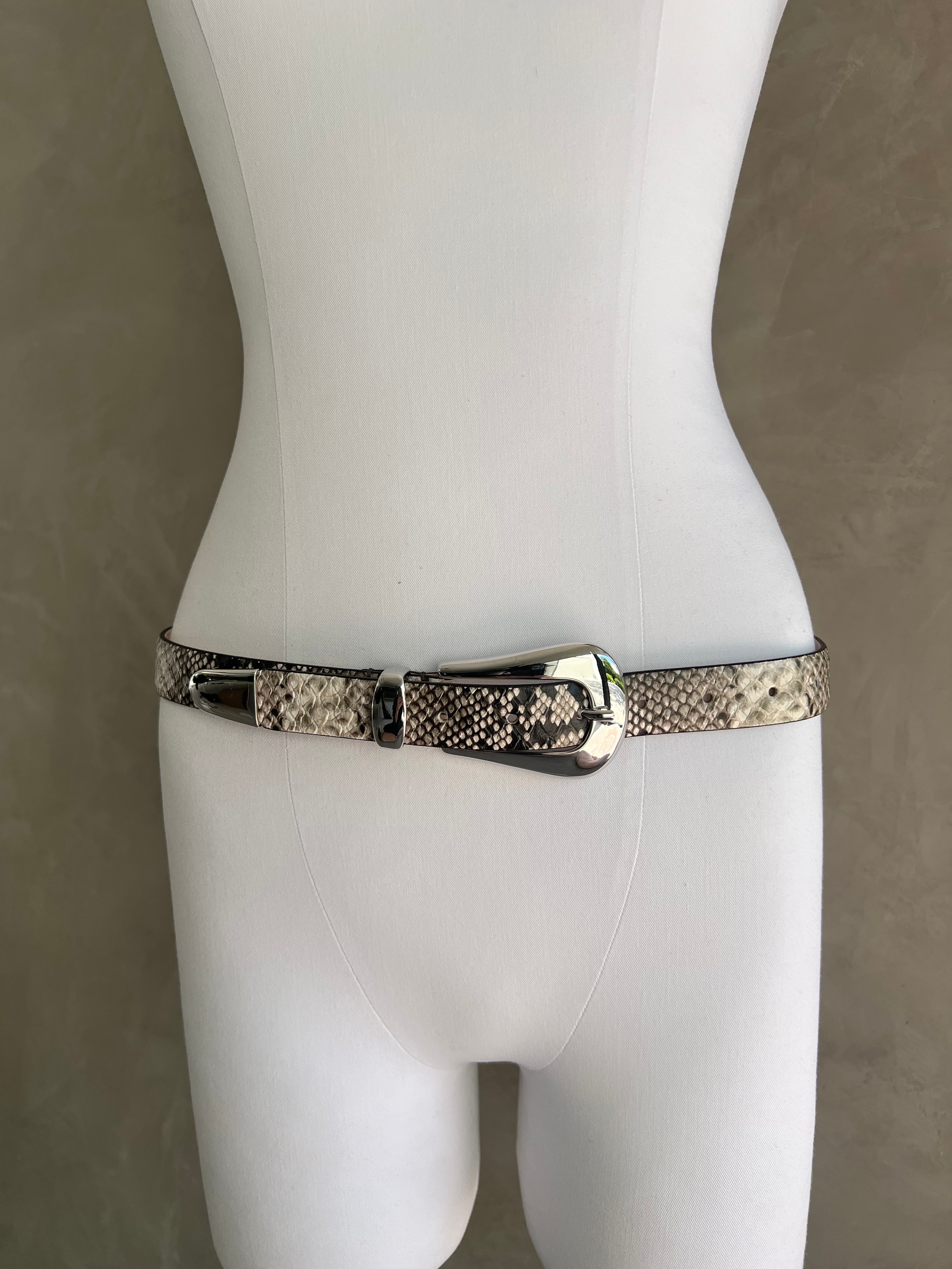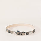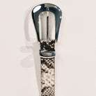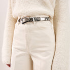 The Colette belt softens Western cues into a sculptural, minimalist accent, crafted from snake-effect leather and finished with silver oval hardware that sharpens the silhouette with quiet elegance.