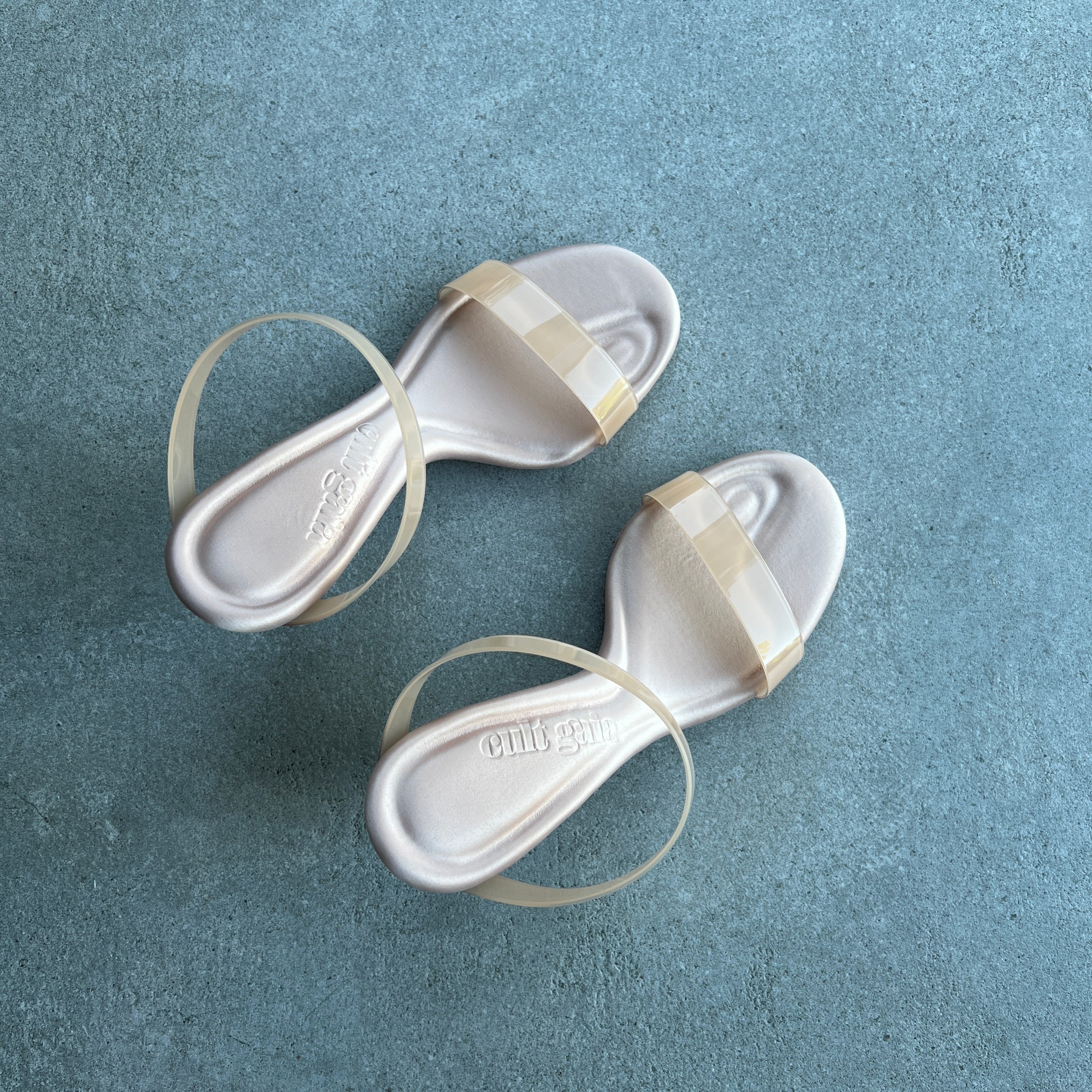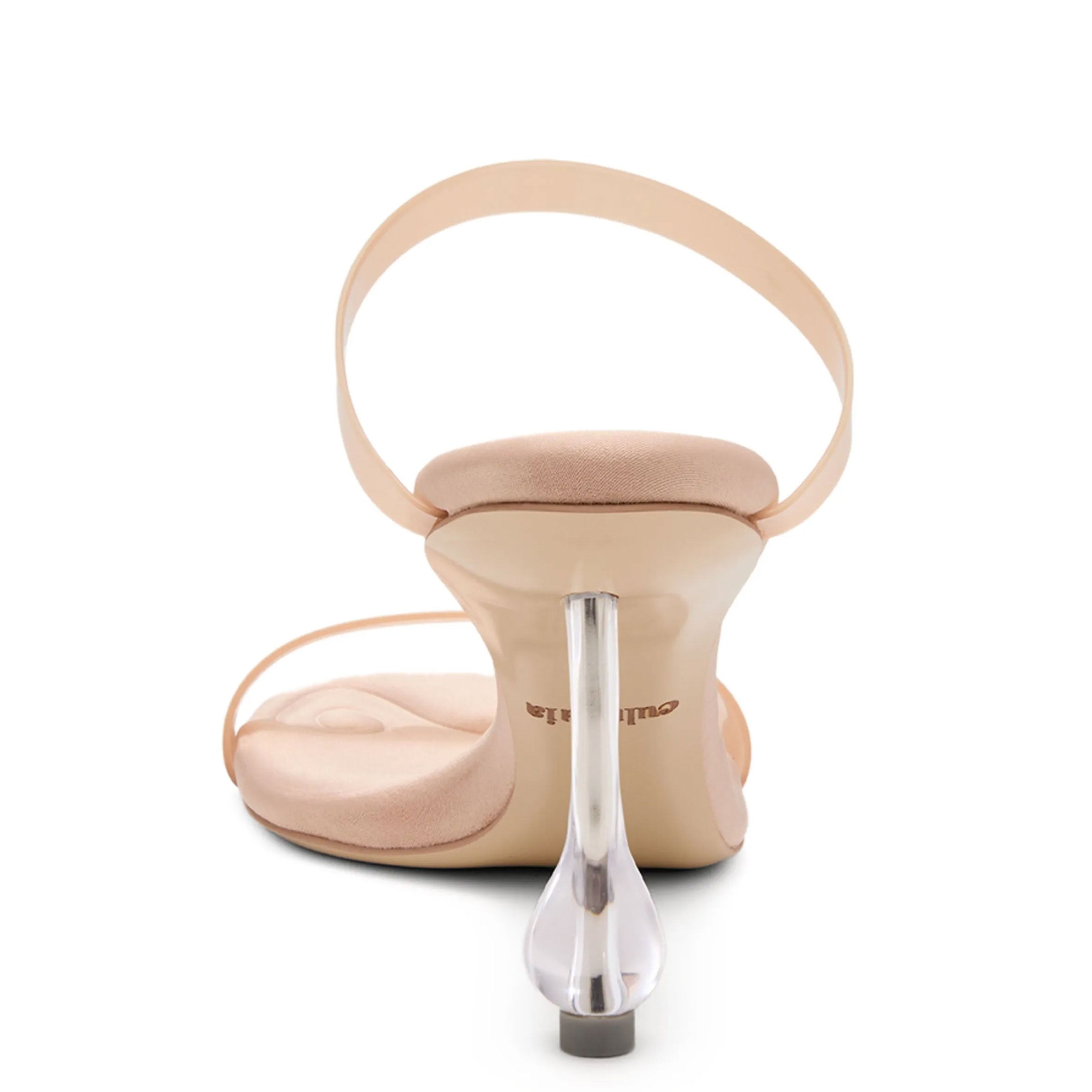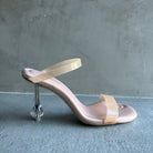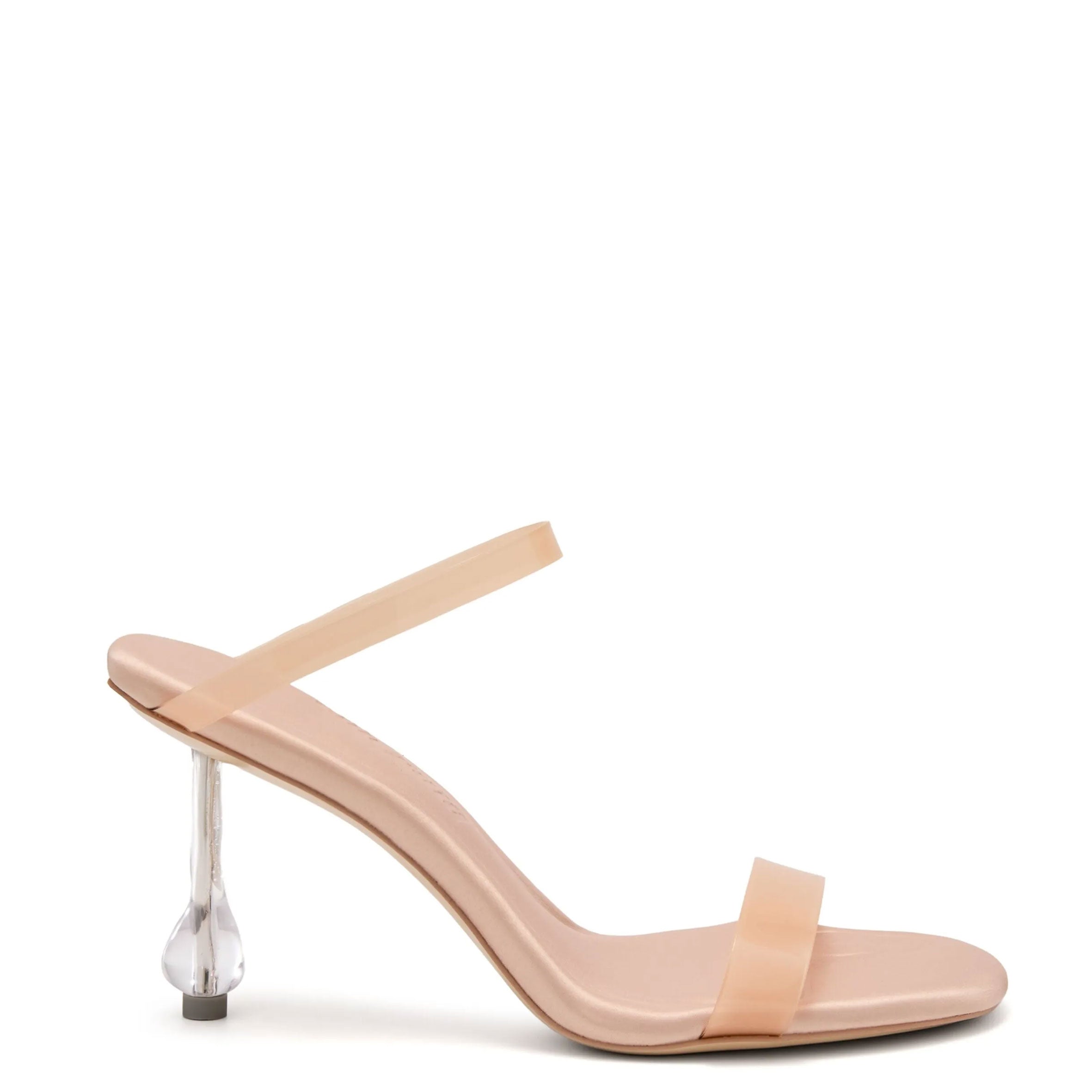 A high-heeled sandal with a pedestal stiletto heel and clear vinyl straps.