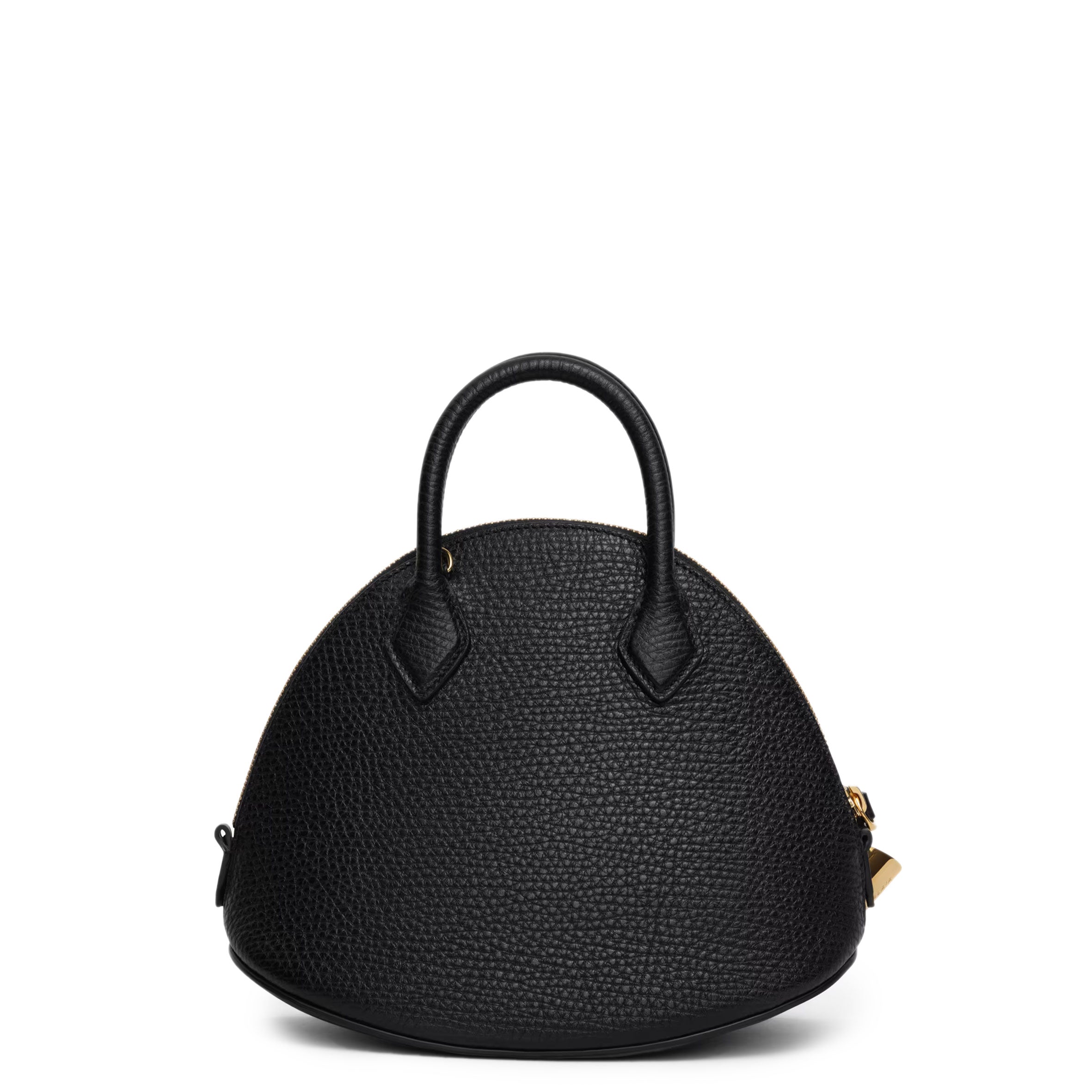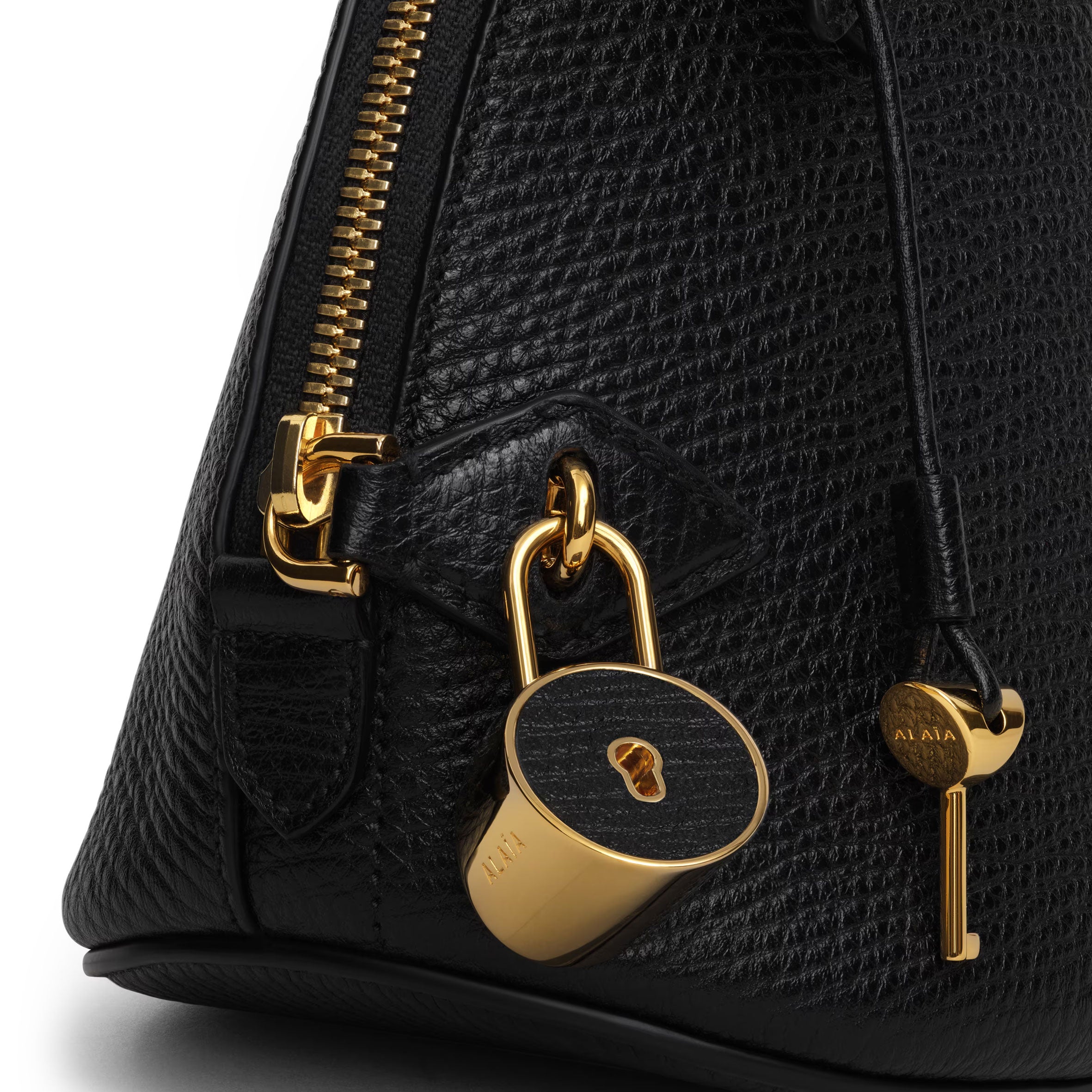 The dome shaped bag of the Alaïa Maison. A small structured handbag crafted in premium grained calfskin, featuring a zip closure and functional padlock and key bell. It also had a long strap making it suitable for hand or shoulder carrying.