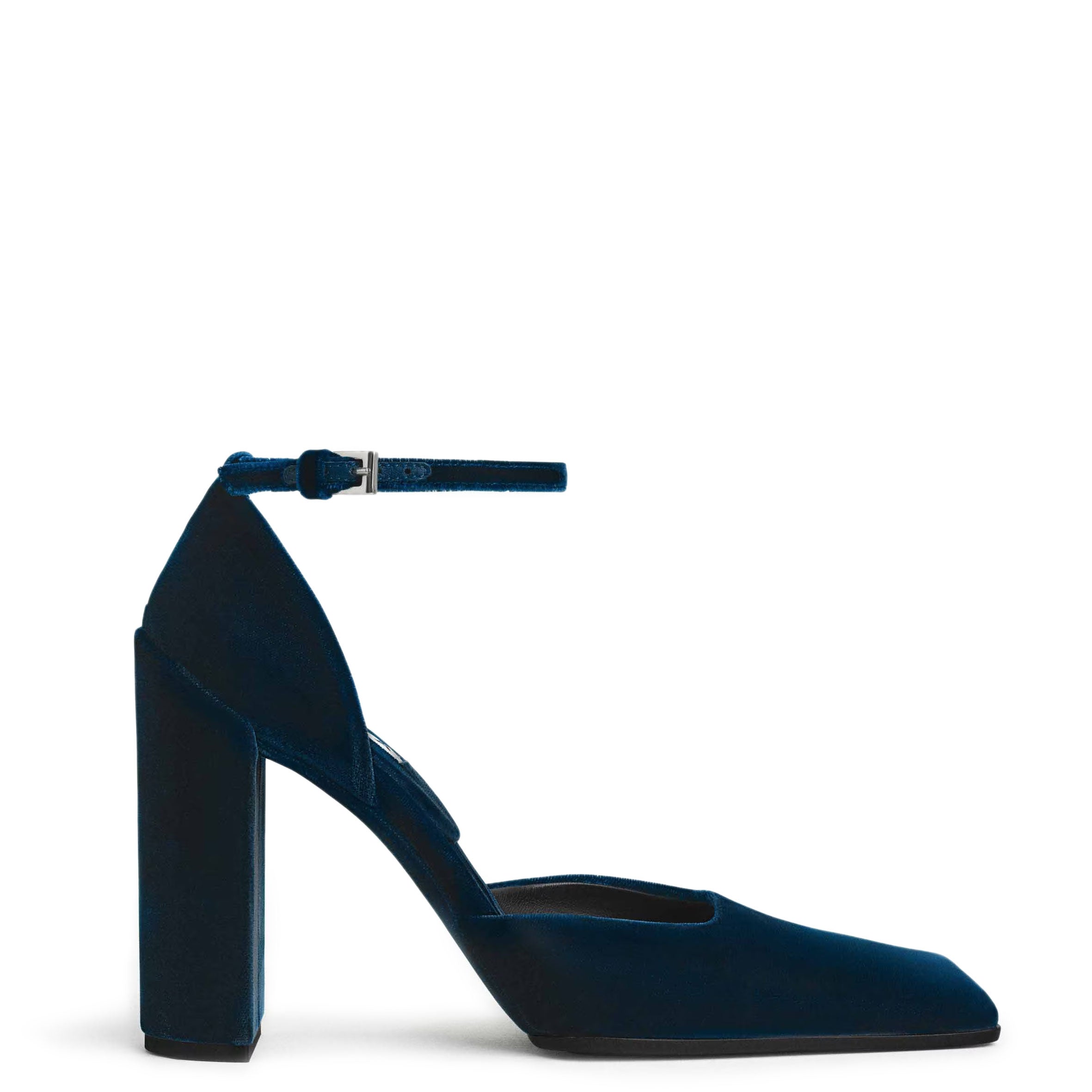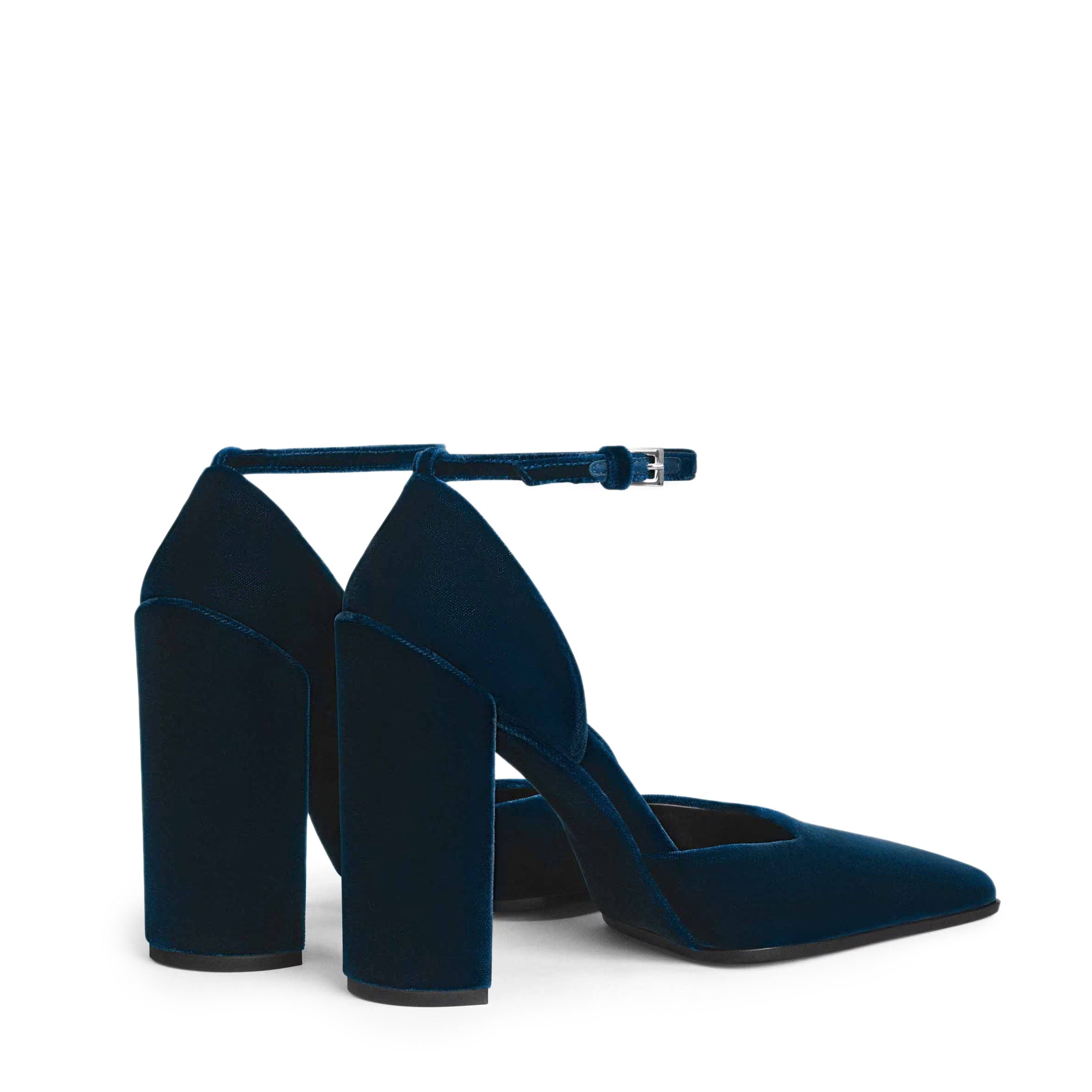 D'Orsay pumps with a distinctive square toe and block heel slightly protruding at the back. Wrapped in matching velvet with an adjustable ankle strap.