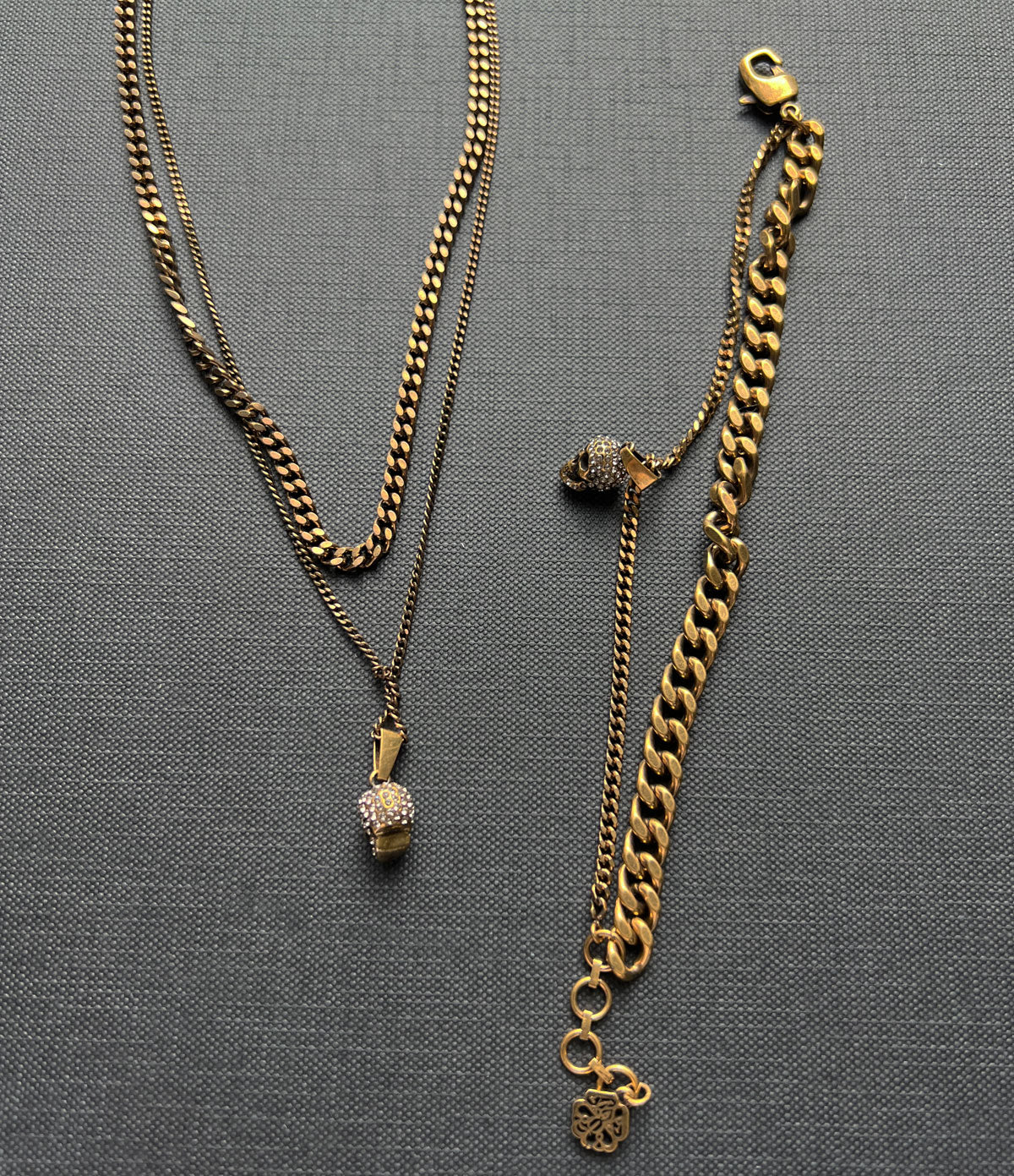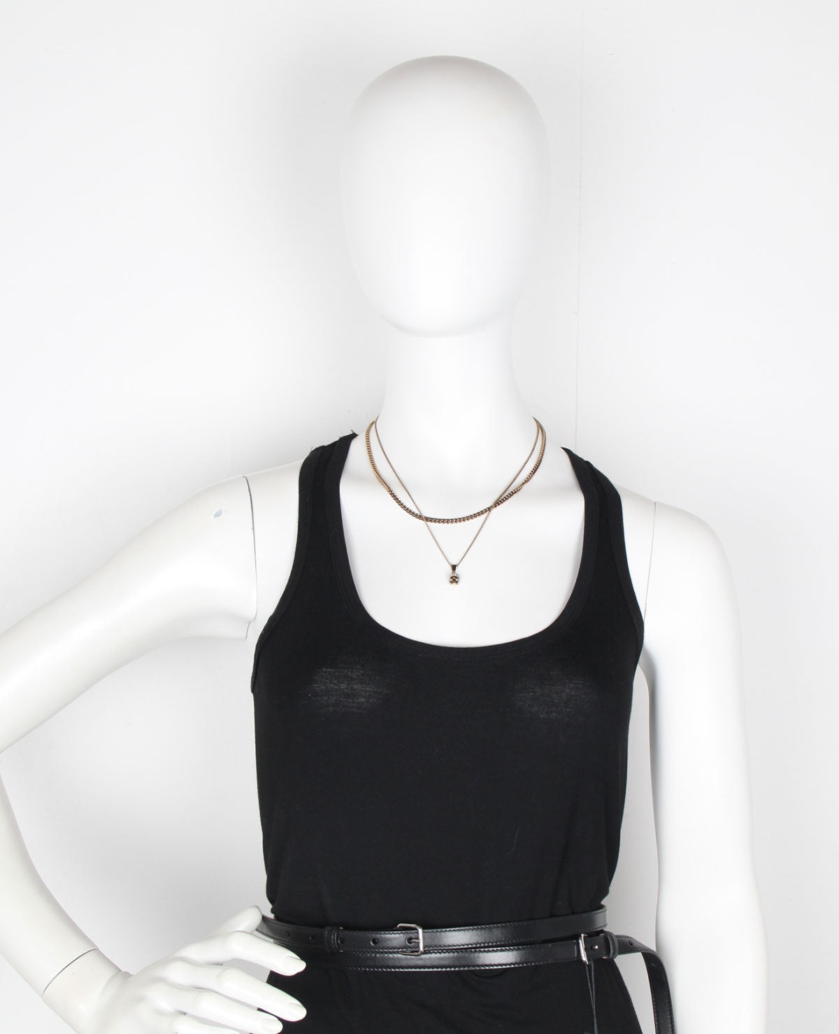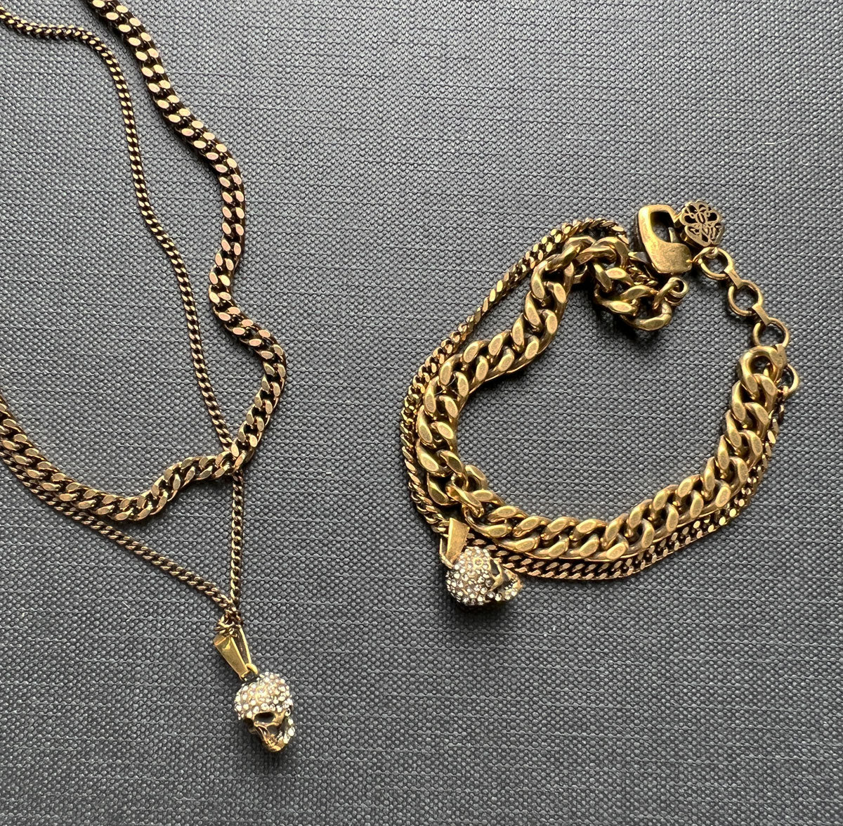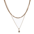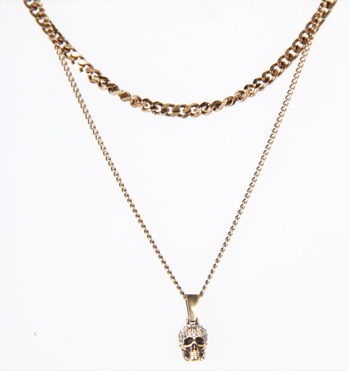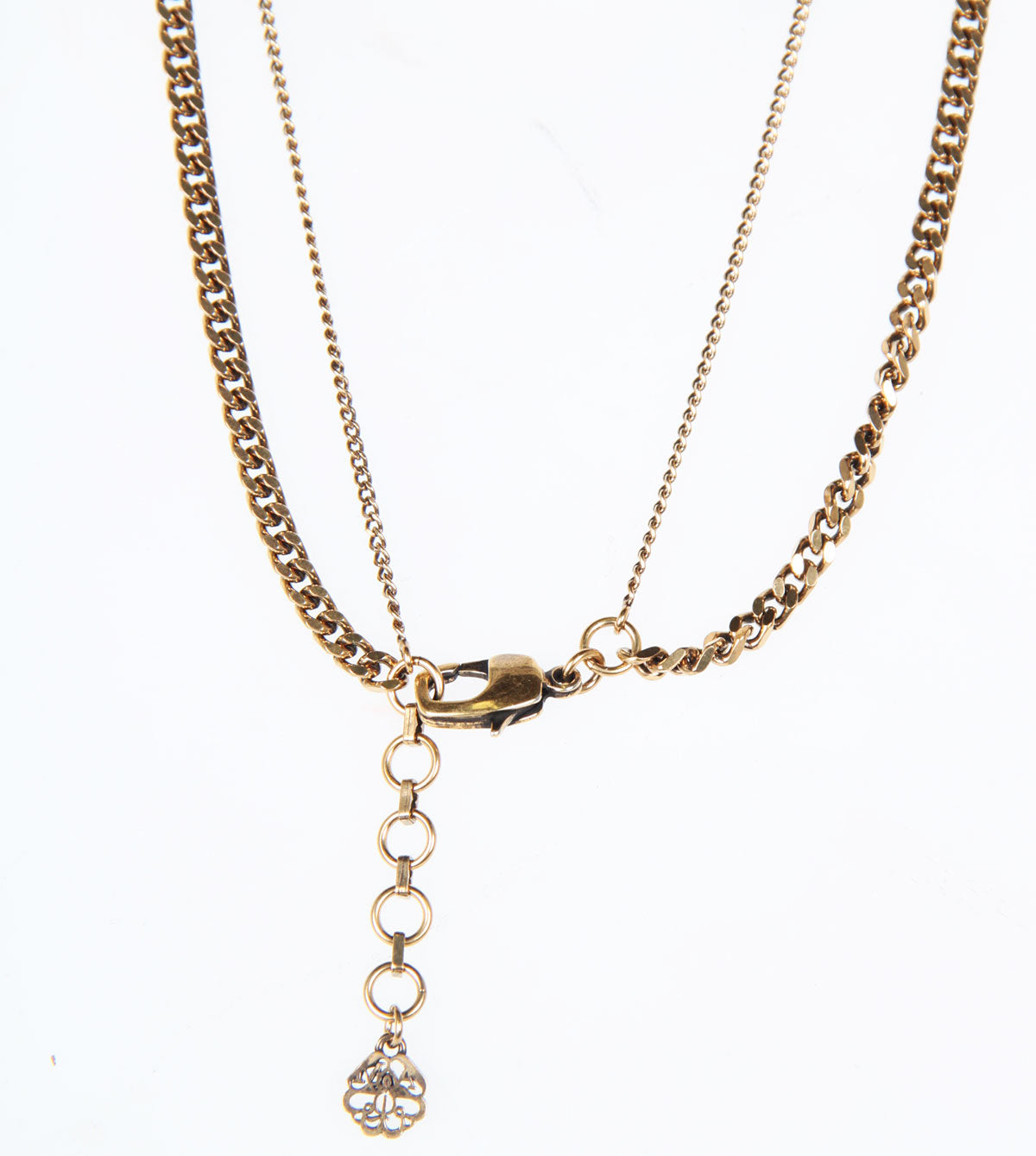 Double Skull charm pendant necklace from Alexander McQueen. Crafted with a double wrap style thin and thick cable chain in luxury gold tone brass. Adjustable lobster claw fastening.