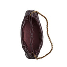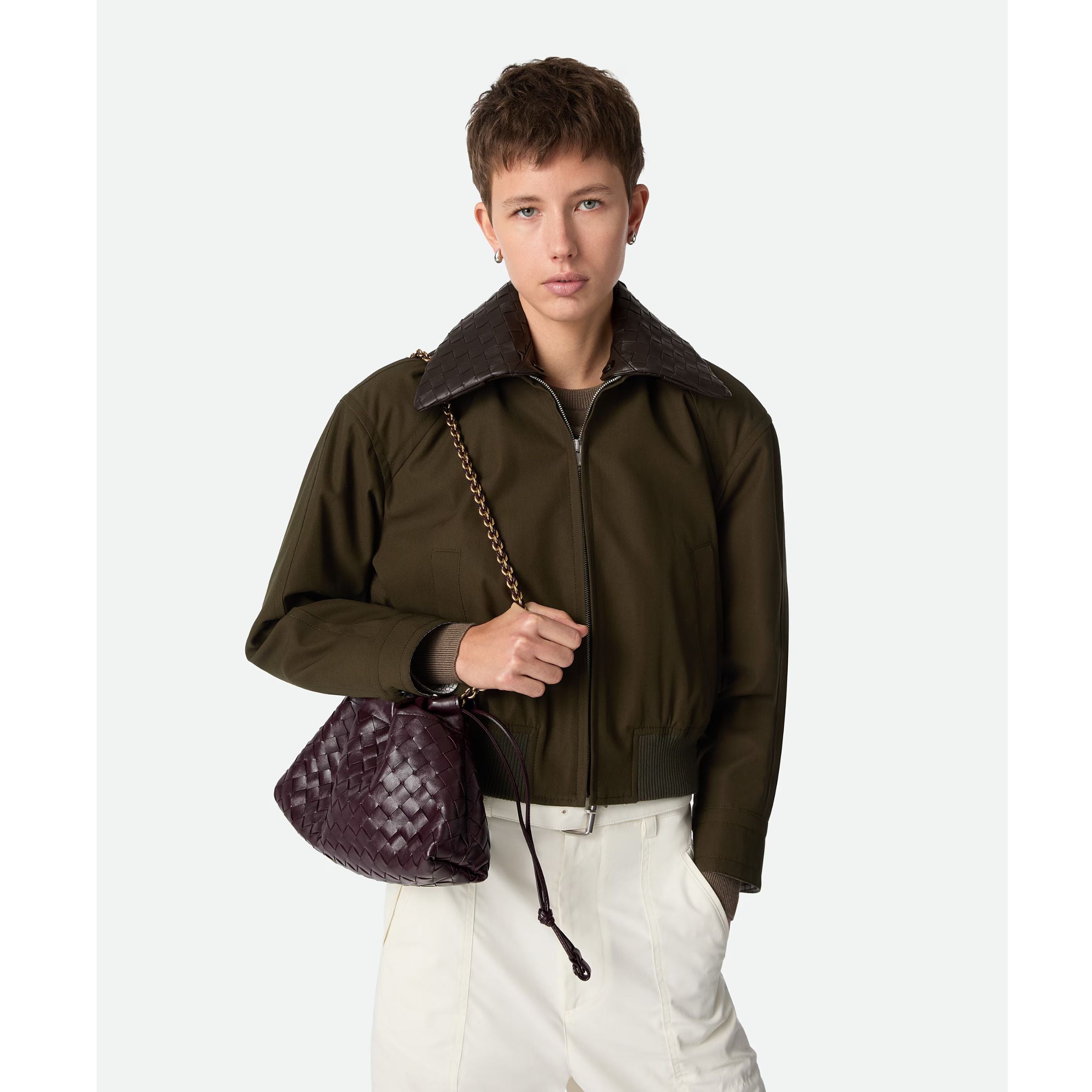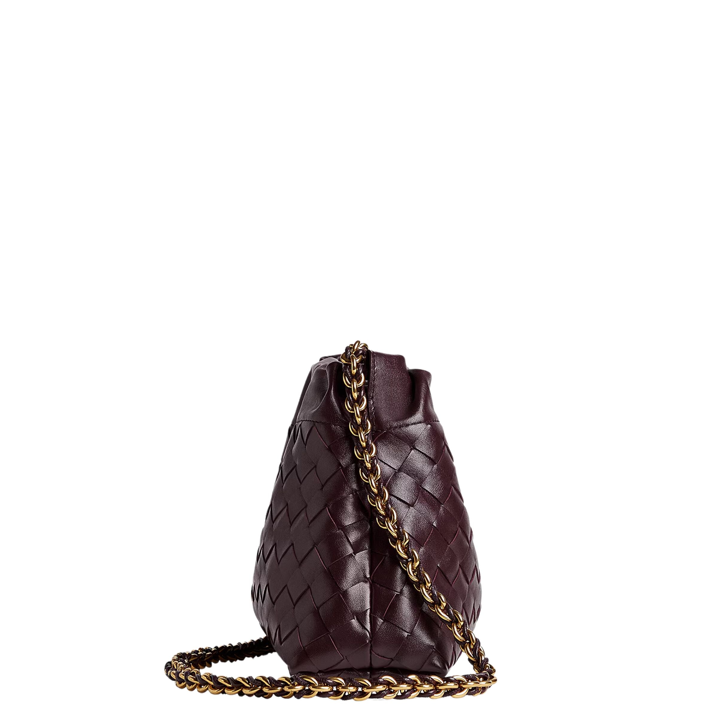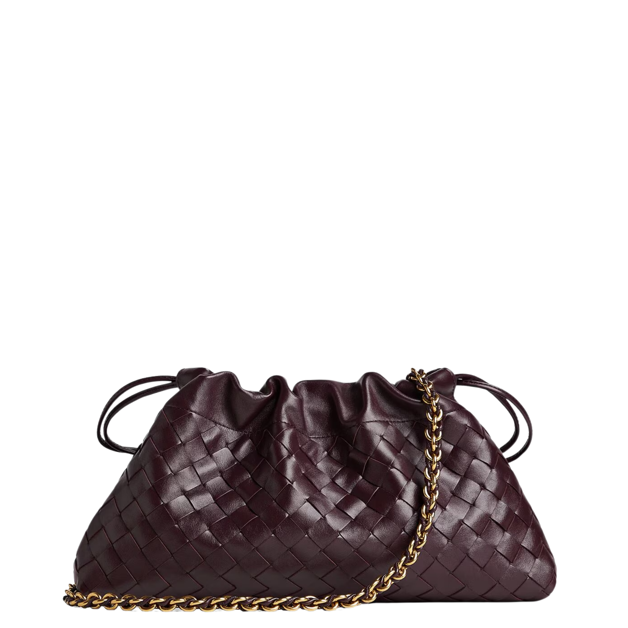 Dustbag in Intrecciato calf leather with tubular leather braided metal chain. Features a drawsting closure and loop attachment for shoulder carry.