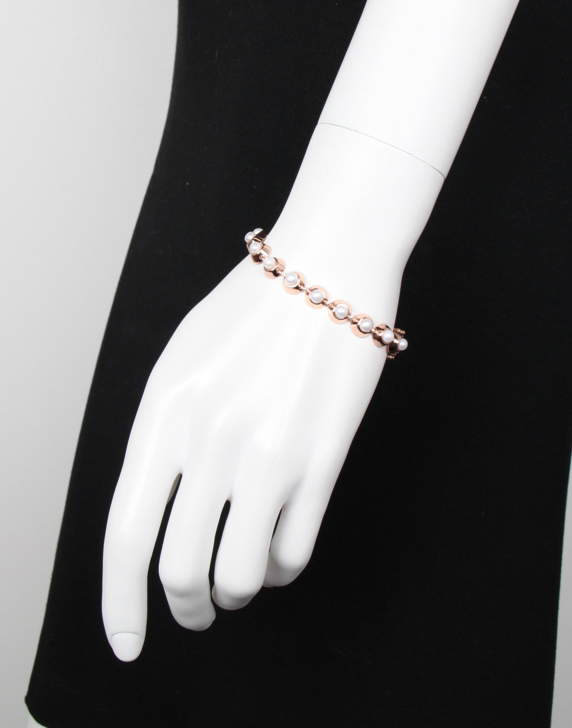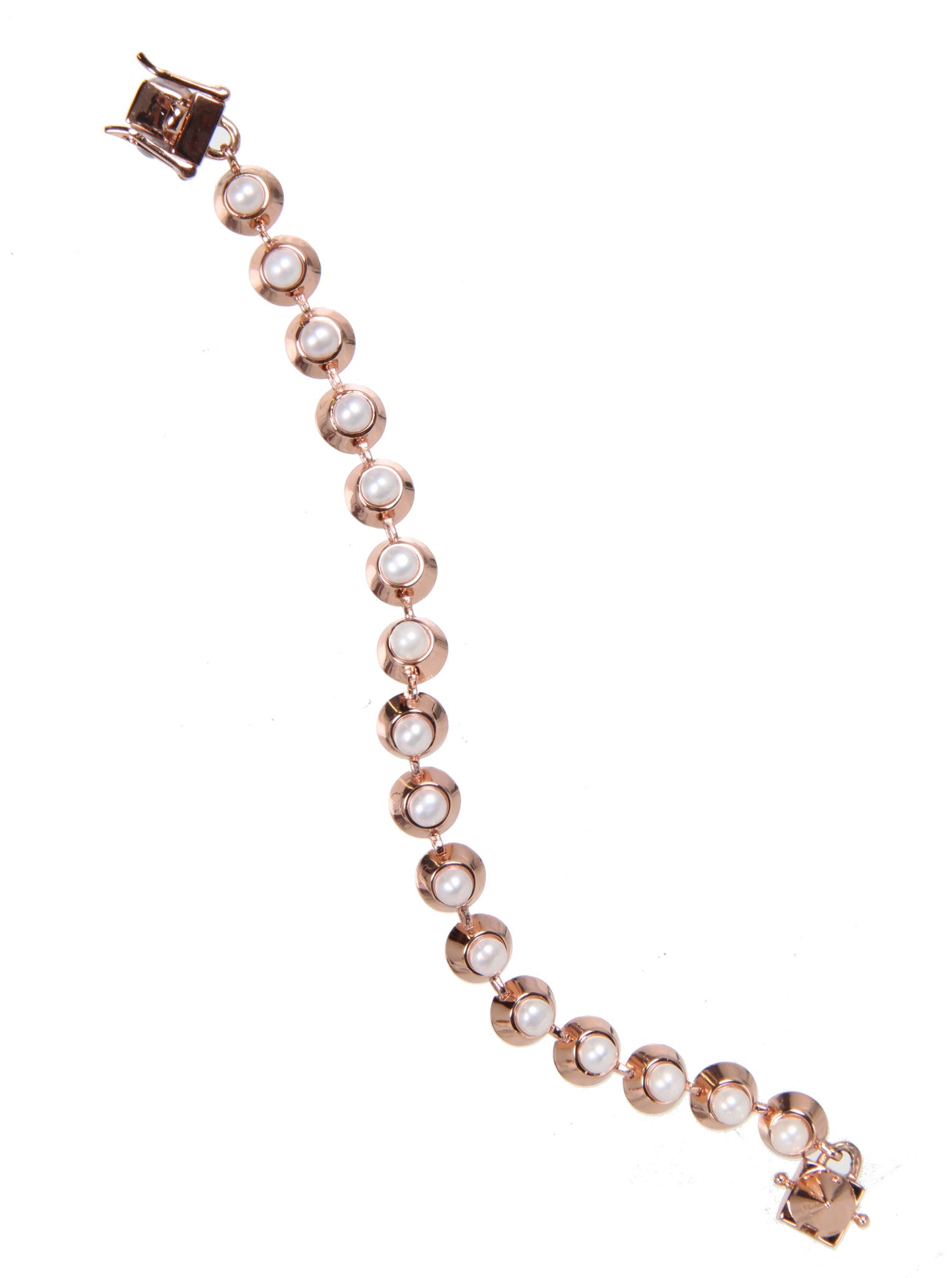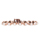 Pearl Cabochon Bracelet plated in rose gold with freshwater pearls. Box and tongue closure with a double figure 8 safety latch and signature cone stud.