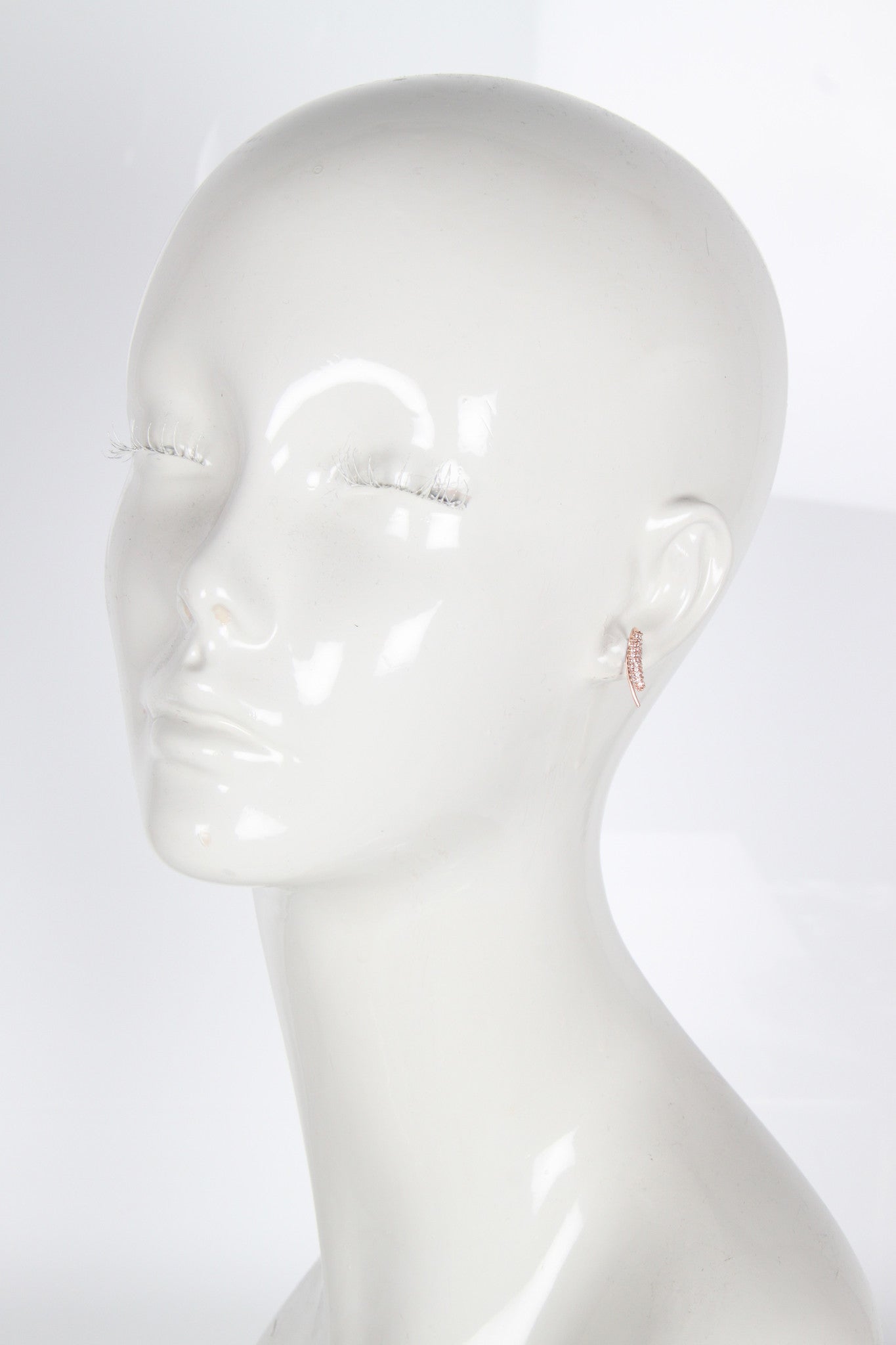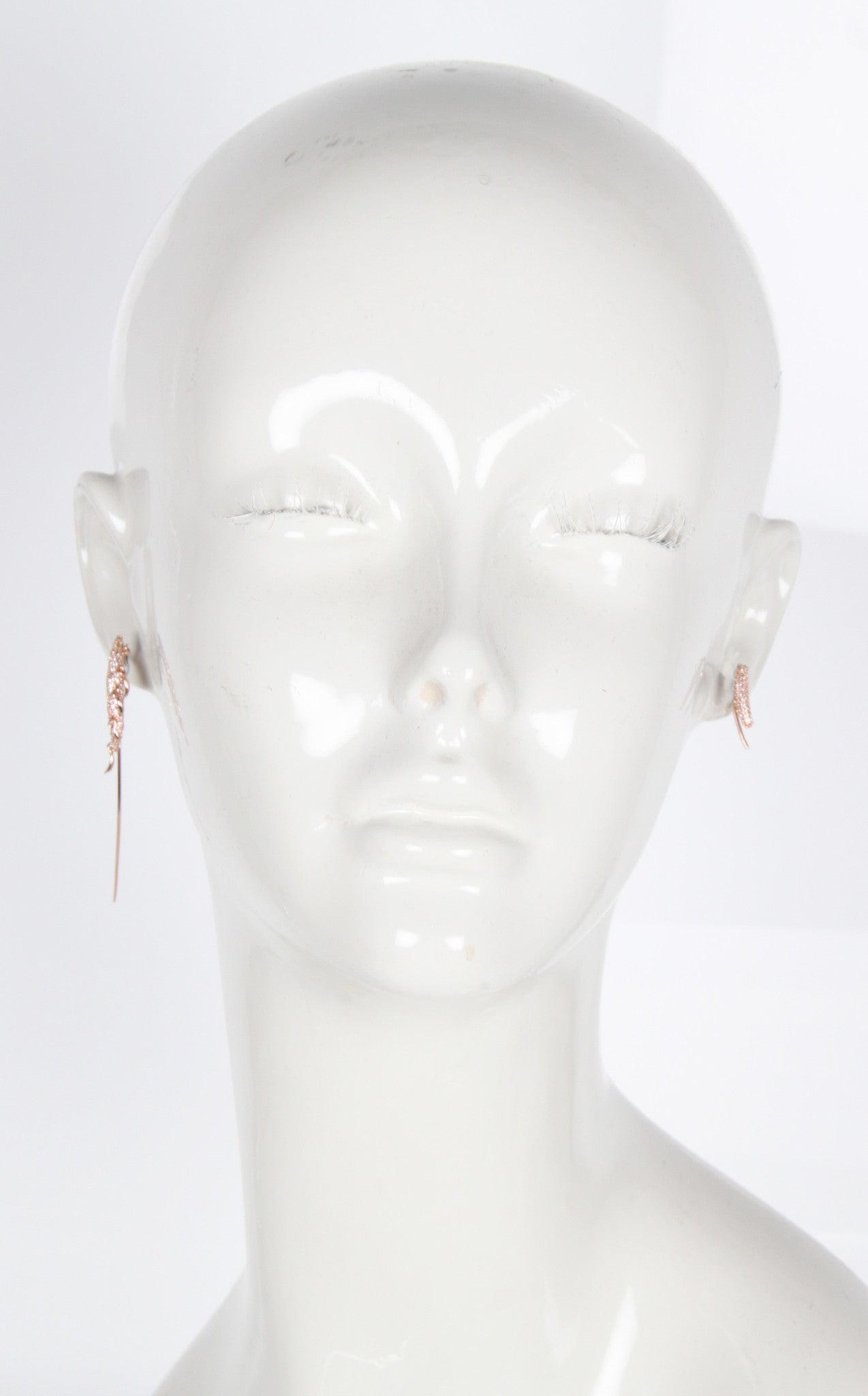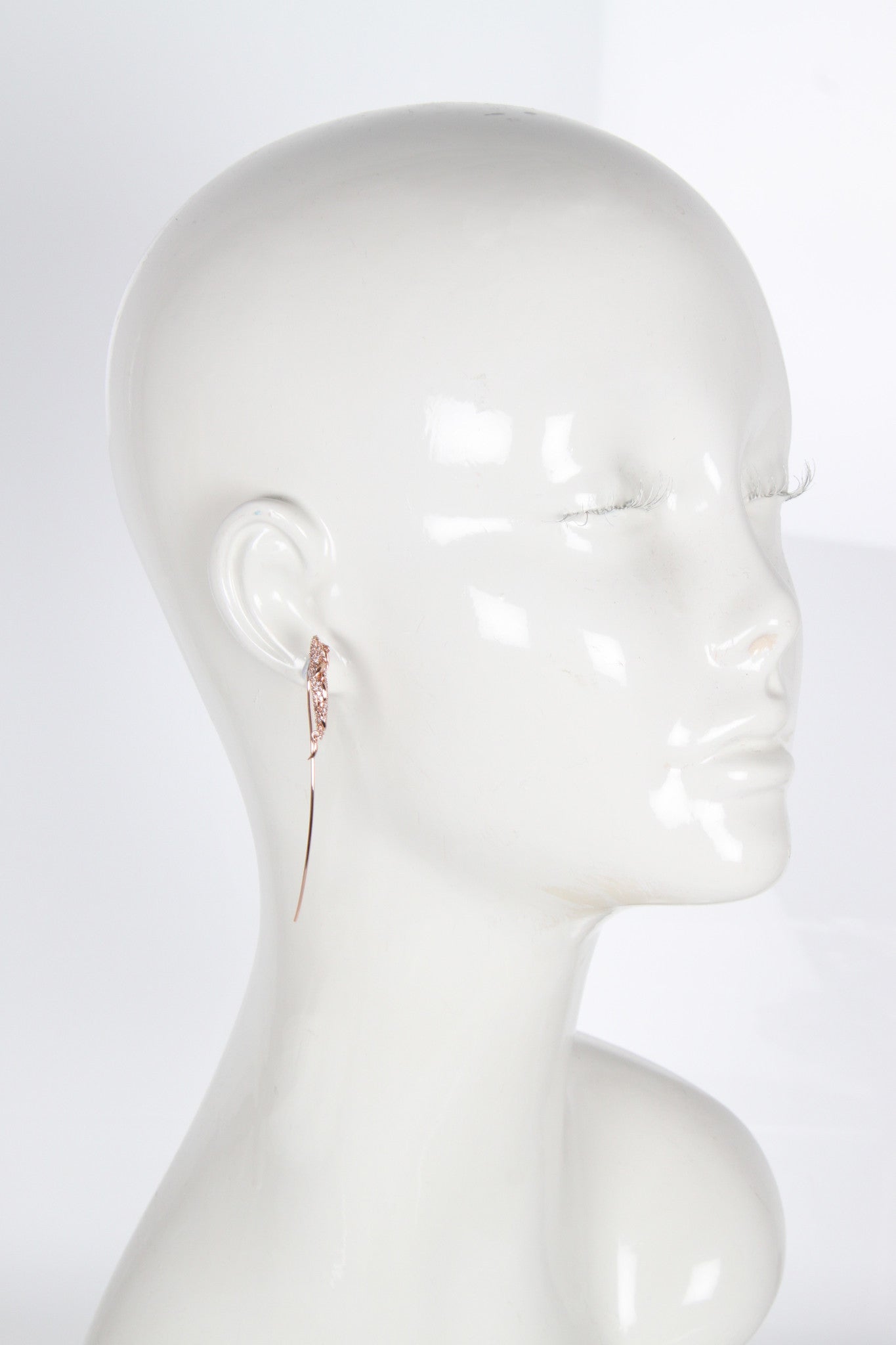This earring set designed in plated rose gold and handcut pavé crystals is an asymmetrical set, where one piece climbs up the ear, while the other has mini fluid prickles and an extended ear wire. This statement pair comes with one elongated side and a more understated shorter hook. The short piece can be used as a drop OR positioned upwards horizontally along the lobe.