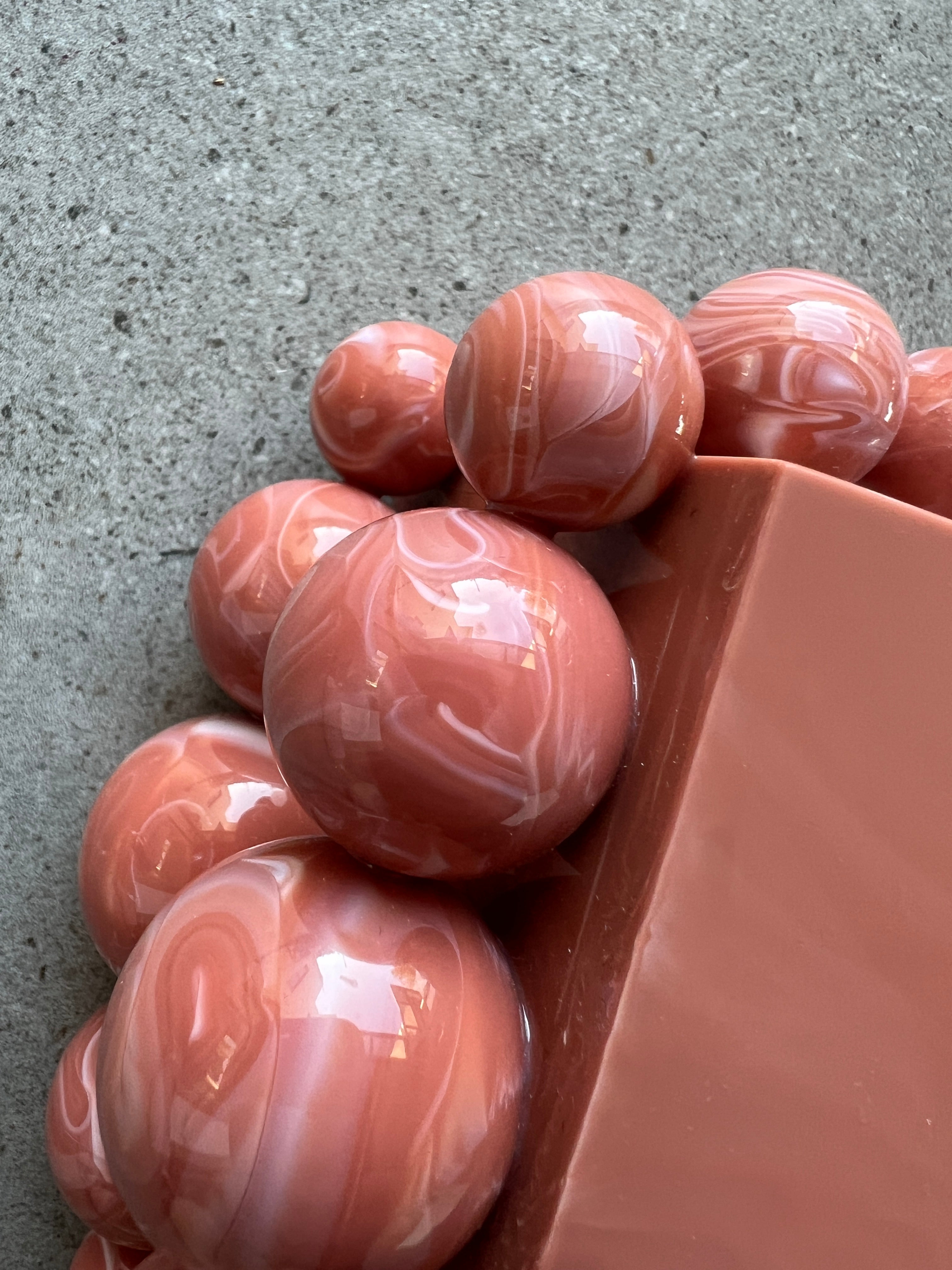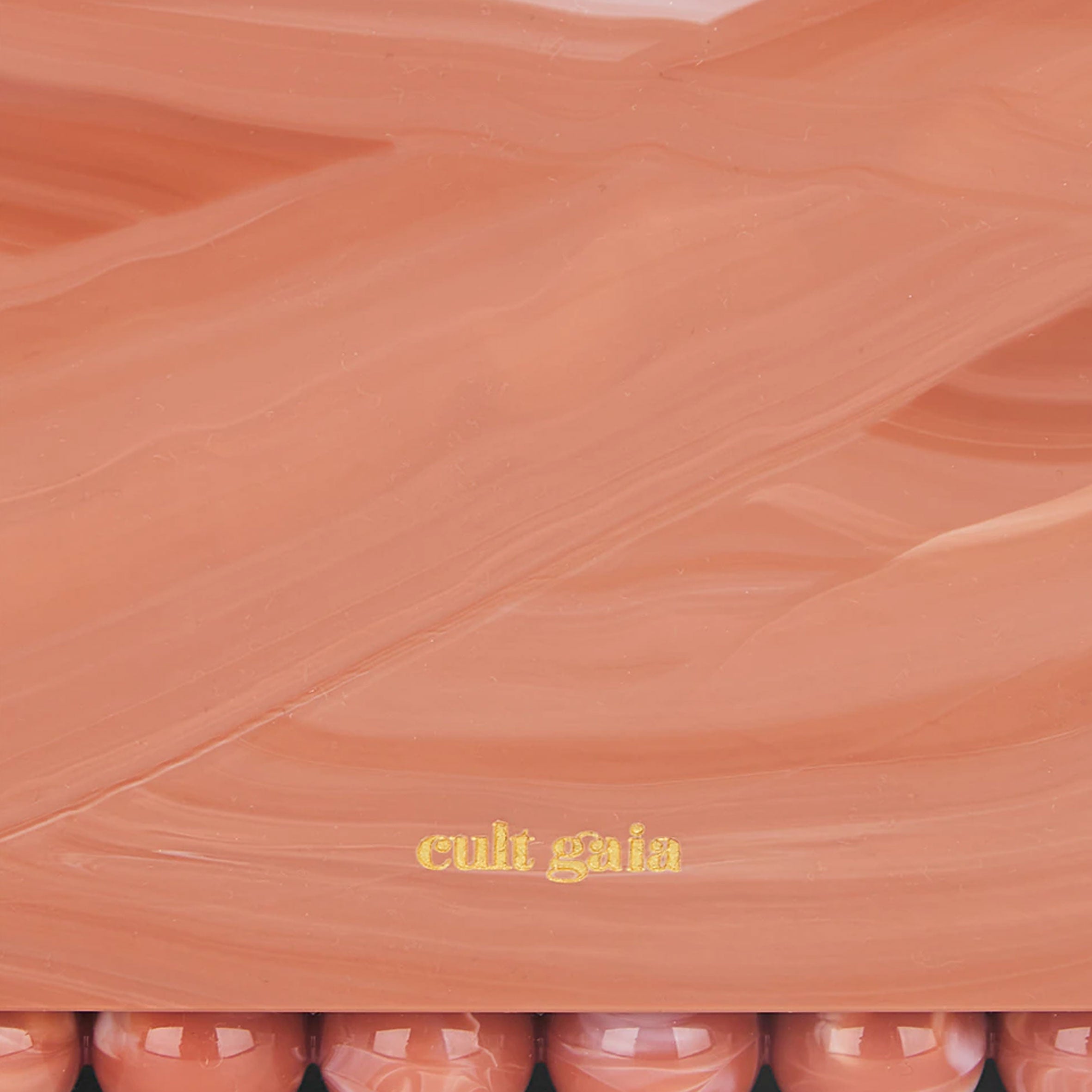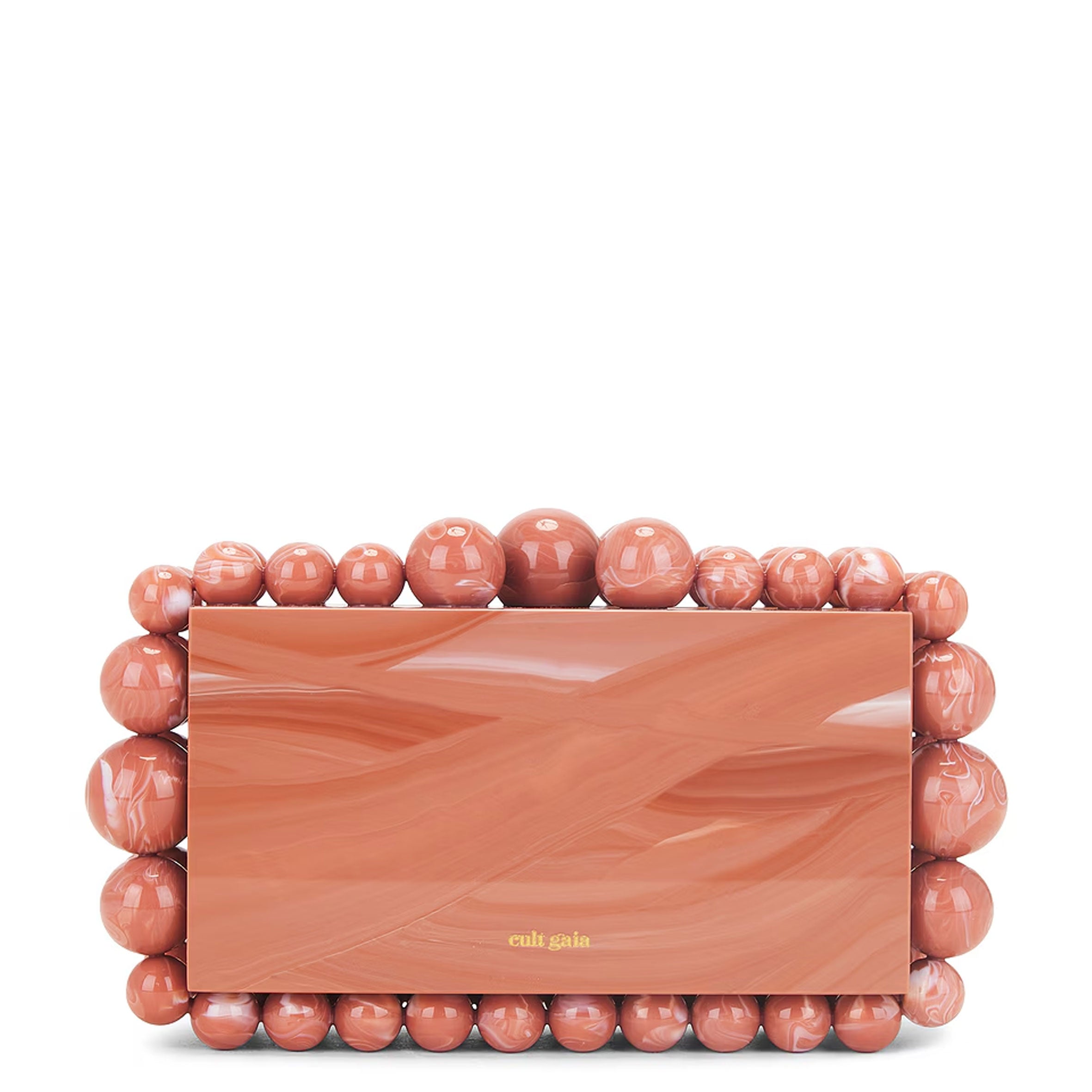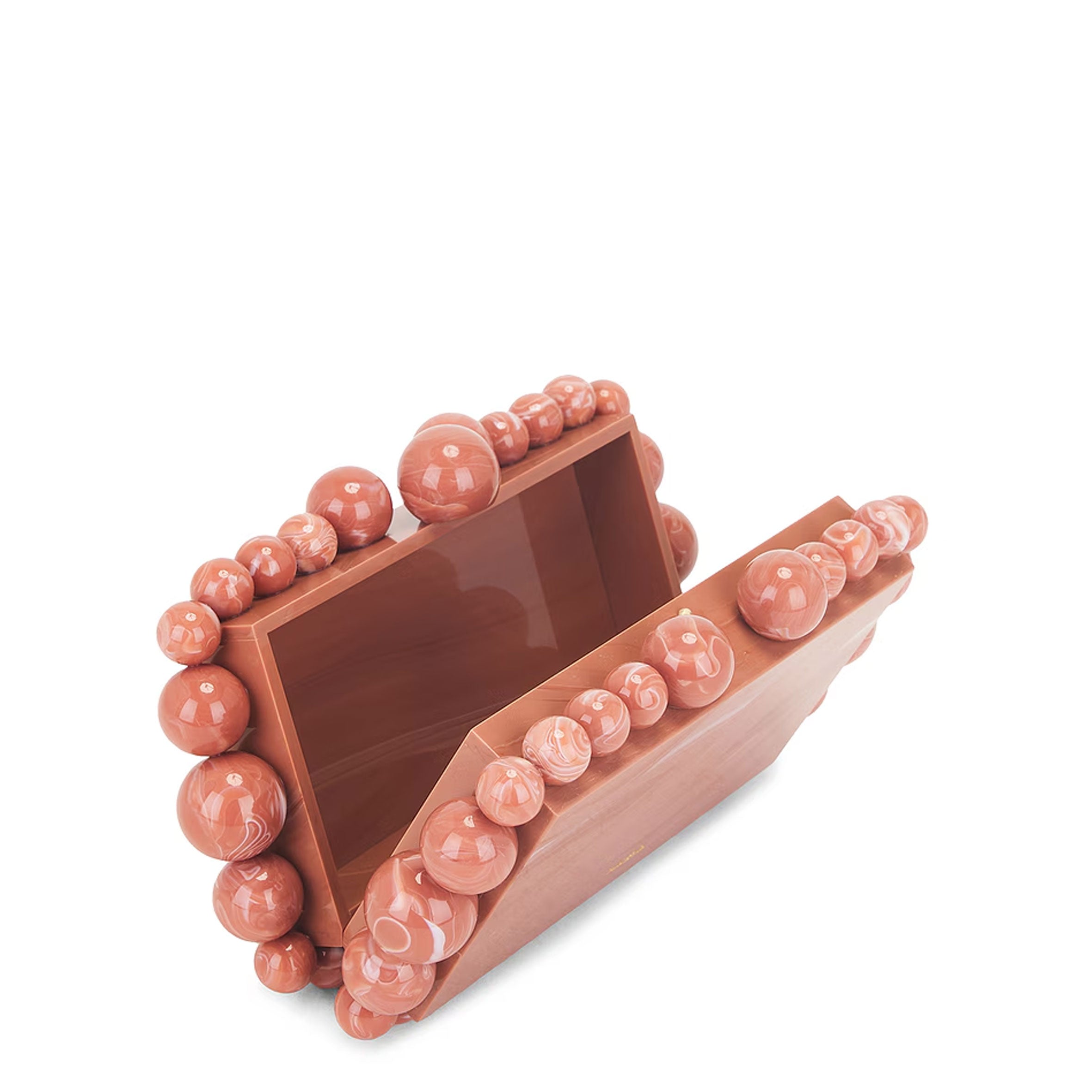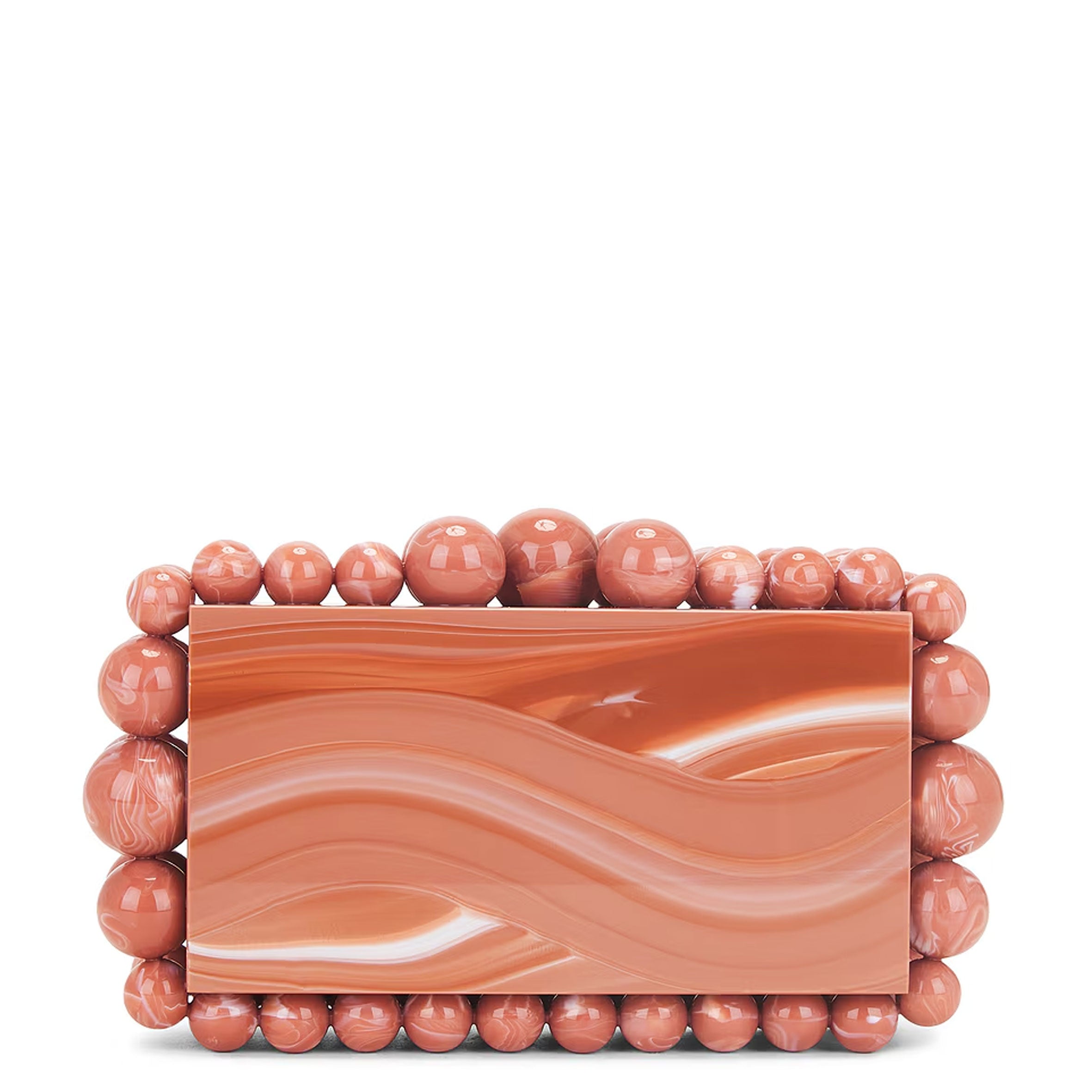 The EOS Clutch is a work of art. A handheld pearlized and marbled acrylic clutch featuring beaded trims designed in a luxurious material. The Enid is the perfect size for your essentials and an eye-catching accent to any outfit, while the hard case and clasp keep your belongings safe.