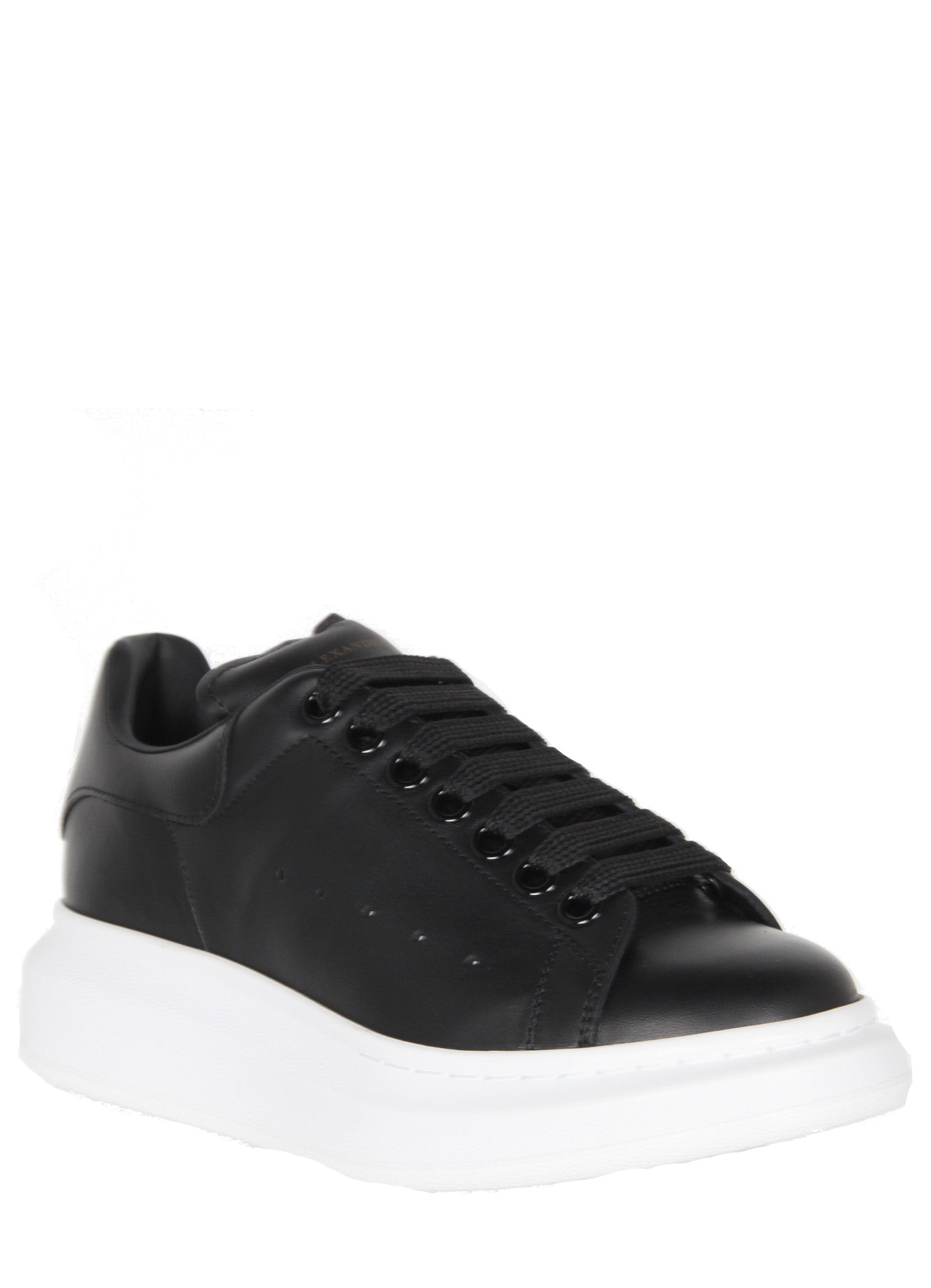 White leather paneled sneakers from Alexander McQueen featuring a round toe, a lace-up front fastening, a brand embossed tongue, a brand embossed insole and a white rubber exaggerated-sole. E = wide fit.
