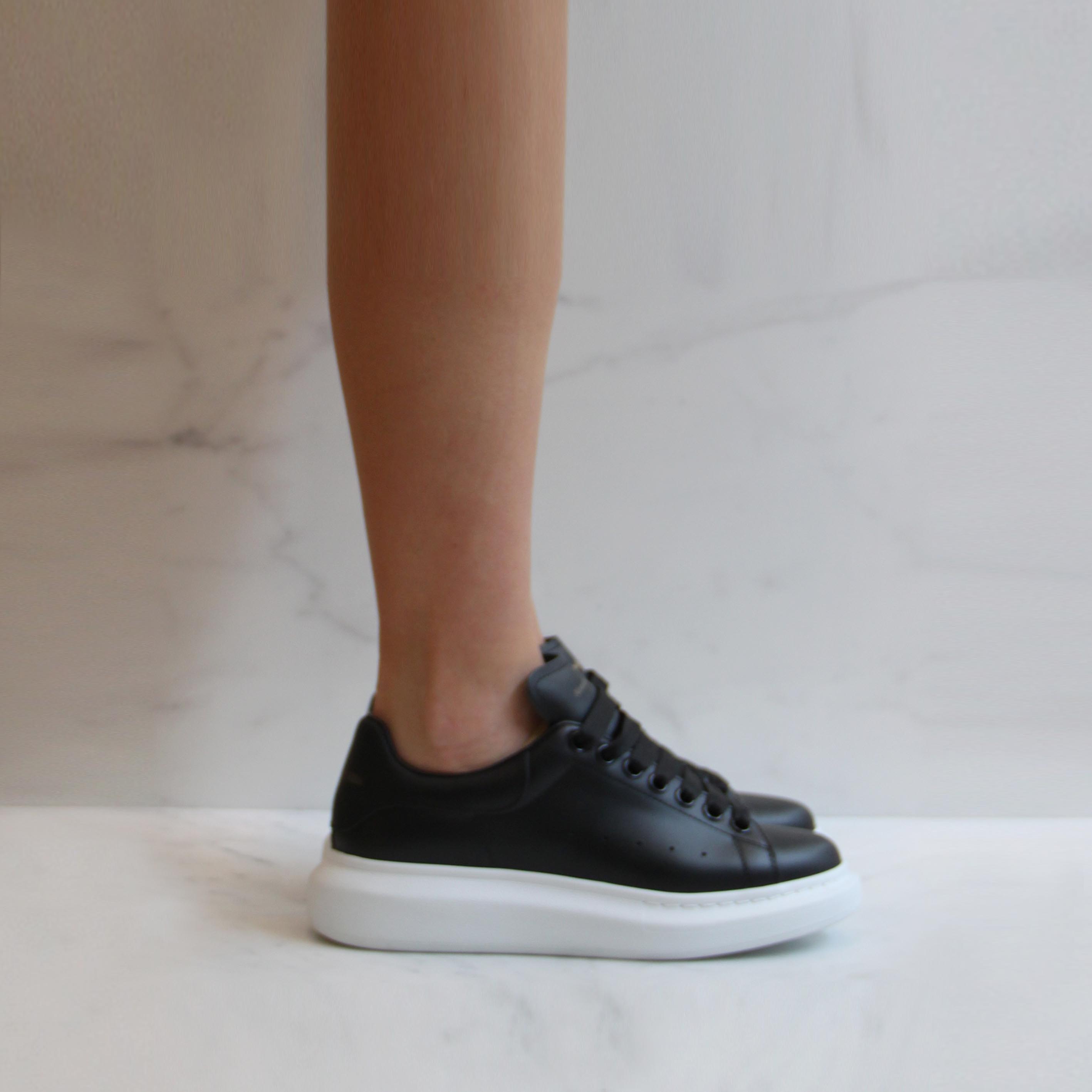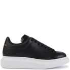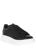 White leather paneled sneakers from Alexander McQueen featuring a round toe, a lace-up front fastening, a brand embossed tongue, a brand embossed insole and a white rubber exaggerated-sole.