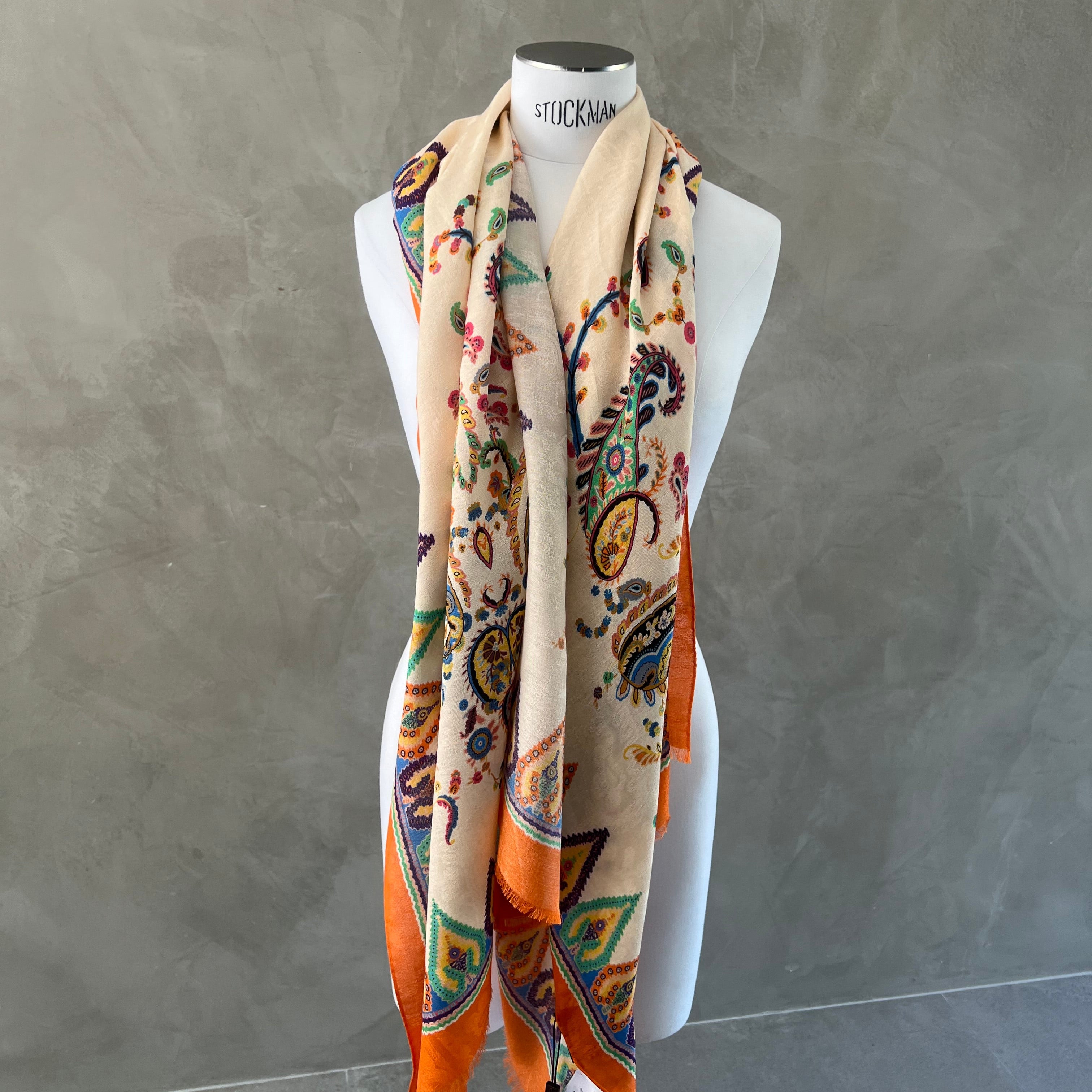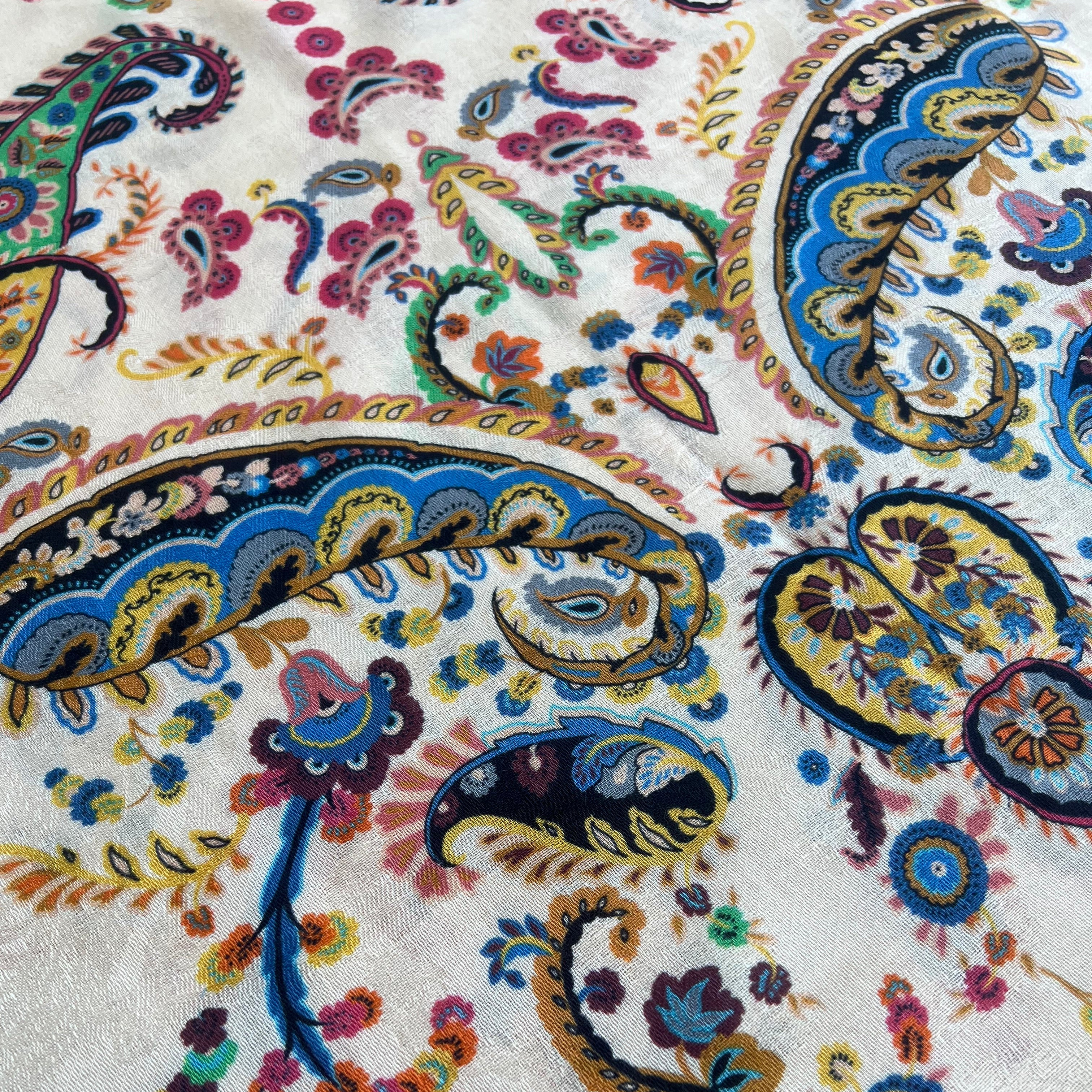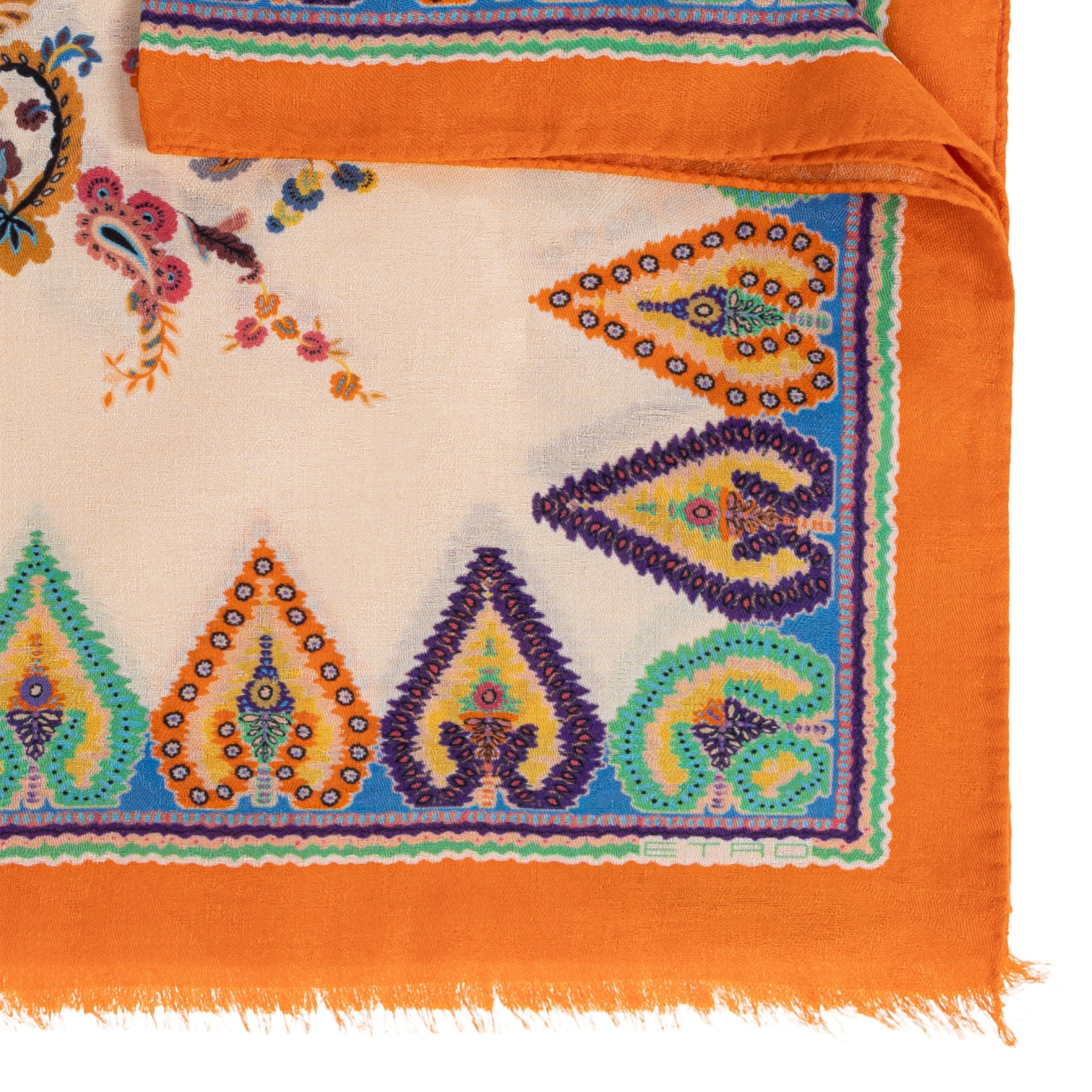 Modal and cotton-blend jacquard scarf embellished with floral-inspired Paisley pattern framed by a medallion motif with contrasting edges. The ETRO logo and slightly frayed short sides complete the design.