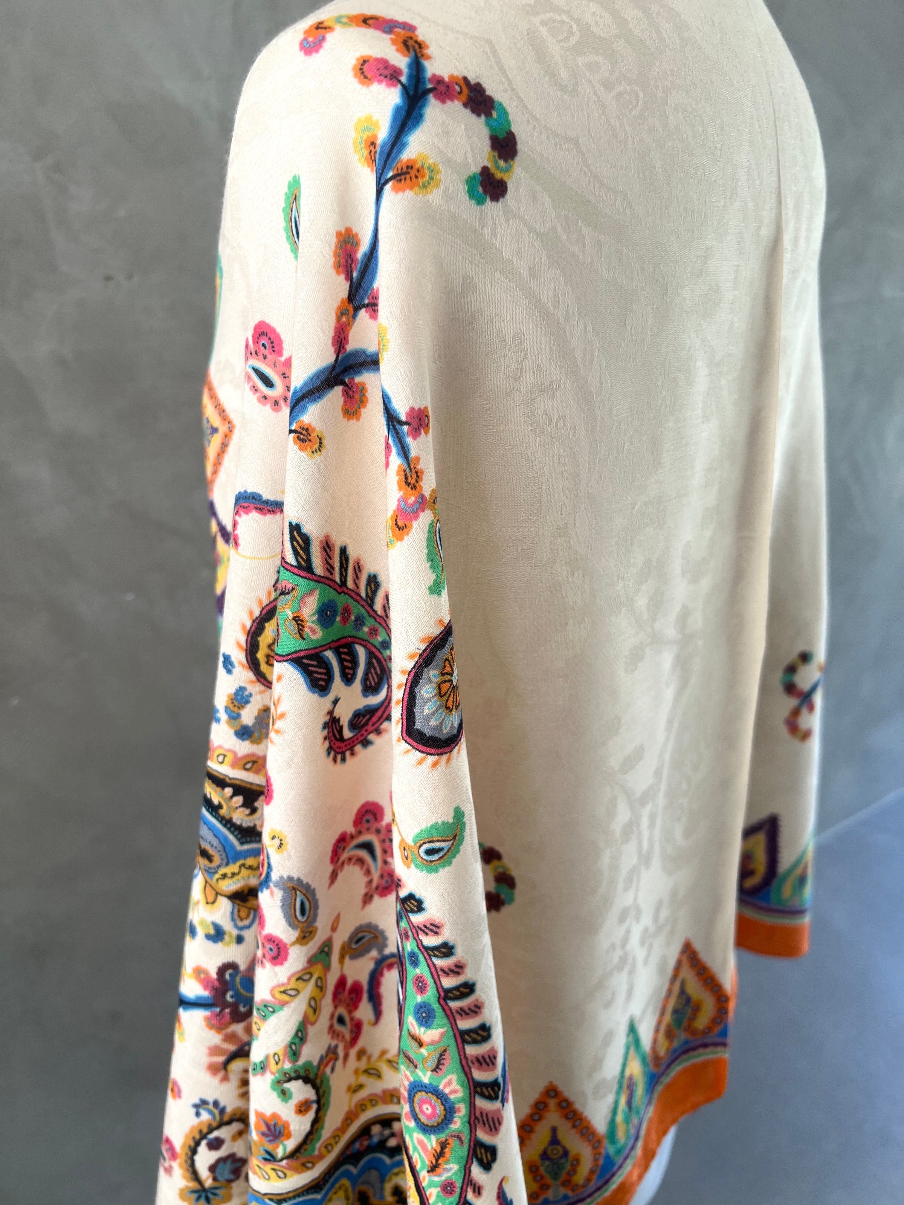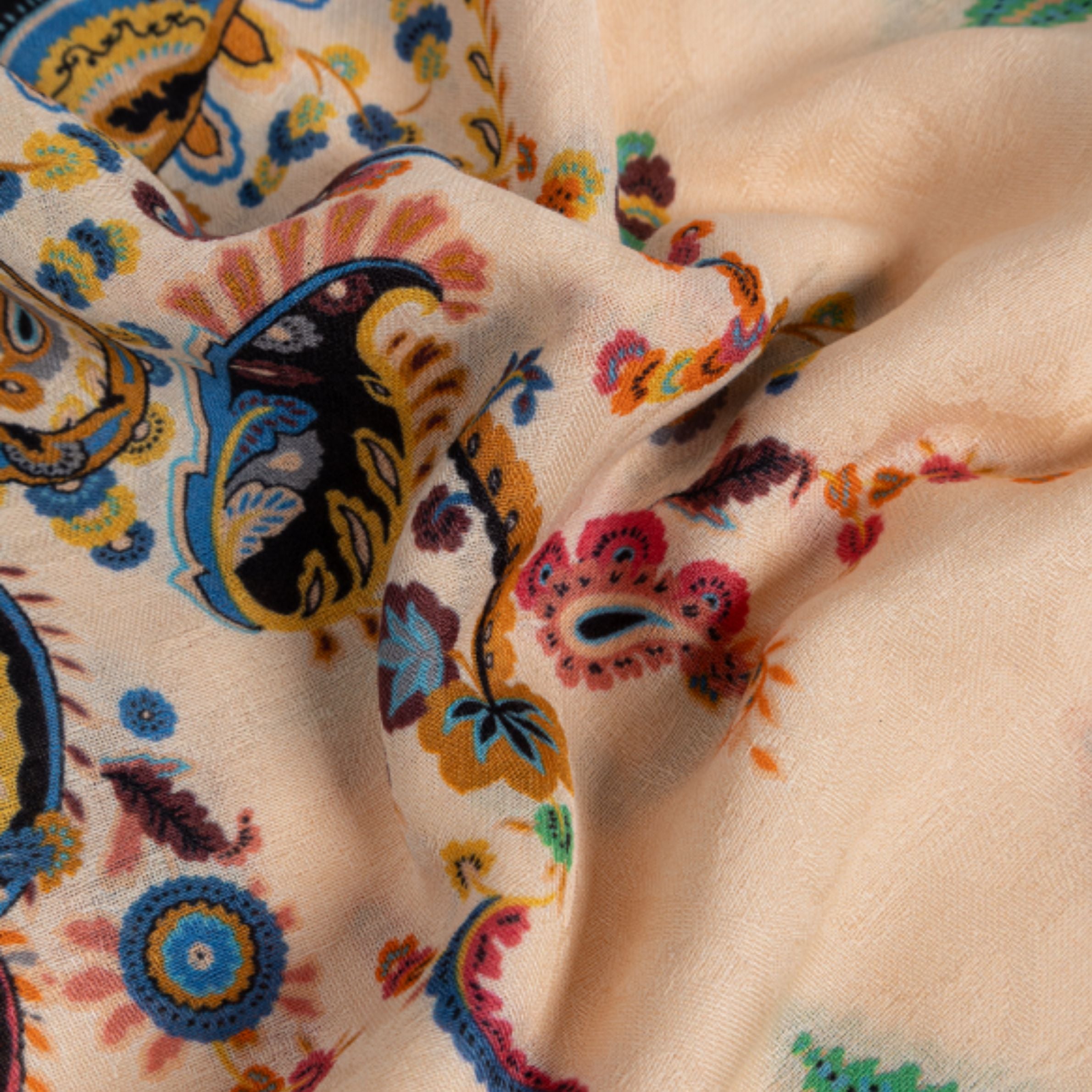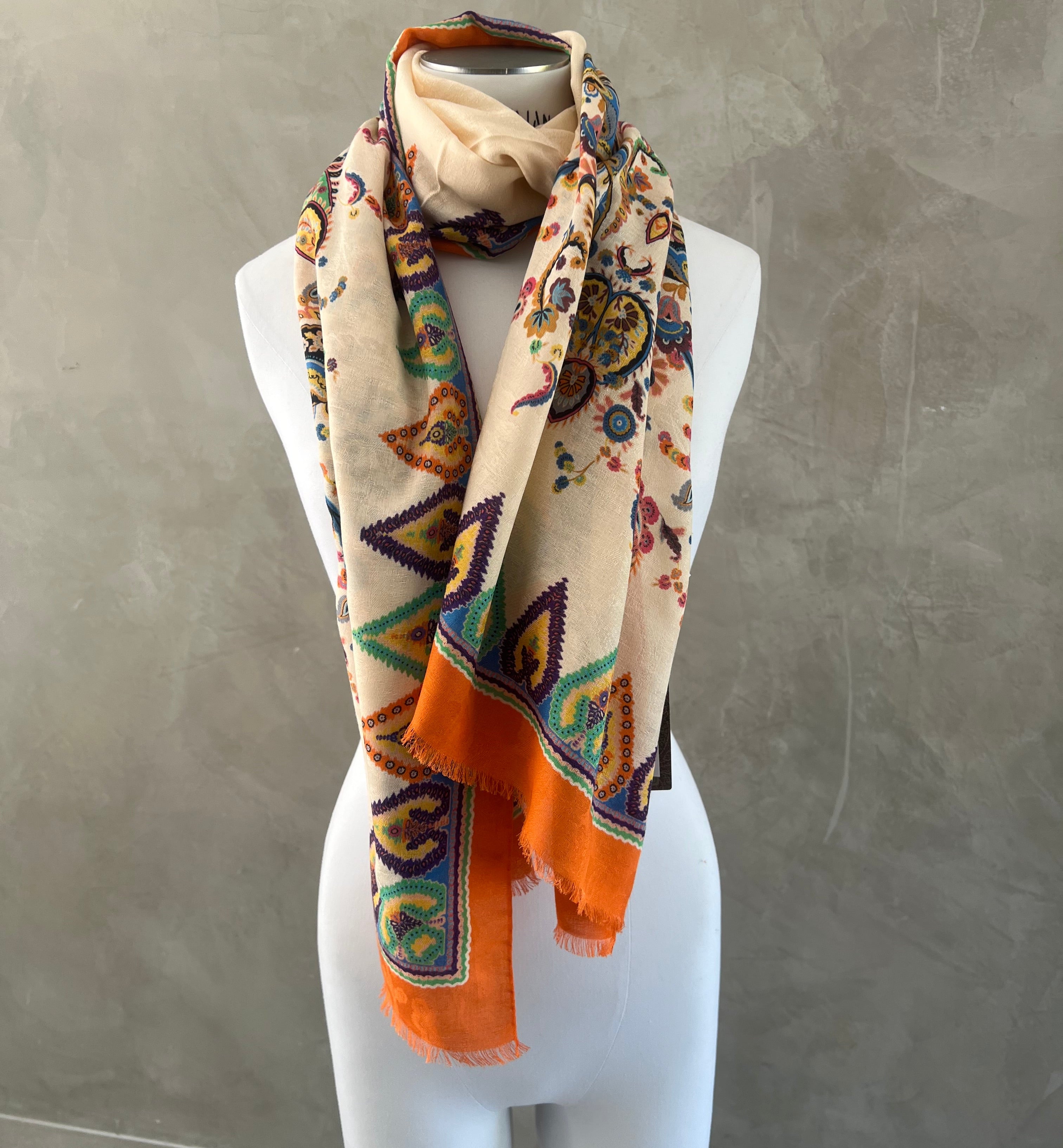 Modal and cotton-blend jacquard scarf embellished with floral-inspired Paisley pattern framed by a medallion motif with contrasting edges. The ETRO logo and slightly frayed short sides complete the design.