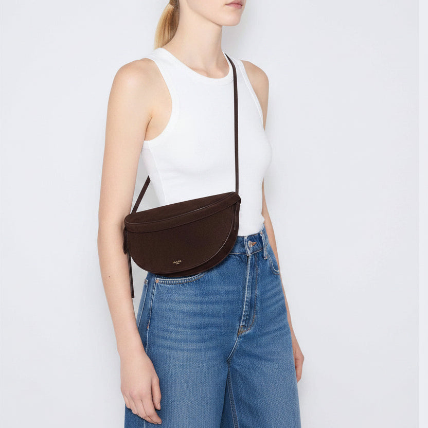 Molded curved shape bag that hugs the body. Features a box flap with magnetic closure and decorative ties with metallic rings. Can be worn cross body or on shoulder thanks to an adjustable handle.