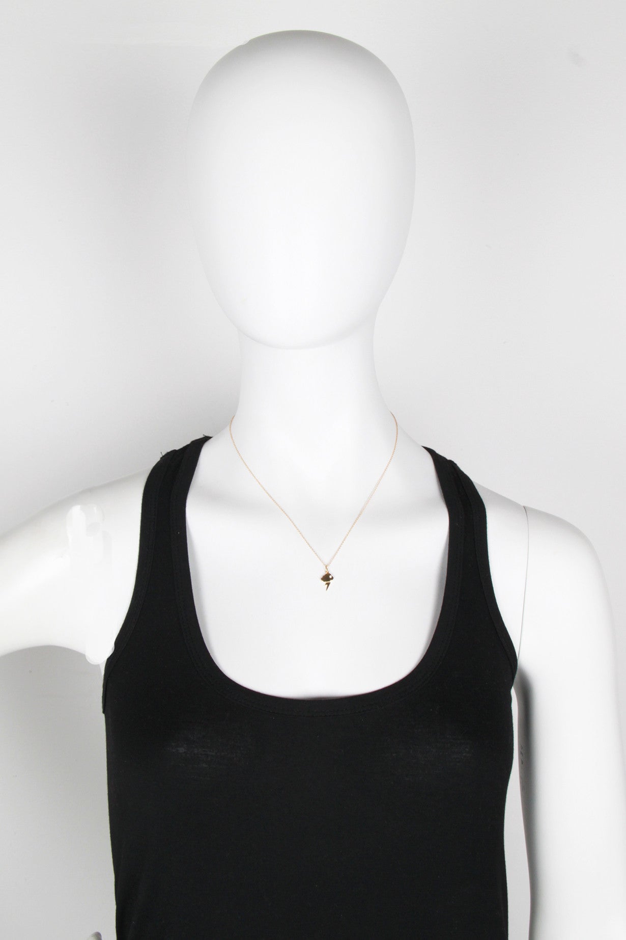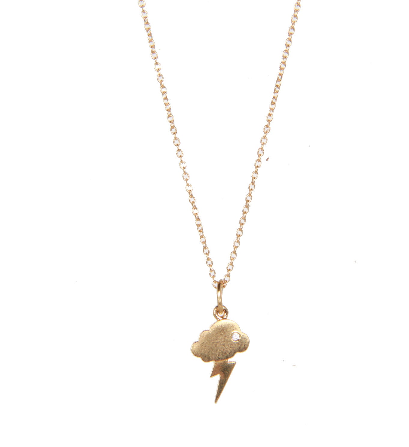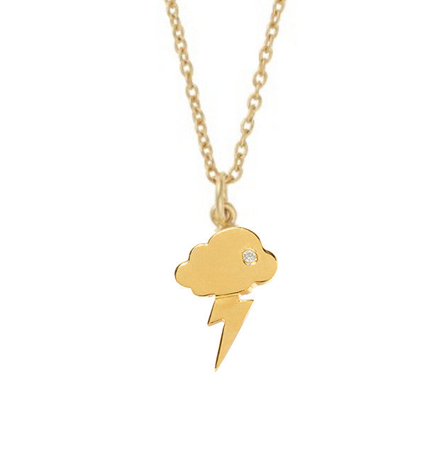 Punctuated by a thunder bolt and storm cloud pendant, this gold-plated piece is encrusted with a glittering crystal that gently catches the light.