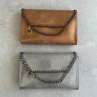 The bag is elevated with high-shine gold hardware, a long chain strap and a flap front for round-the-clock appeal. Framed with the iconic diamond-cut Falabella chain, the bag strikes a dichotomy of soft and tough lines.