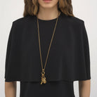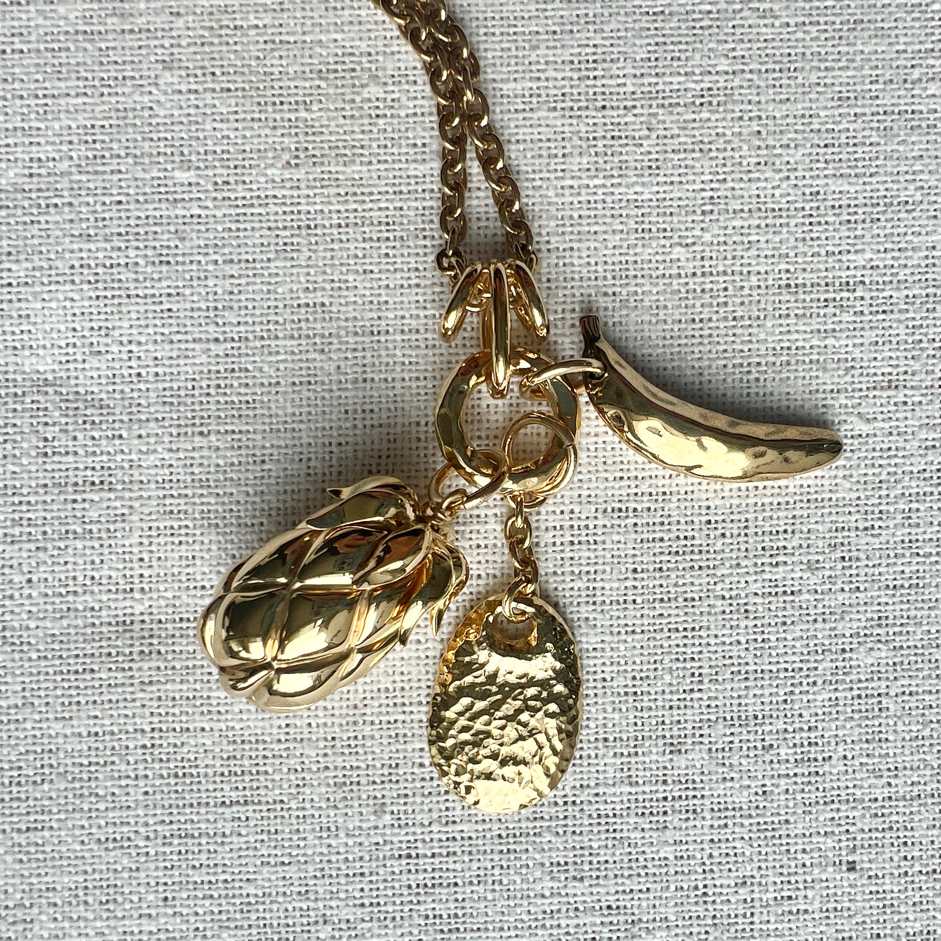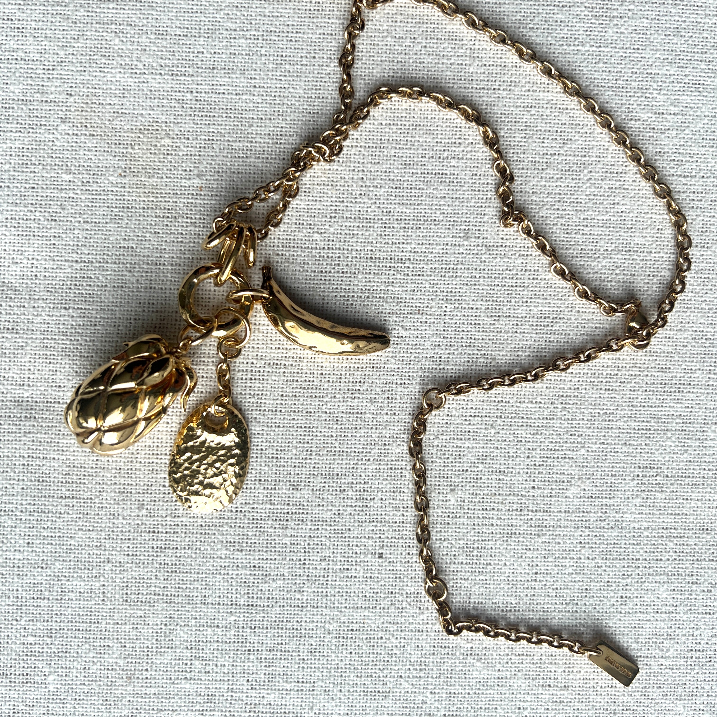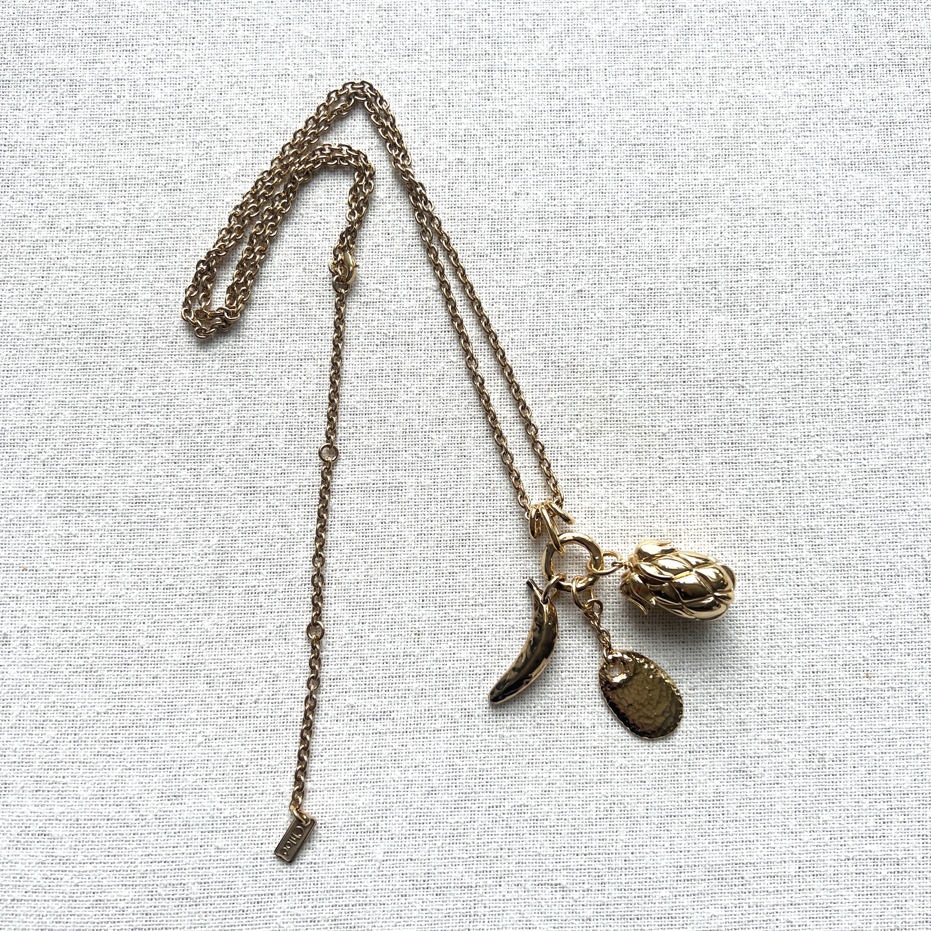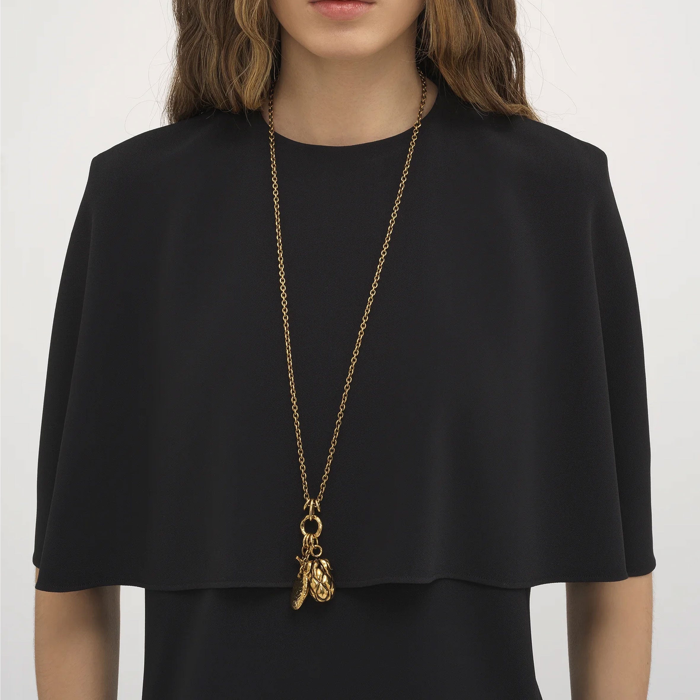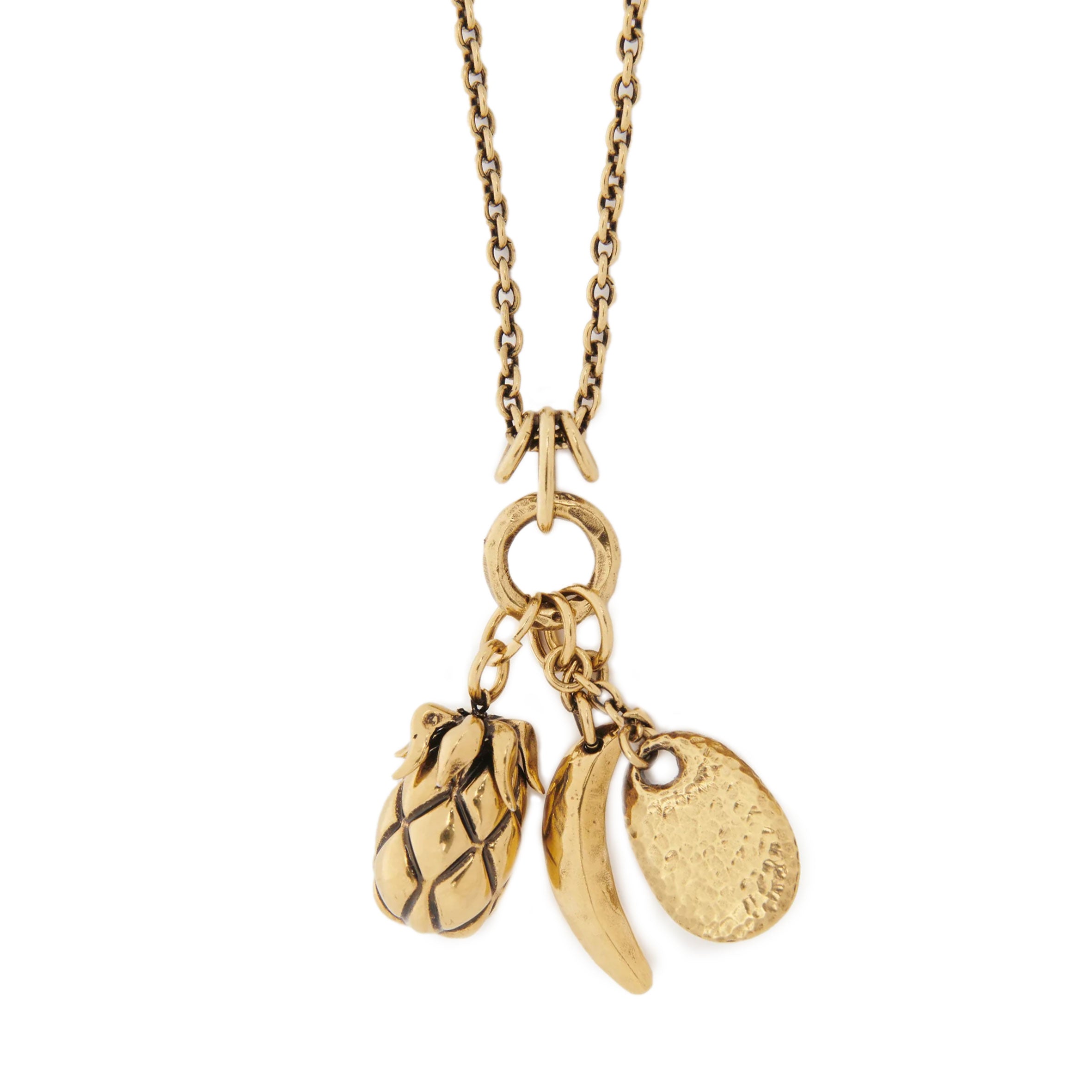 Chloé Fruits long necklace in vintage gold brass, featured on the runway. The long chain is set with a cluster of three pendants – a banana, pineapple and petal – in a nod to the Maison's heritage. The mix of gold and black tones creates texture.