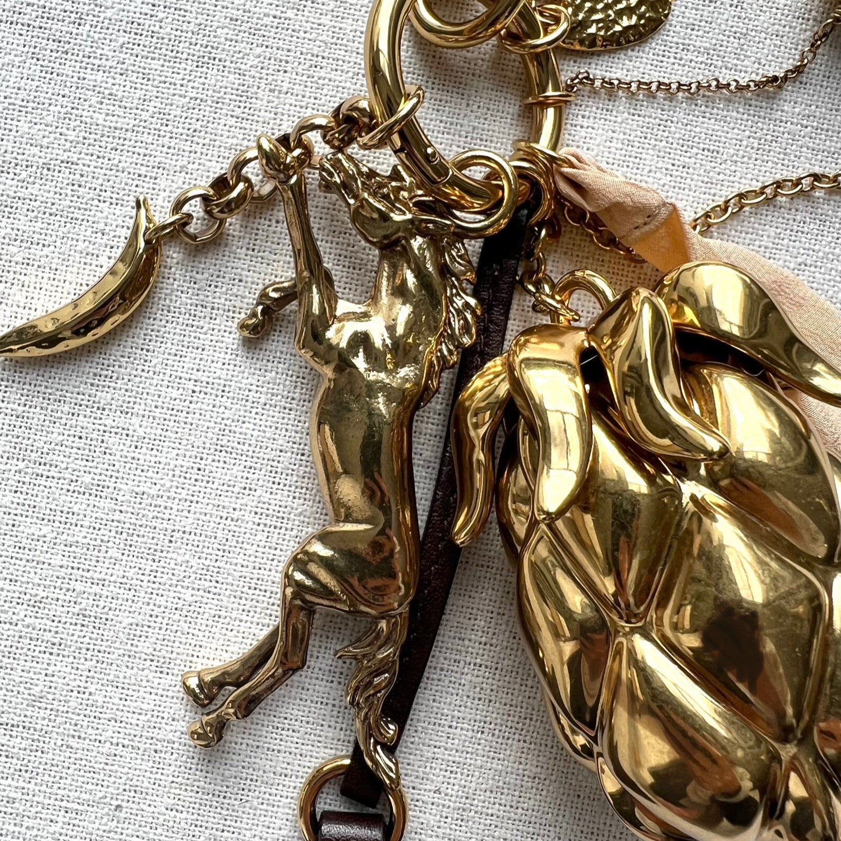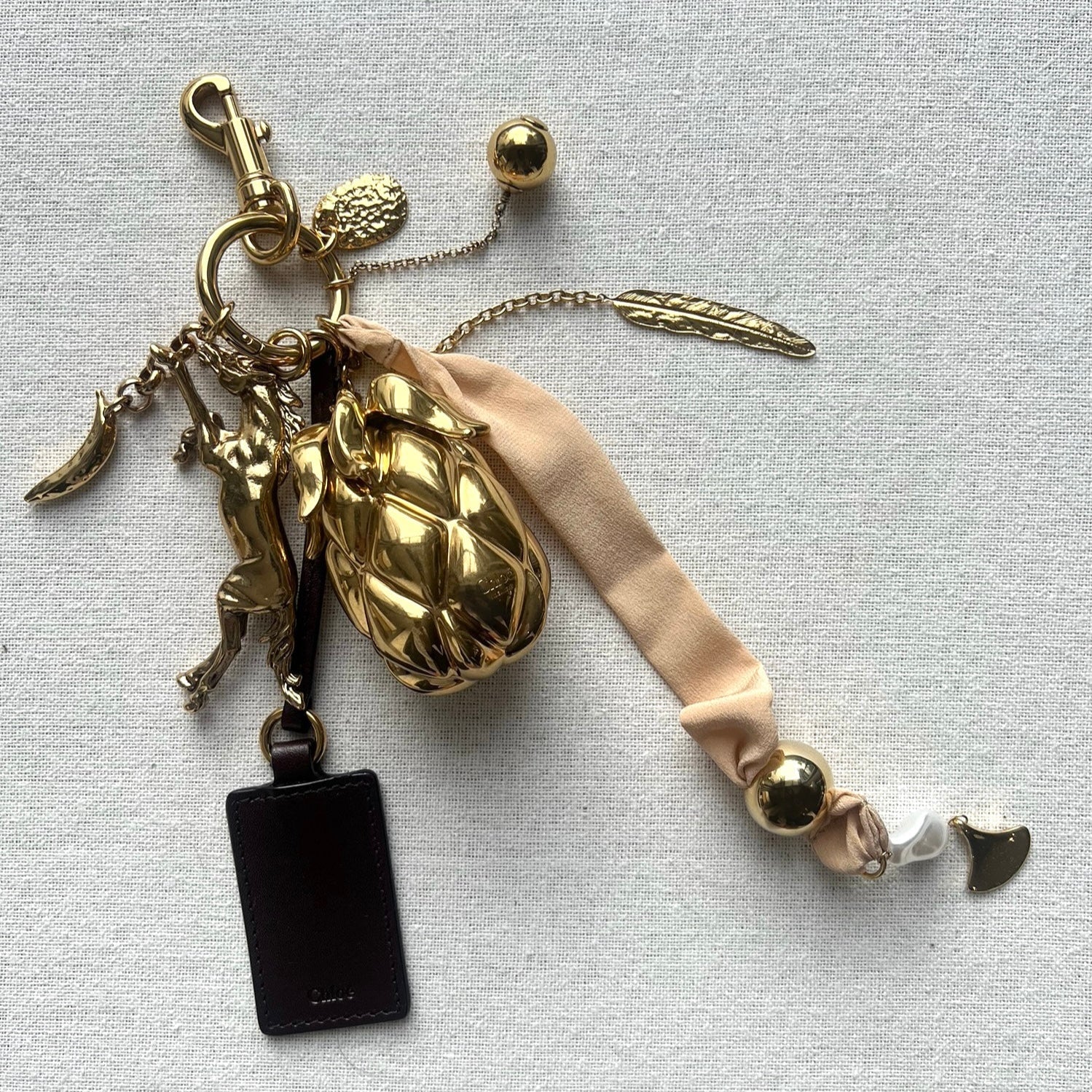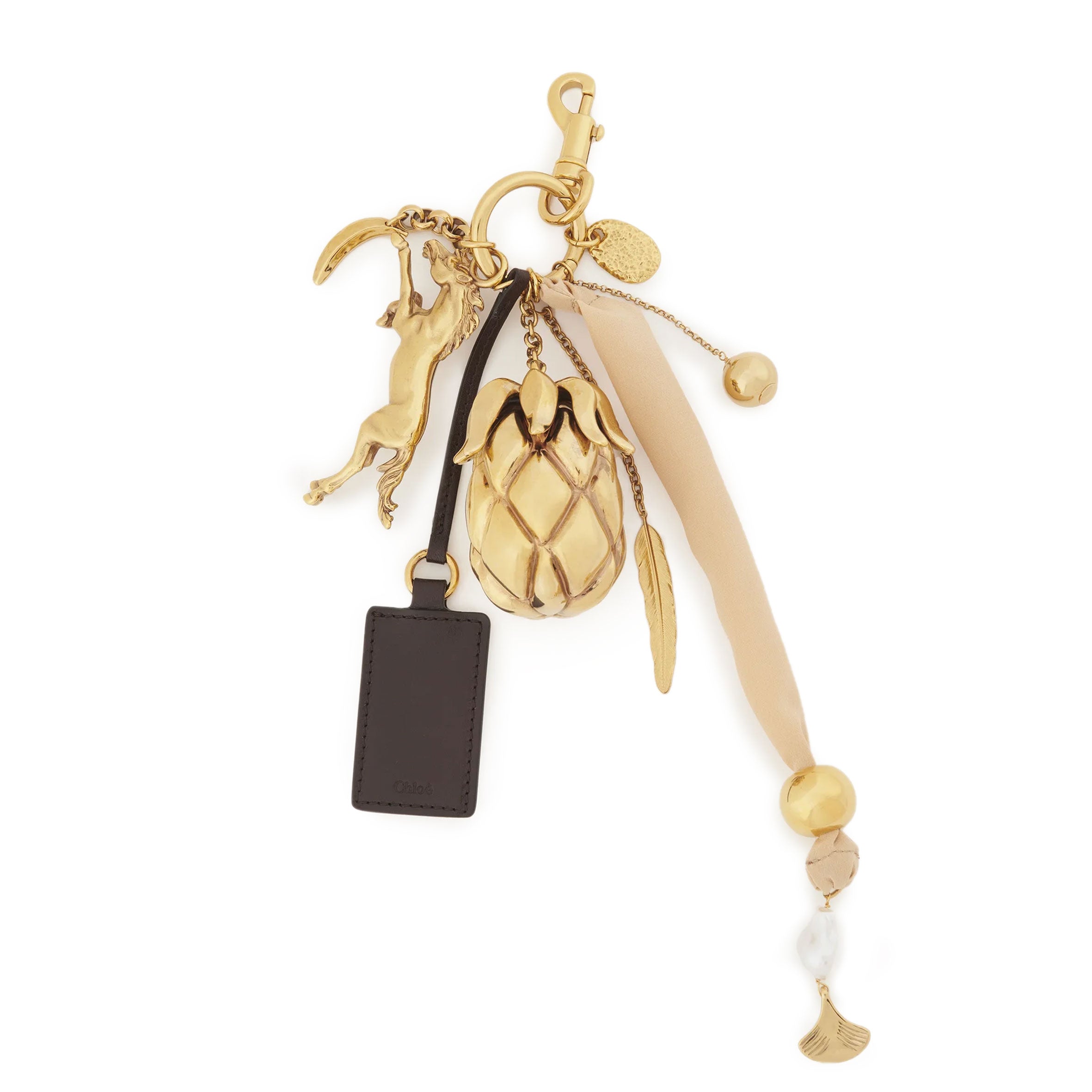 The Giga Pineapple bag charm combines ribbons of fabric with a leather tag, a gold brass pineapple and multiple miniature hanging pendants.