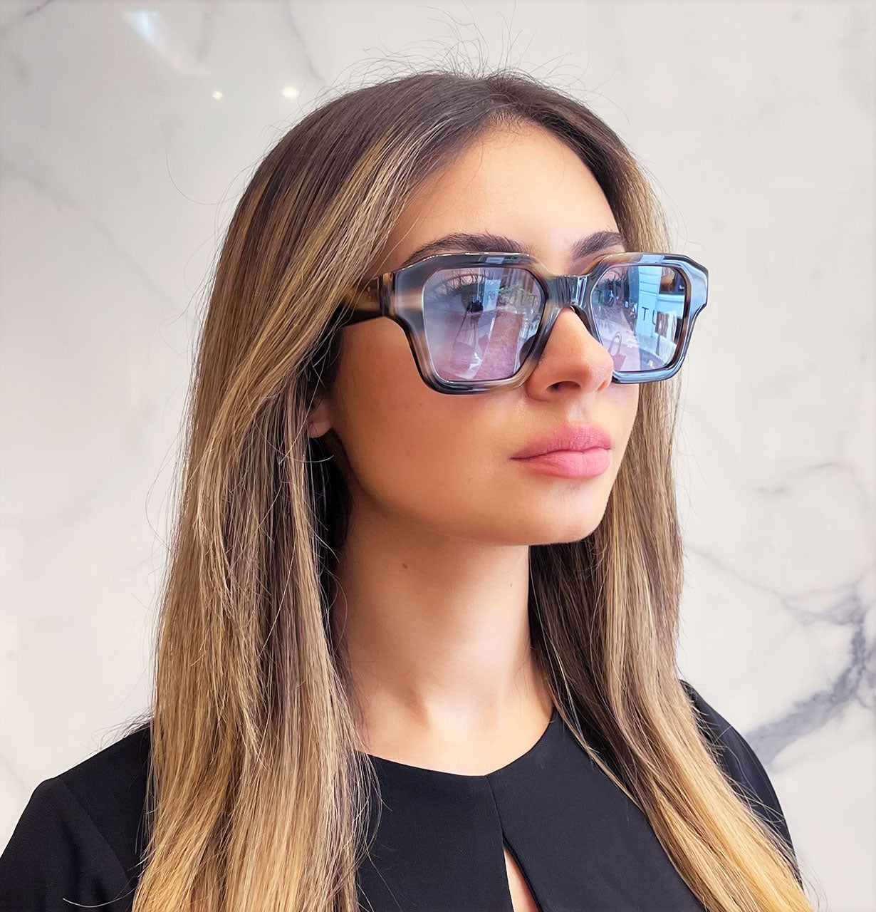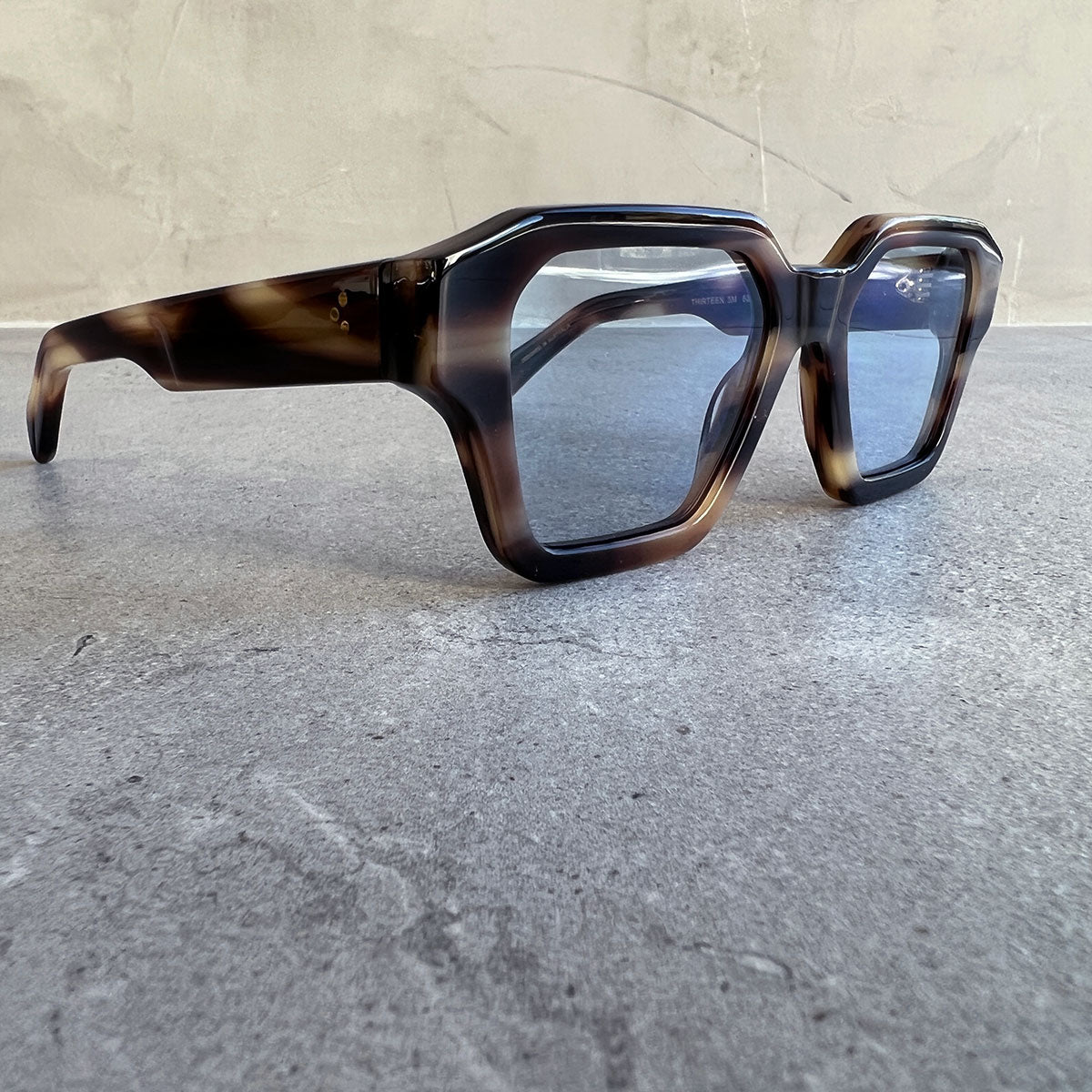 The THIRTEEN is a modern piece that takes cues from geometrical architecture. Its hexagonal shape is bold yet refined by its softened curves. With slightly thicker temples hand made from premium Mazzuchelli acetate and finished with eyelets for the option to add a chain.