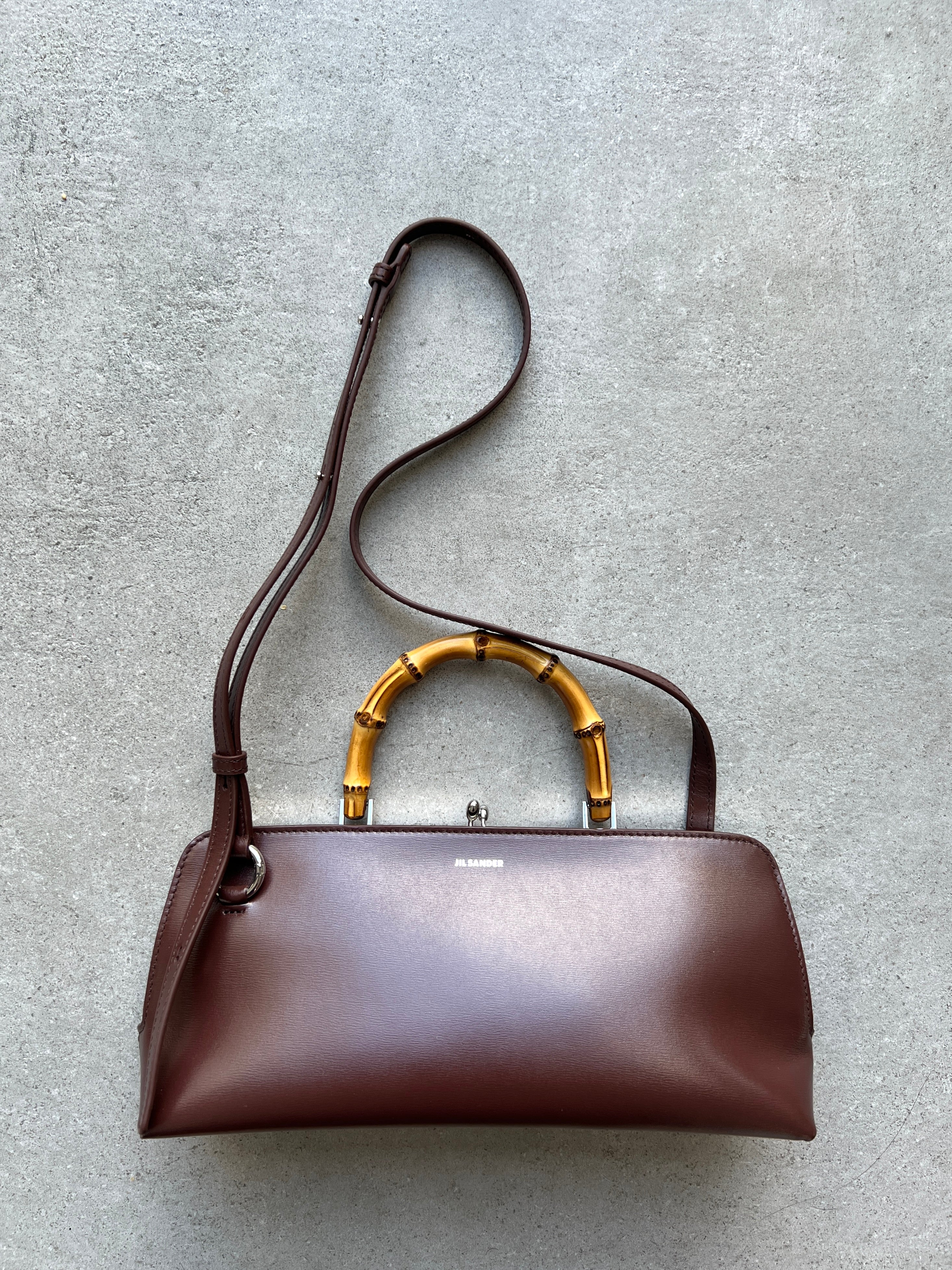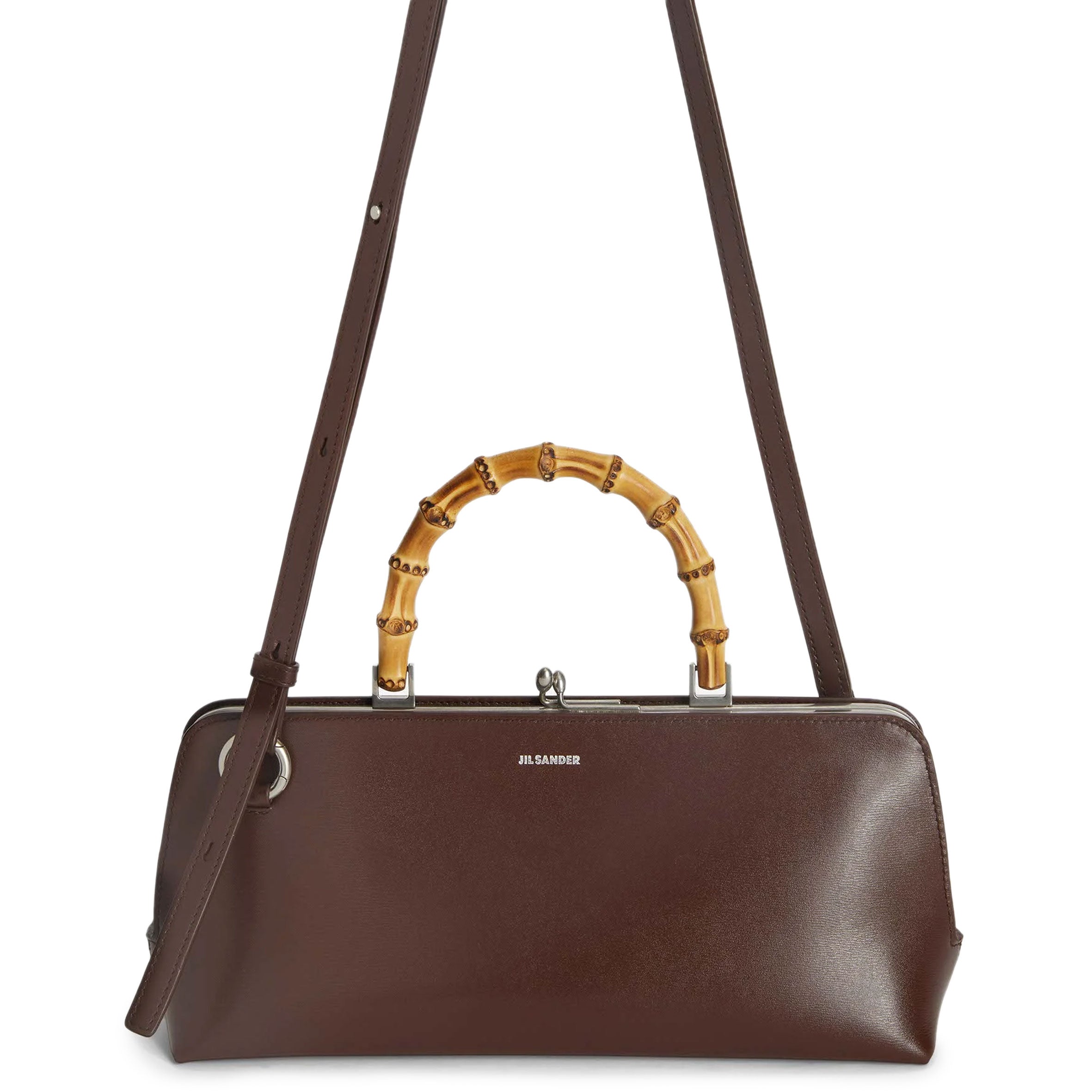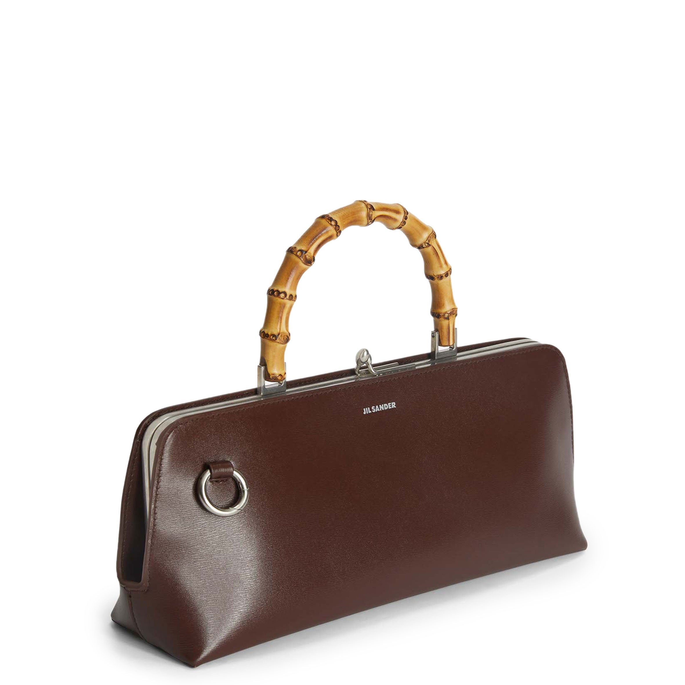 Small calf leather bag with metal frame detail and embossed Jil Sander logo. Leather strap with enamelled finishing and clutch closure with goji berry detail. Nappa lining with one interior zipped pocket and detachable strap. Foil embossed Jil Sander logo.