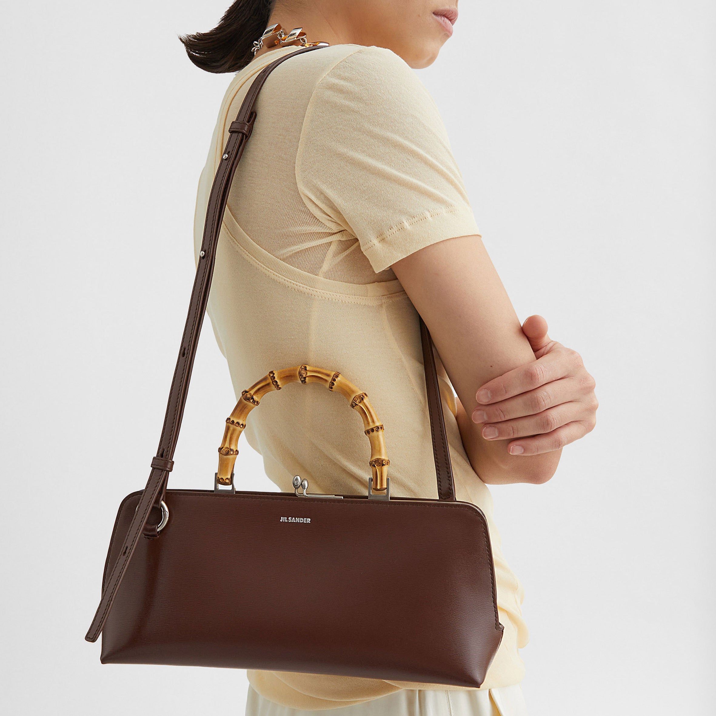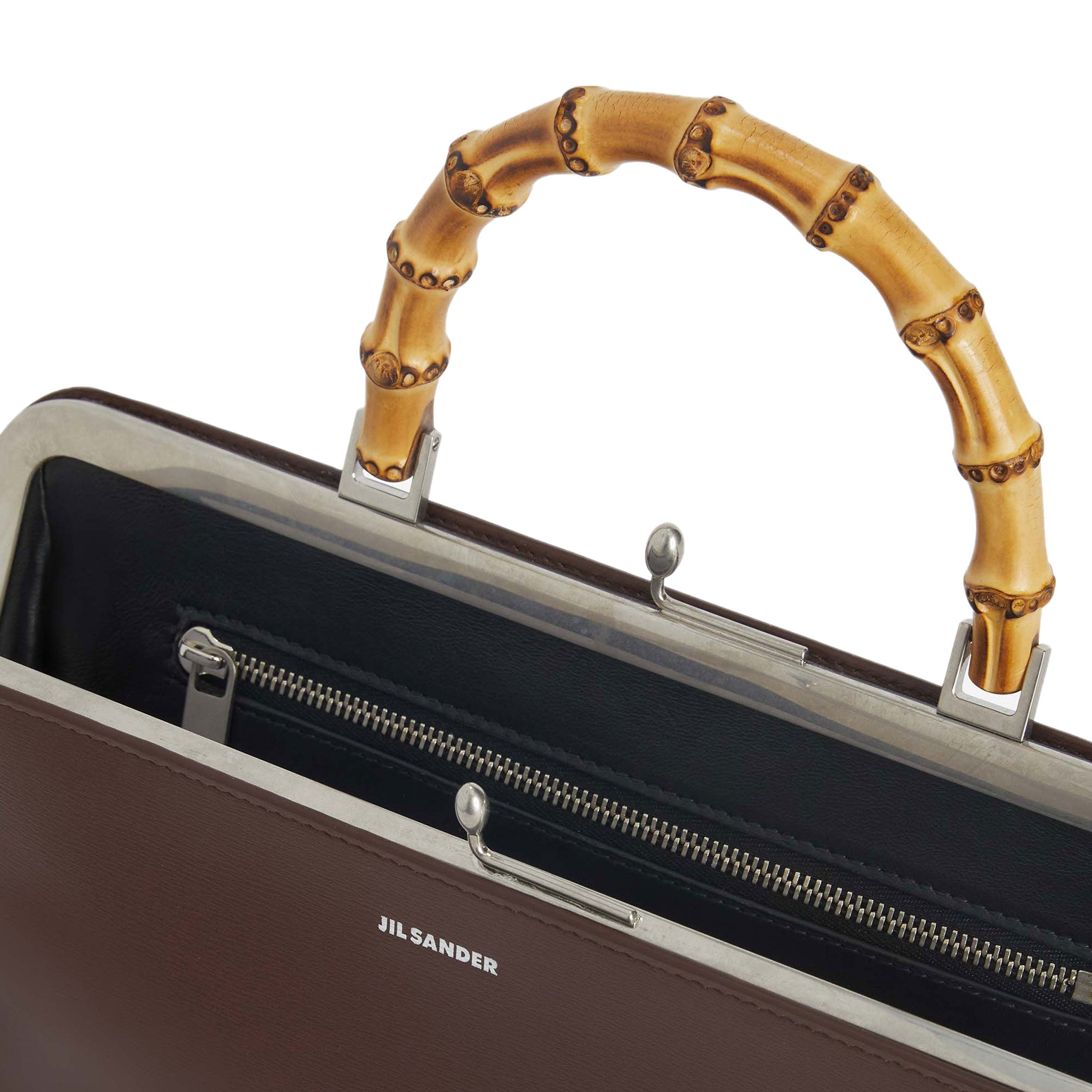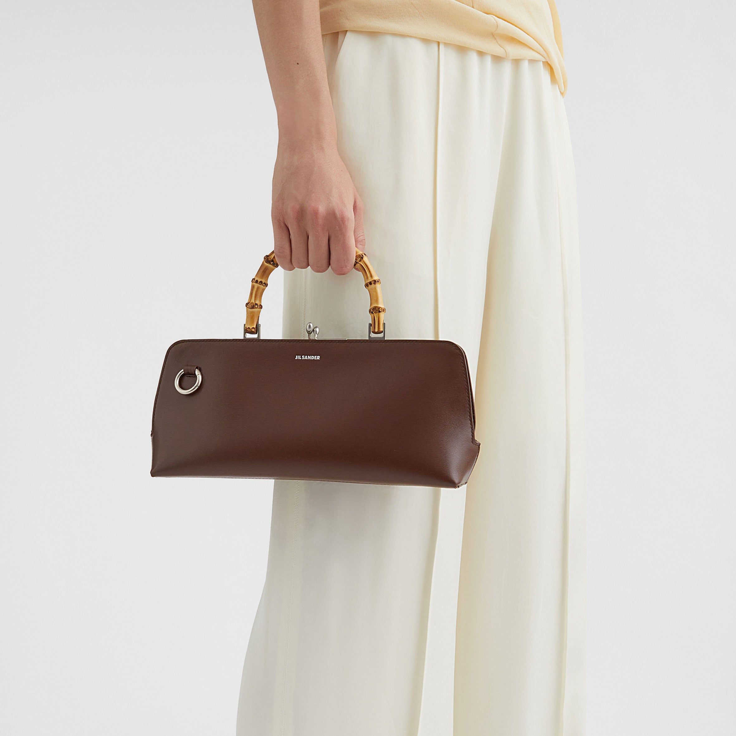 Small calf leather bag with metal frame detail and embossed Jil Sander logo. Leather strap with enamelled finishing and clutch closure with goji berry detail. Nappa lining with one interior zipped pocket and detachable strap. Foil embossed Jil Sander logo.