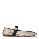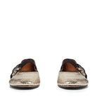 The Glide Slippers shine with gold printed lambskin leather and a silver metal buckle.