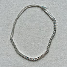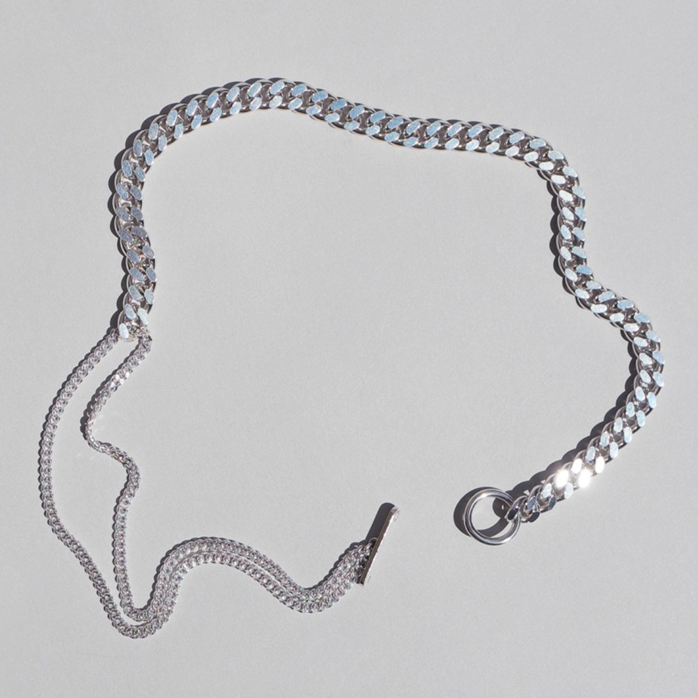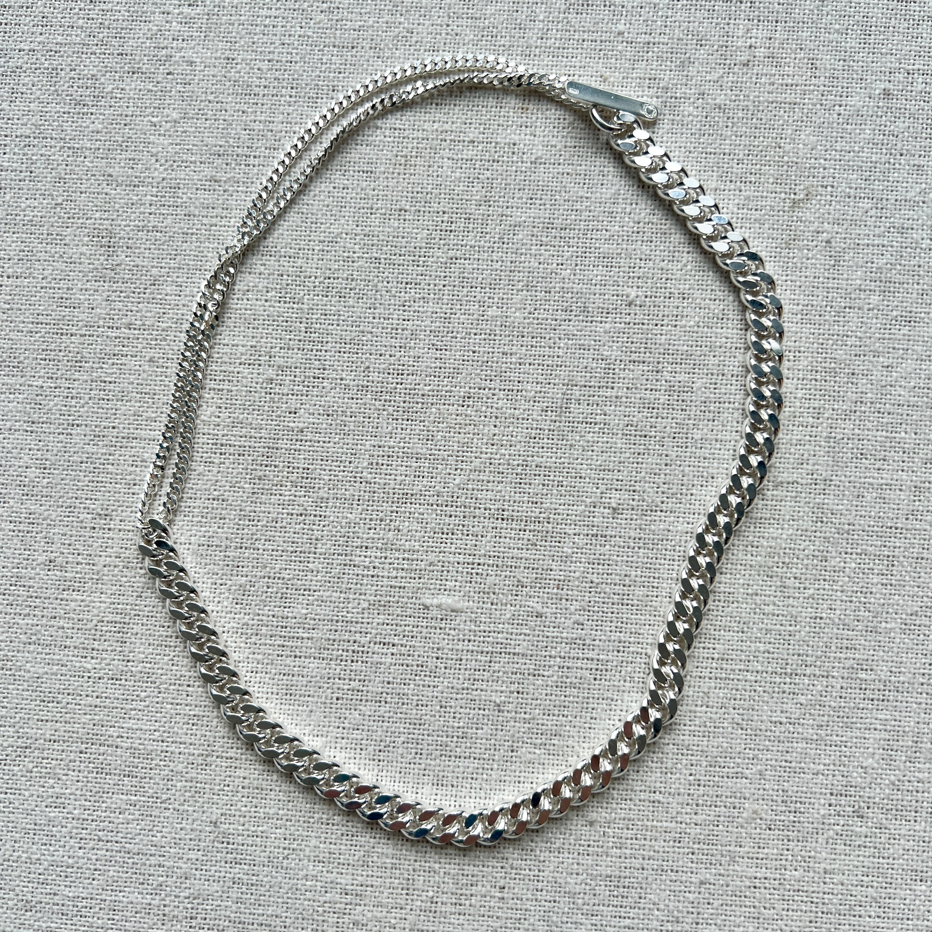A short silver necklace, made from a bolder and a more narrow curbed chain. Closes with a toggle.