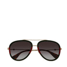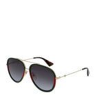 Trendy pilot metal shape, characterized by Gucci's signature red and green acetate frame, and metal arms. Small GG interlocking logo on temples, iconic Bumble Bee on the end tip and adjustable nose pads.
