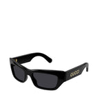 Gucci Logo sunglasses collection model GG1296S 001 featuring shiny solid black frame and black lens.