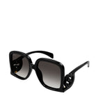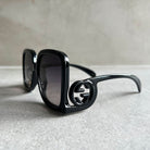 Gucci oversized Chaise Lounge sunglasses, collection model GG1326S 001, featuring shiny black rectangular frame and black lens with oversized tonal interlocking GG detail. Maxi GG Interlocking Logo integrated in both temples. Recognizable and extravagant shape.