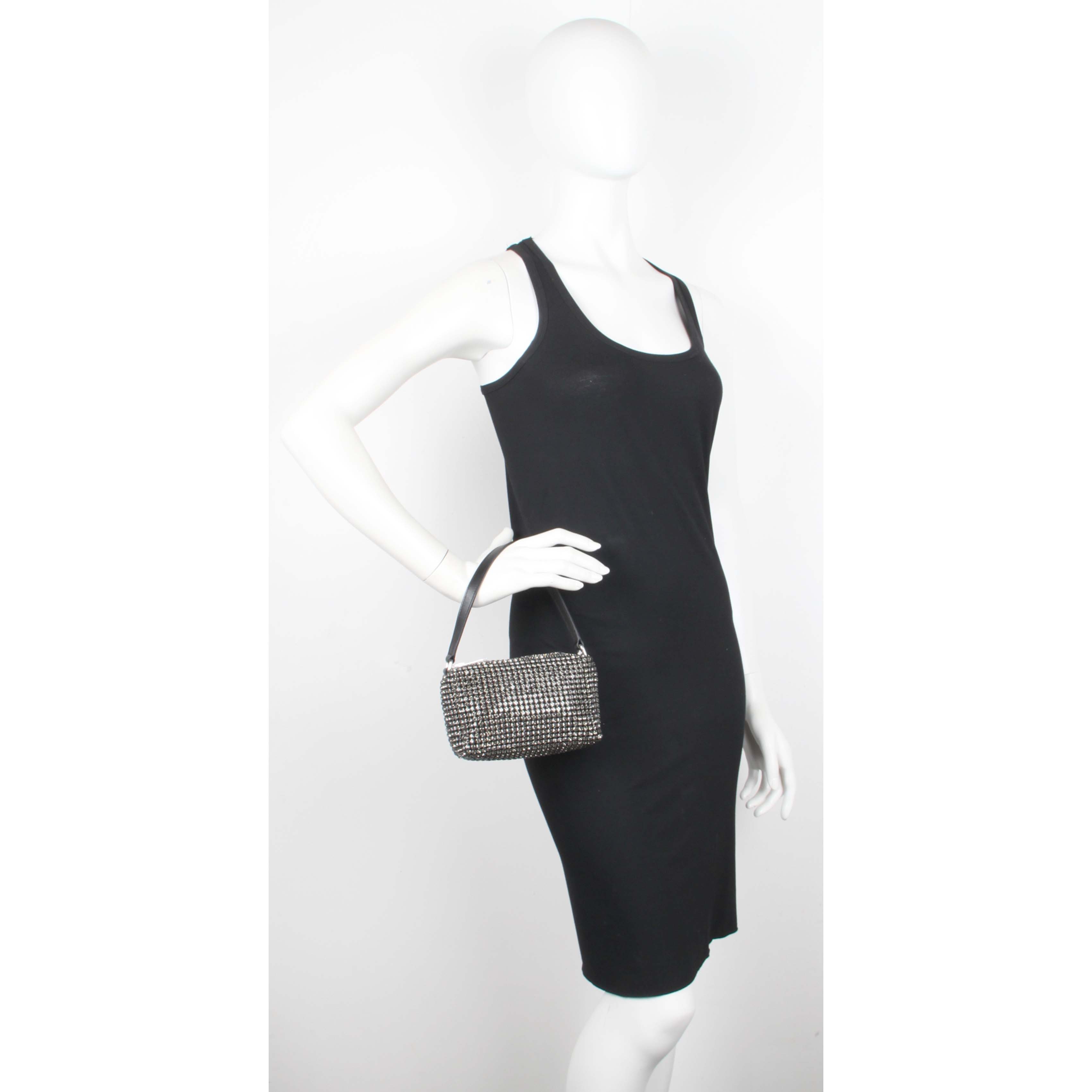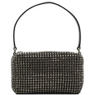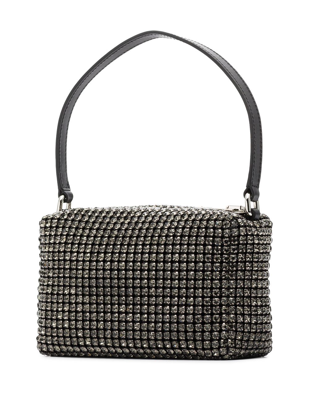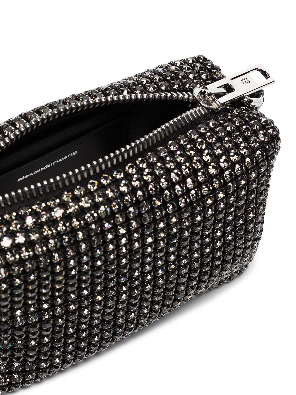 This medium pouch features crystal glass rhinestone embellishments and a statement zipper. The interior lining is made from nylon with an interior card slots. The handle is imprinted with the logo.