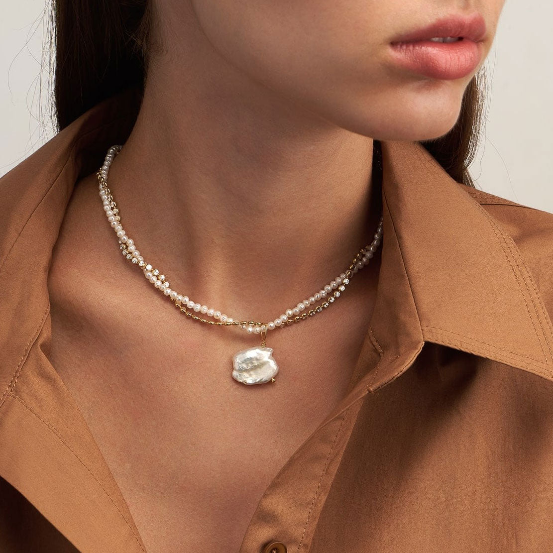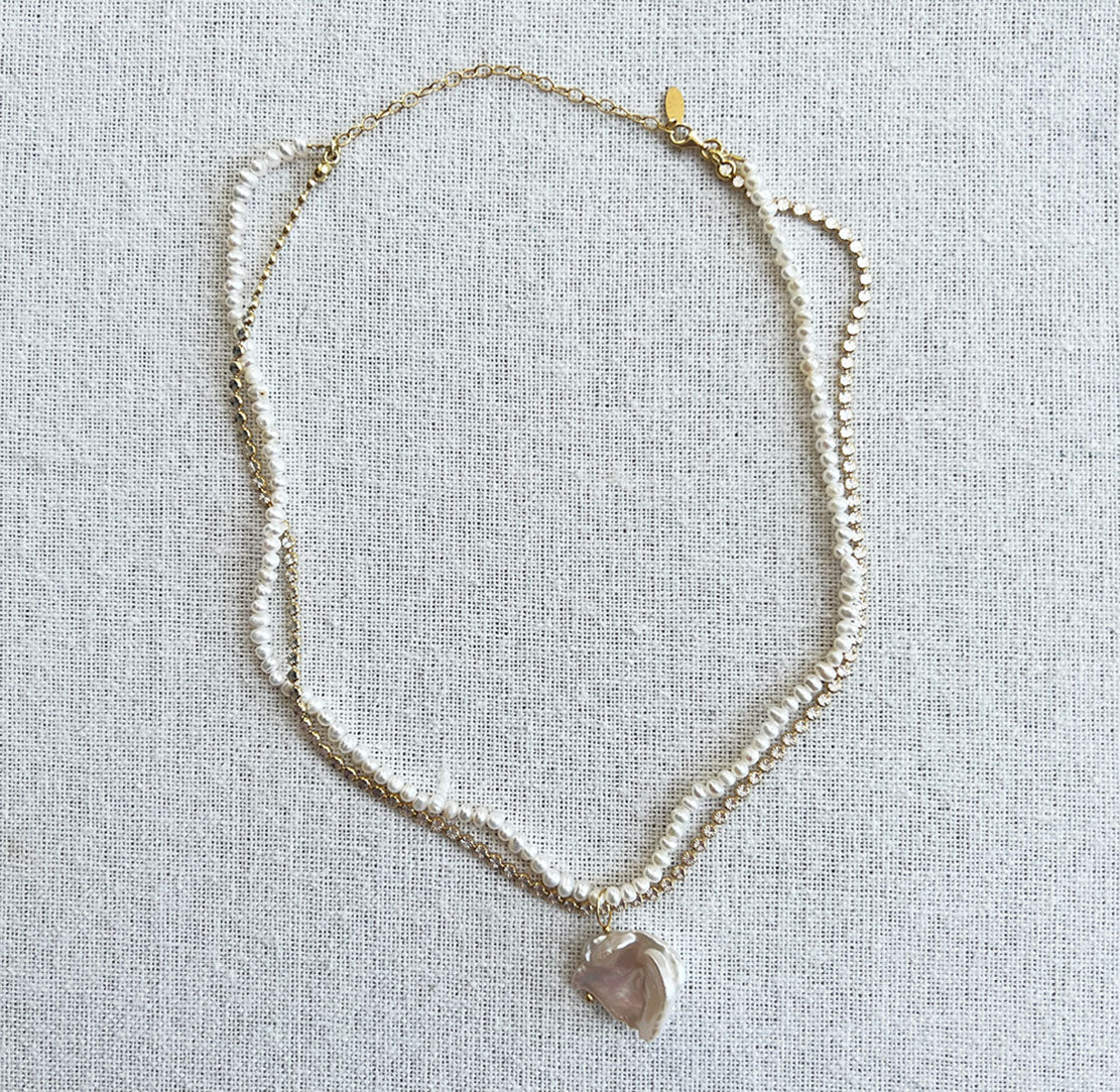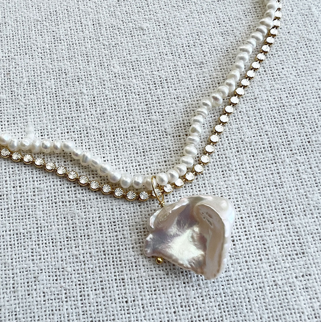 Layered freshwater pearl and Yellow gold sylvia chain embellished with baroque pearl pendant.