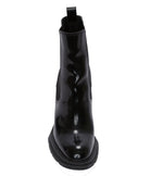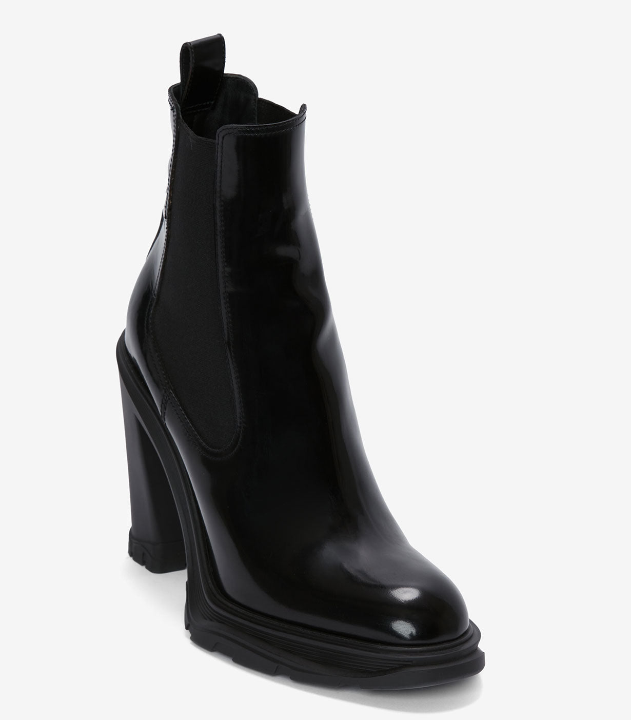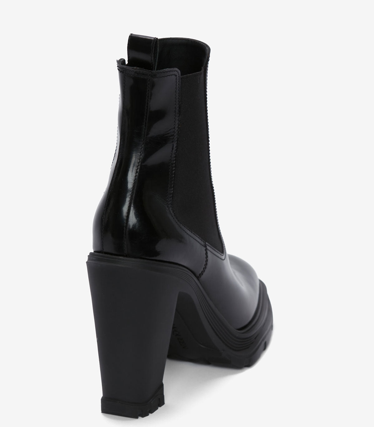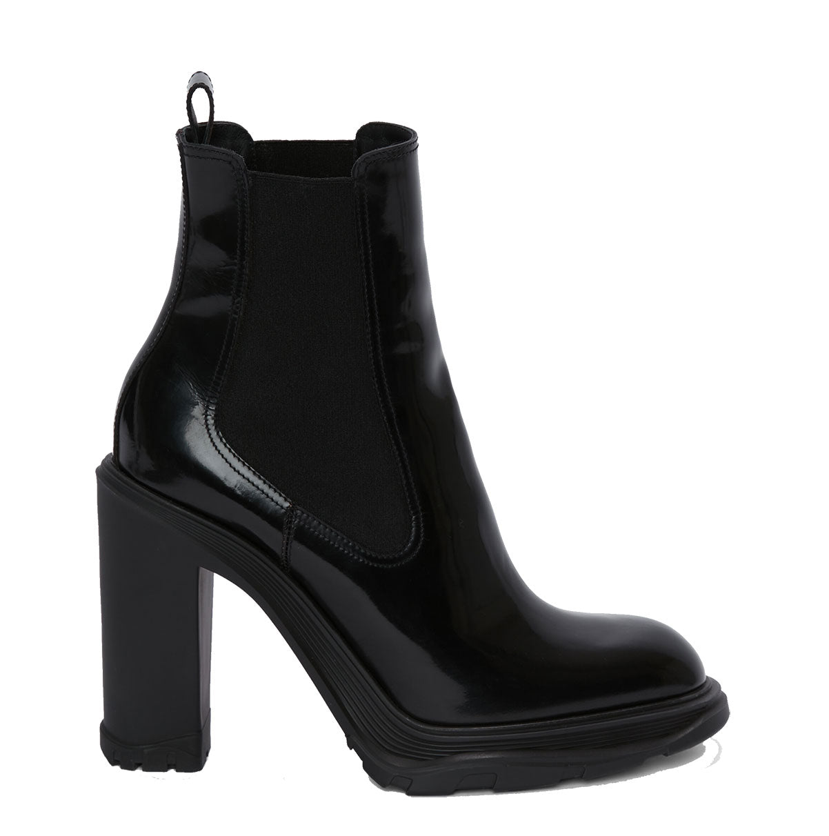 Black shine brush-off leather Chelsea boot with a thick rubber tread sole and stacked heel. The boot features tonal elastic side panels. Boot silhouette with a round toe shape. Finished with an Alexander McQueen signature on the sole.