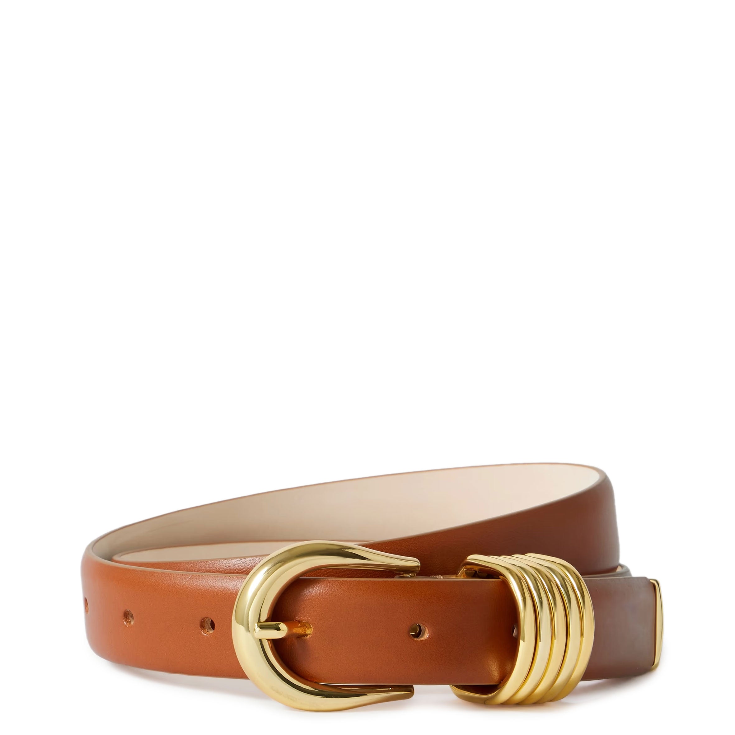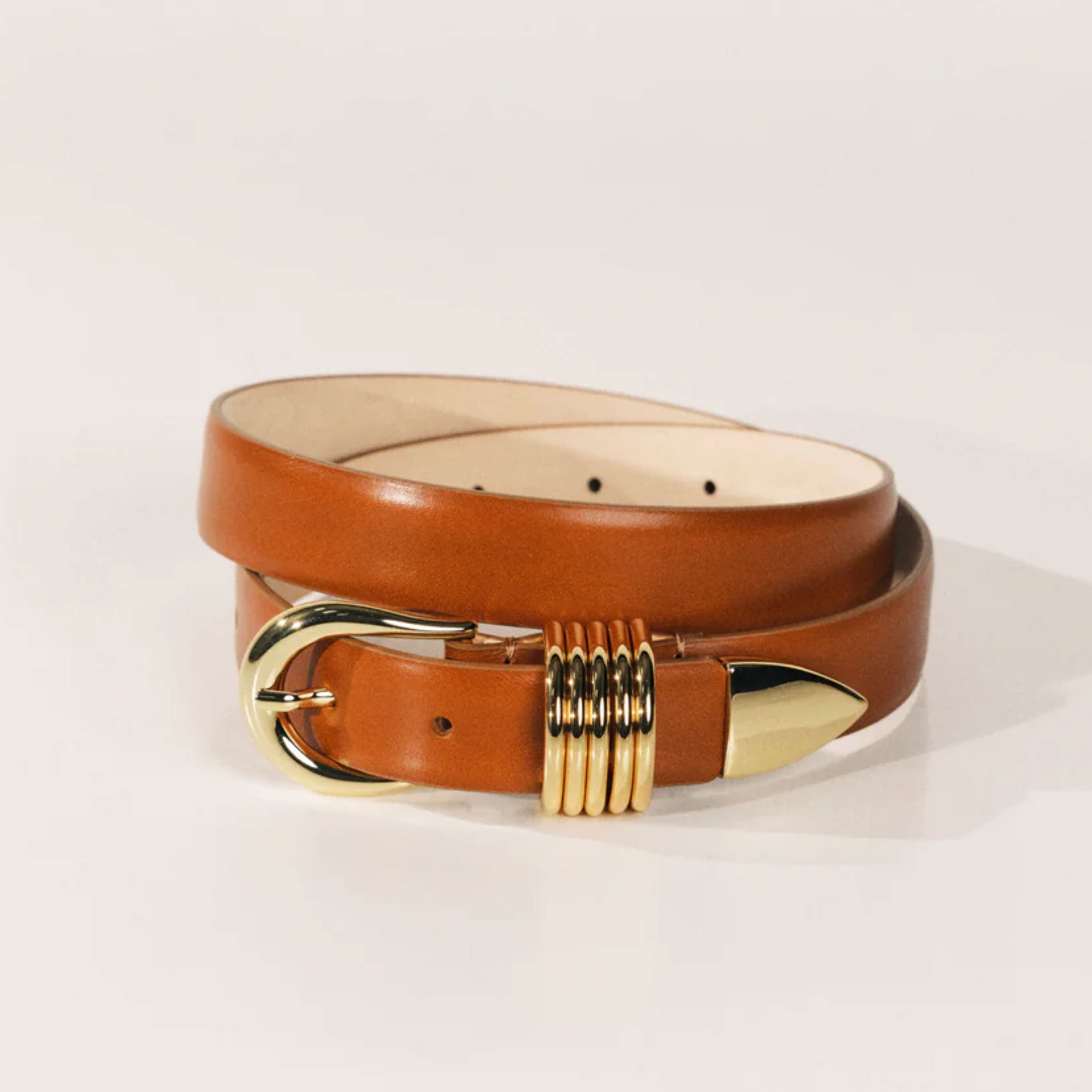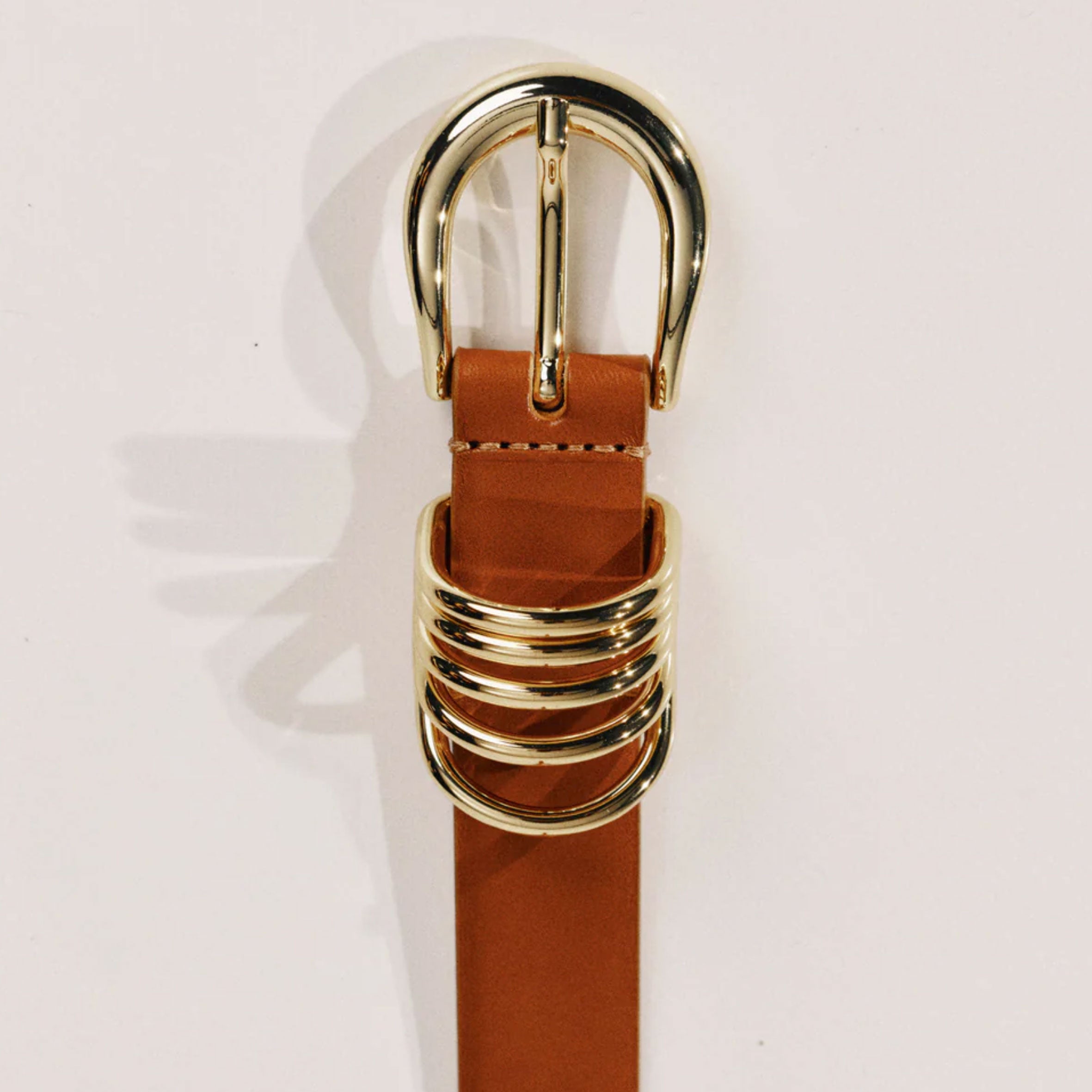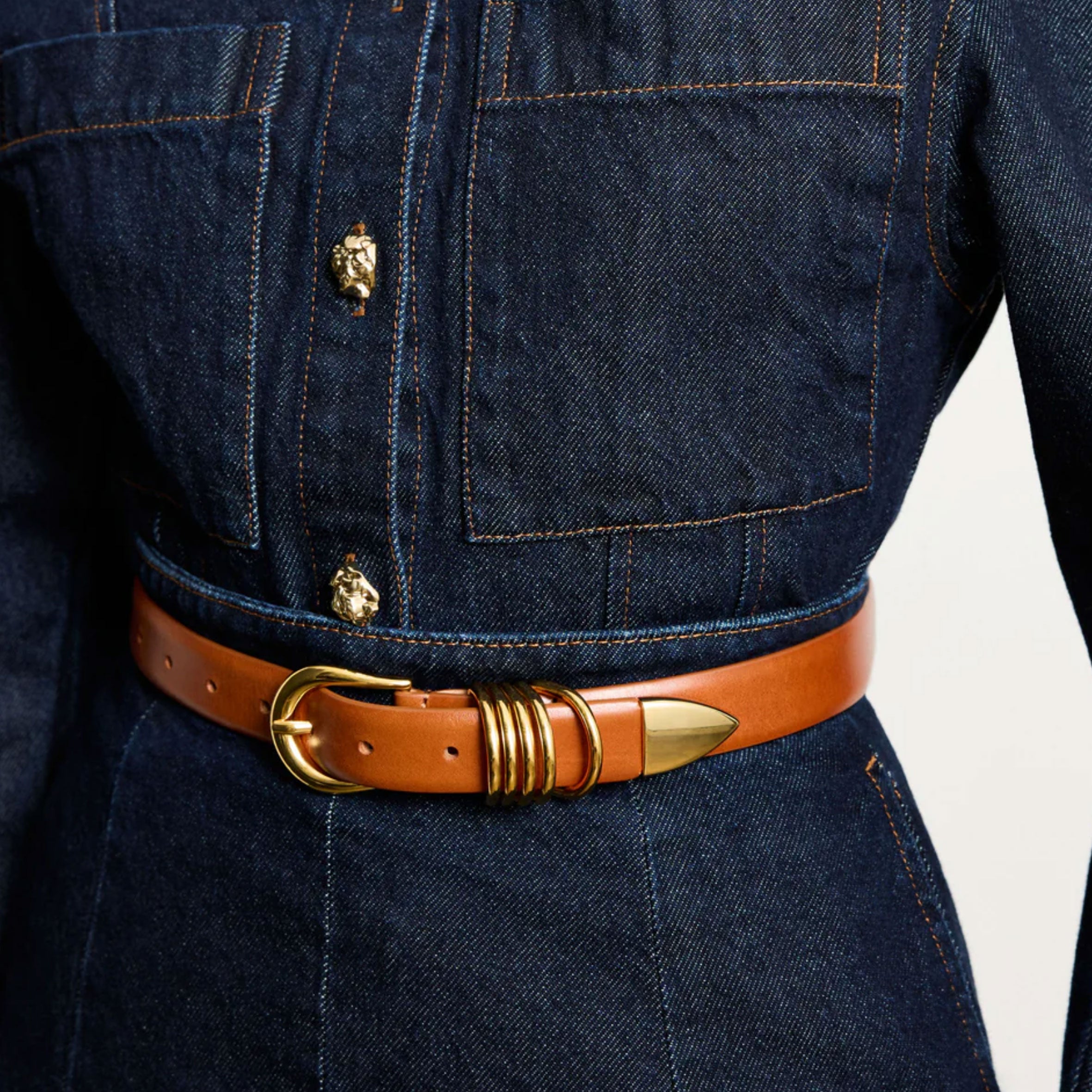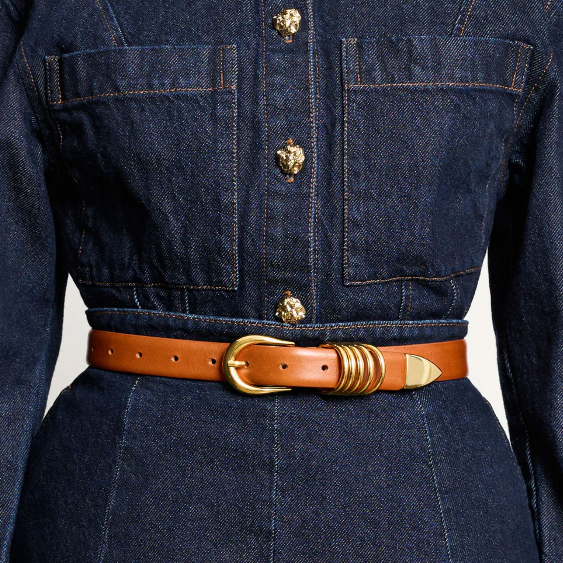 Déhanche's signature style featuring 10 holes to accommodate a broader range of sizes. Meticulously crafted from Italian leather and 24K gold hardware. This belt showcases a trio design composed of a rounded buckle, 5 demi rings, and a tipped accent.