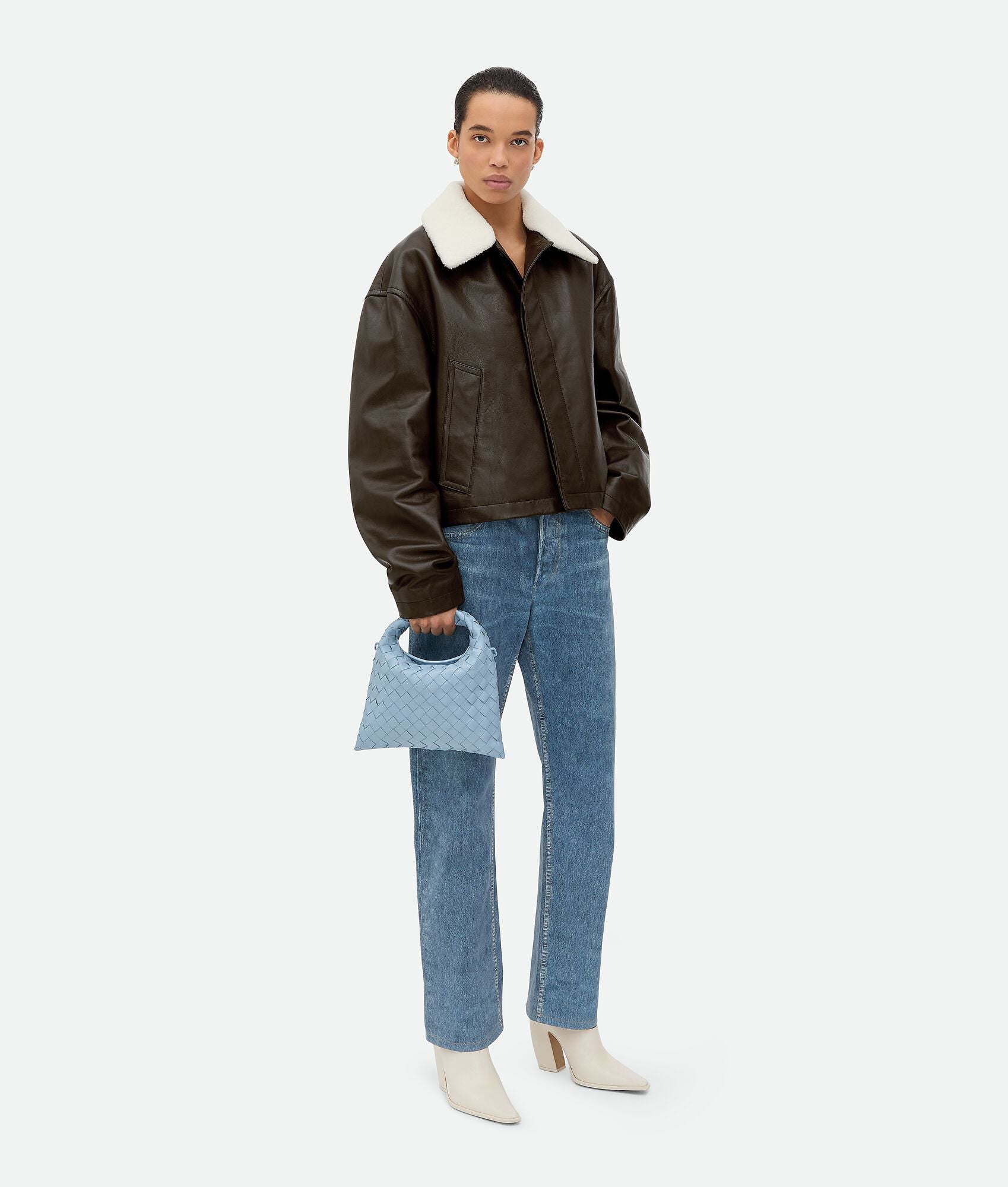 Mini Intrecciato leather crossbody bag. The latest to the Hop family, the new mini size has a detachable and adjustable cross-body long leather strap. A little tall and wider than the Mini Jodie, this is a great day to night option.