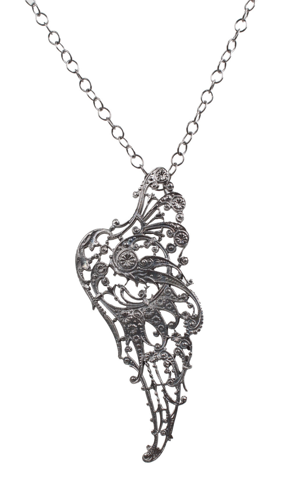 Anoxidized silver necklace with delicately worked lattice wing shape.